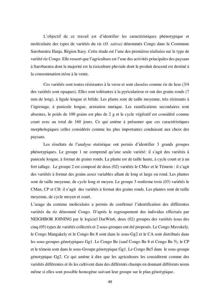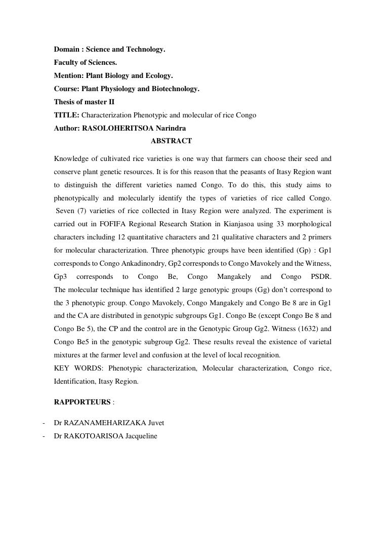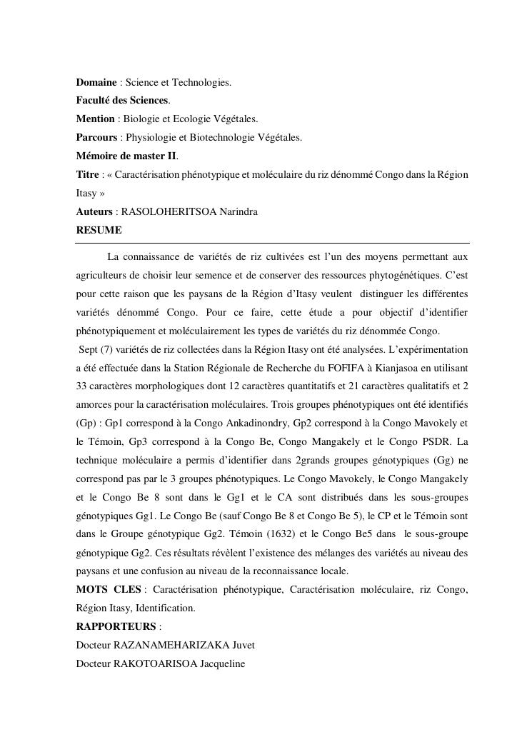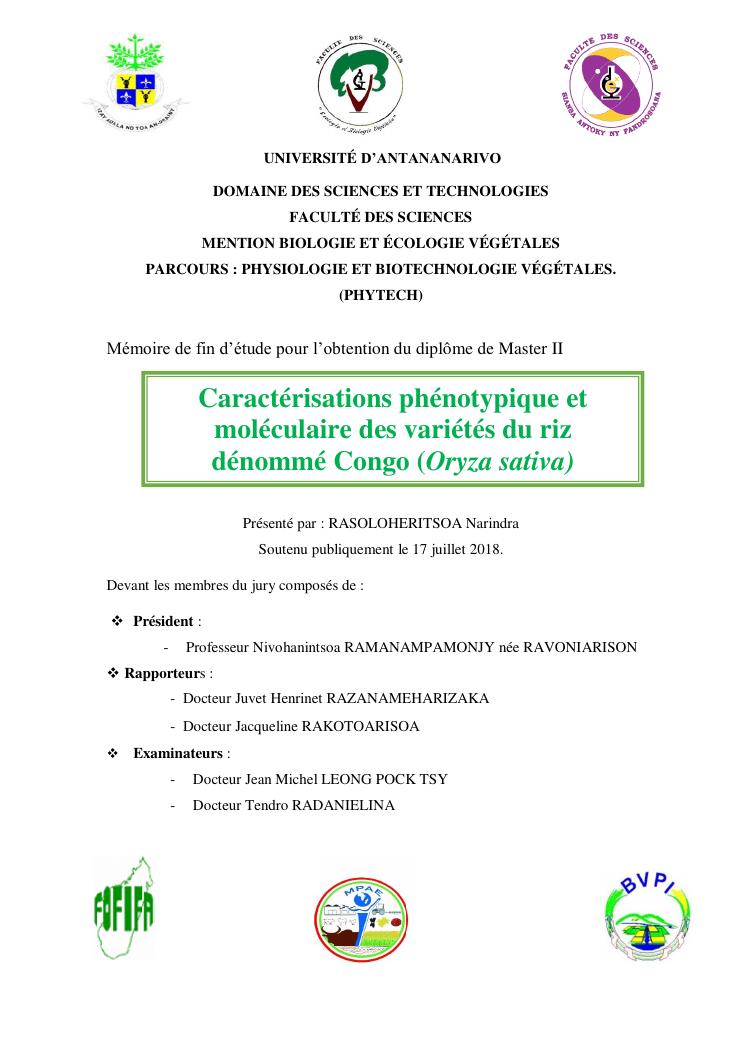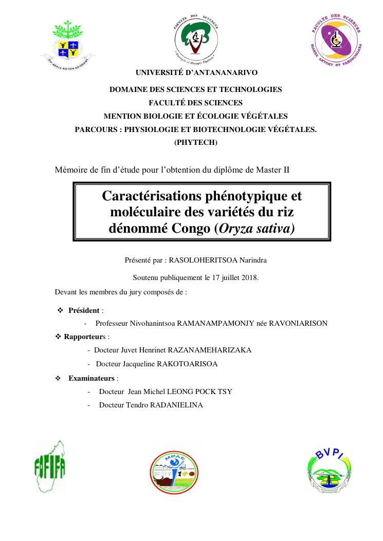 caractérisations phénotypique et moléculaire des variétés du riz dénommé congo (oryza sativa)