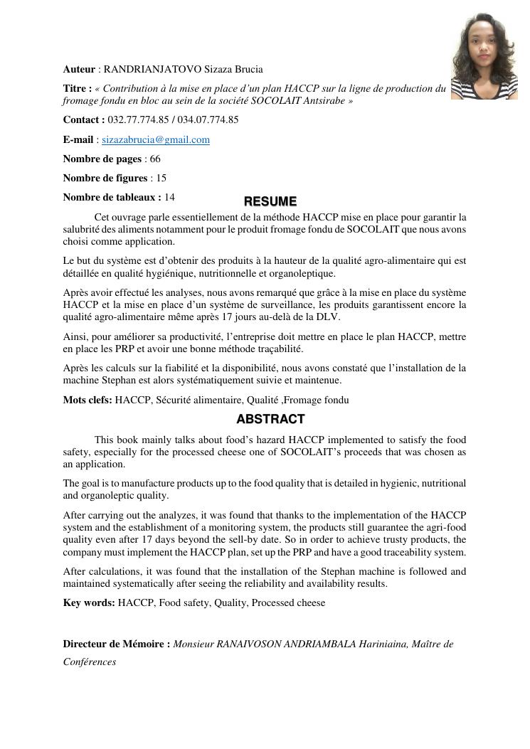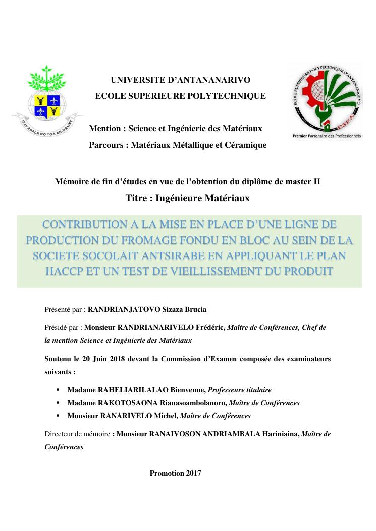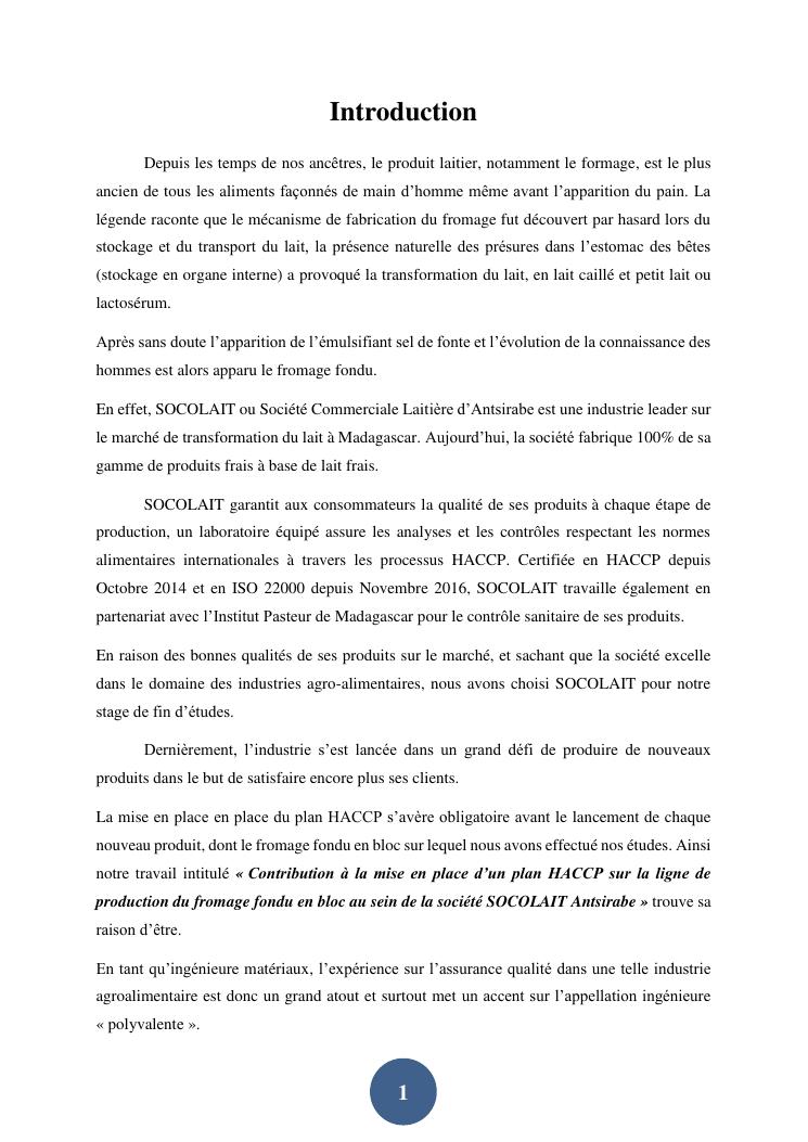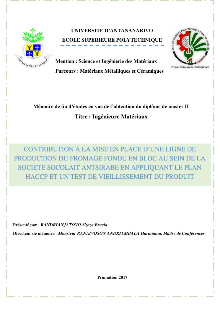 contribution à la mise en place d'un plan haccp sur la ligne de production du fromage fondu en bloc au sein de la société socolait antsirabe