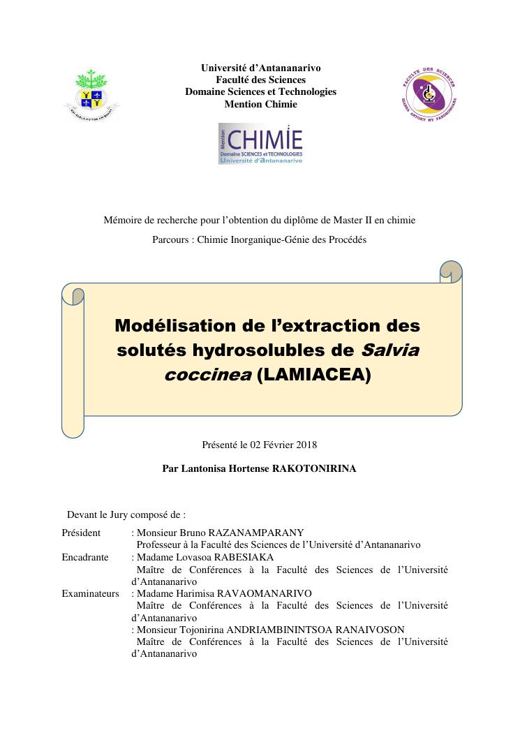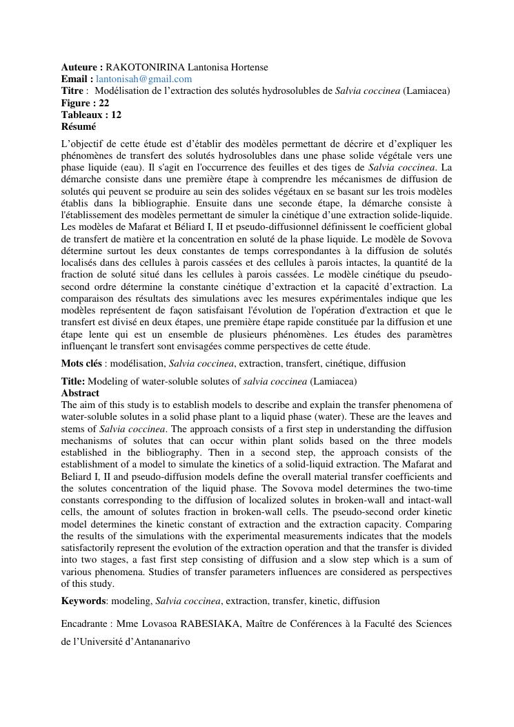 modélisation de l'extraction des solutés hydrosolubles de salvia coccinea (lamiacea)