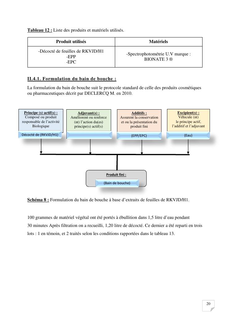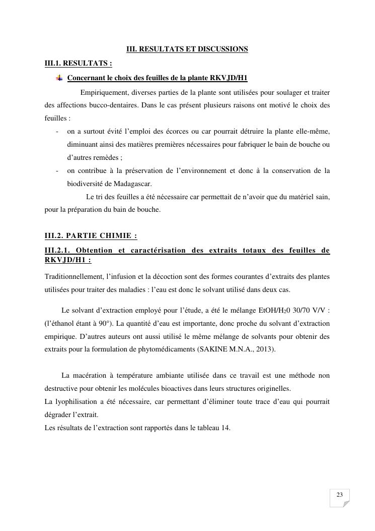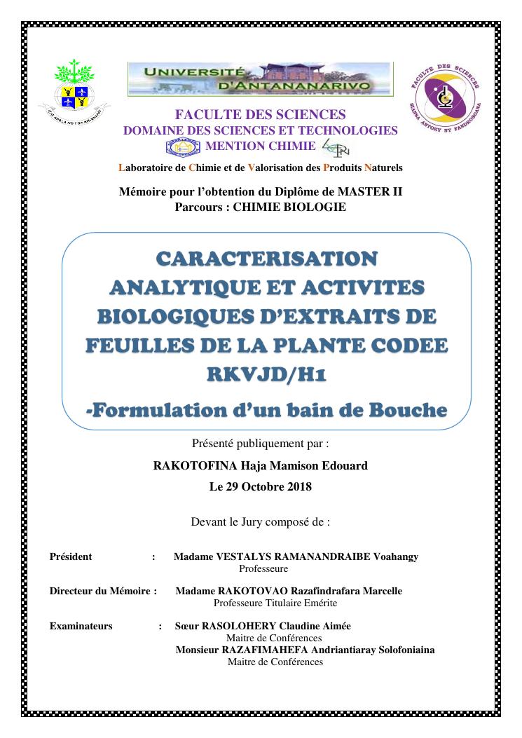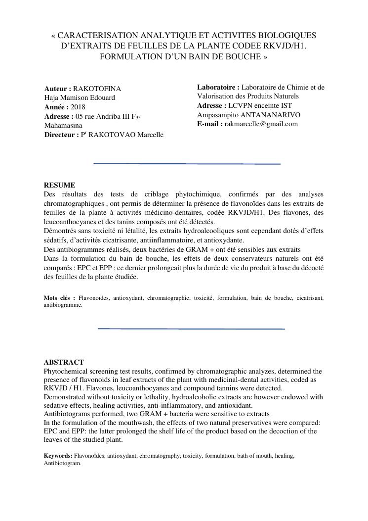 caracterisation analytique et activites biologiques d'extraits de feuilles de la plante codee rkvjd/h1. formulation d'un bain de bouche