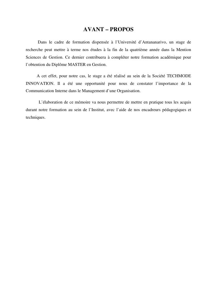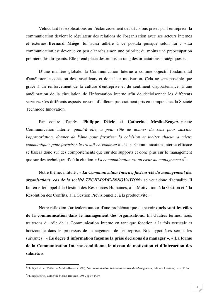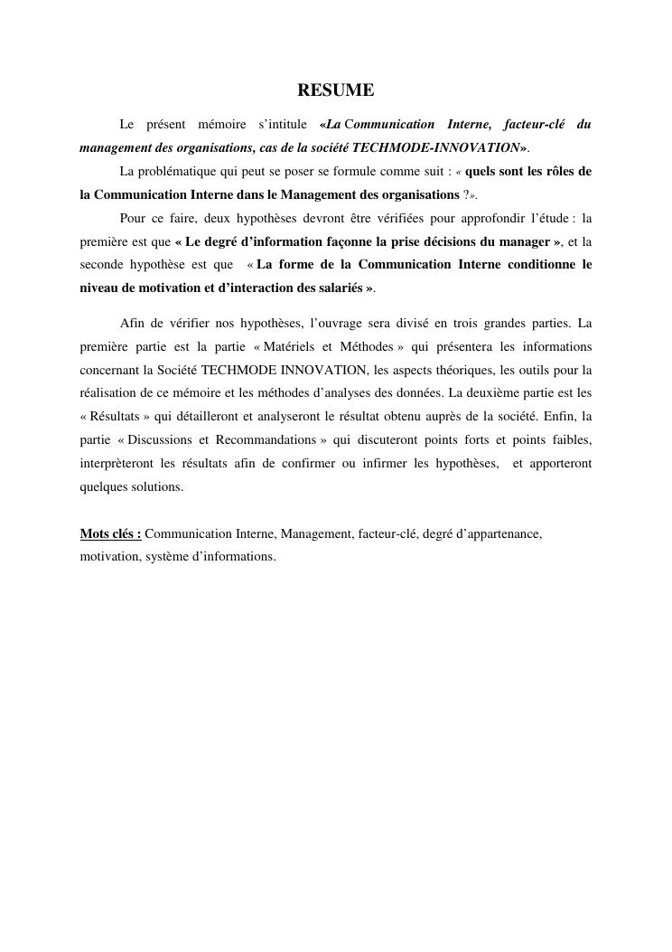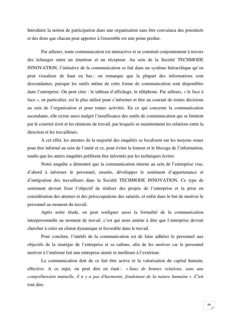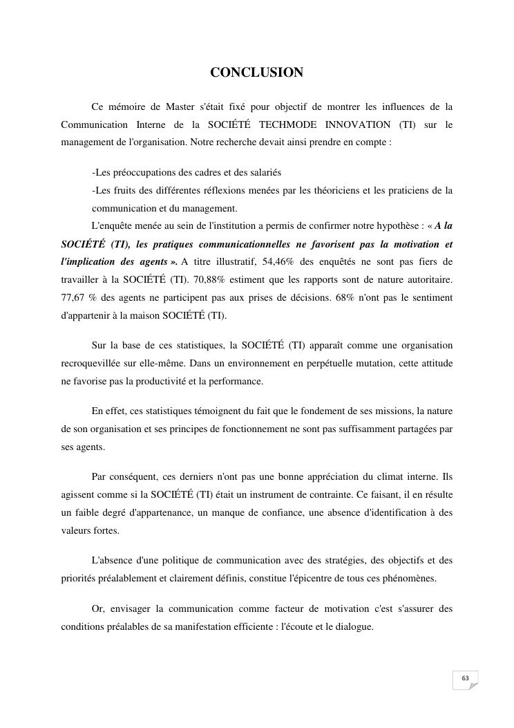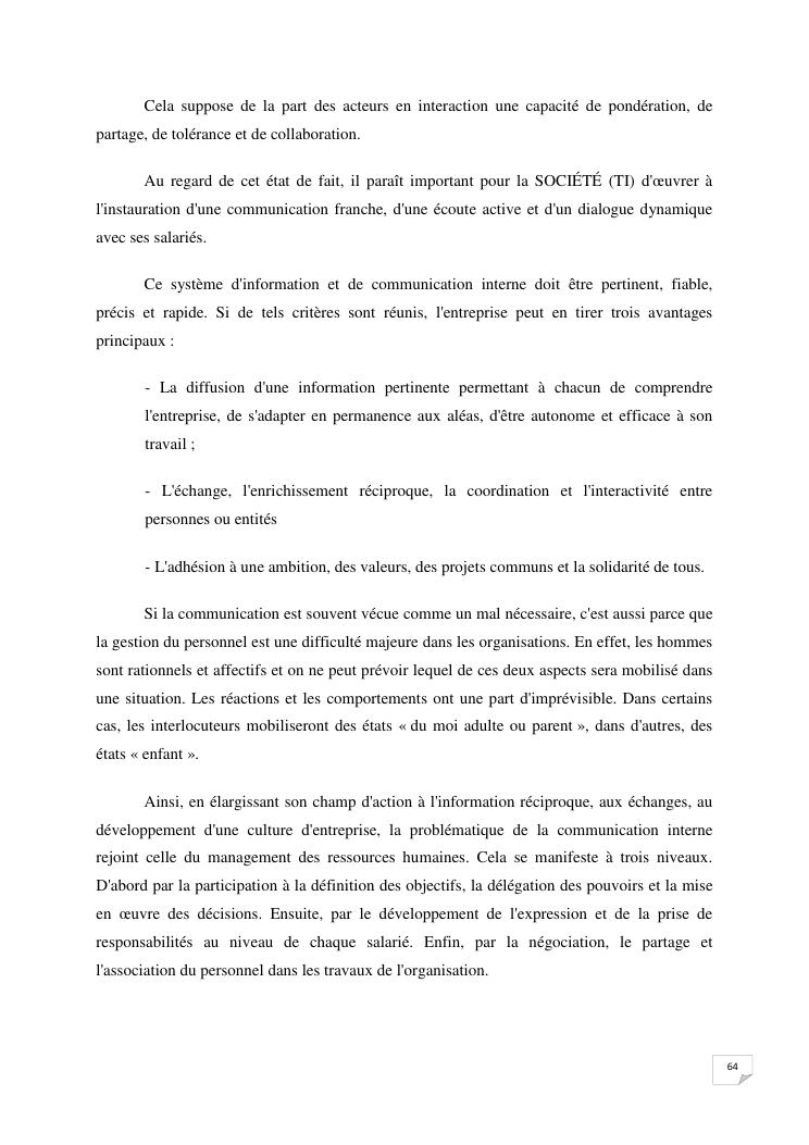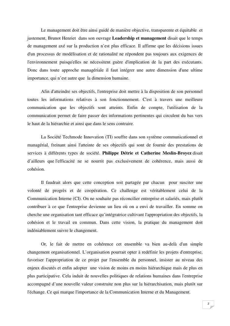 la communication interne, facteur-cle du management des organisations : cas de la societe techmode innovation