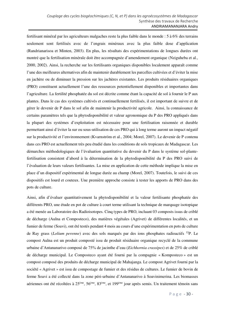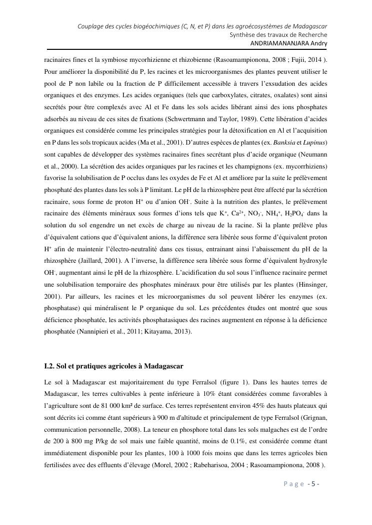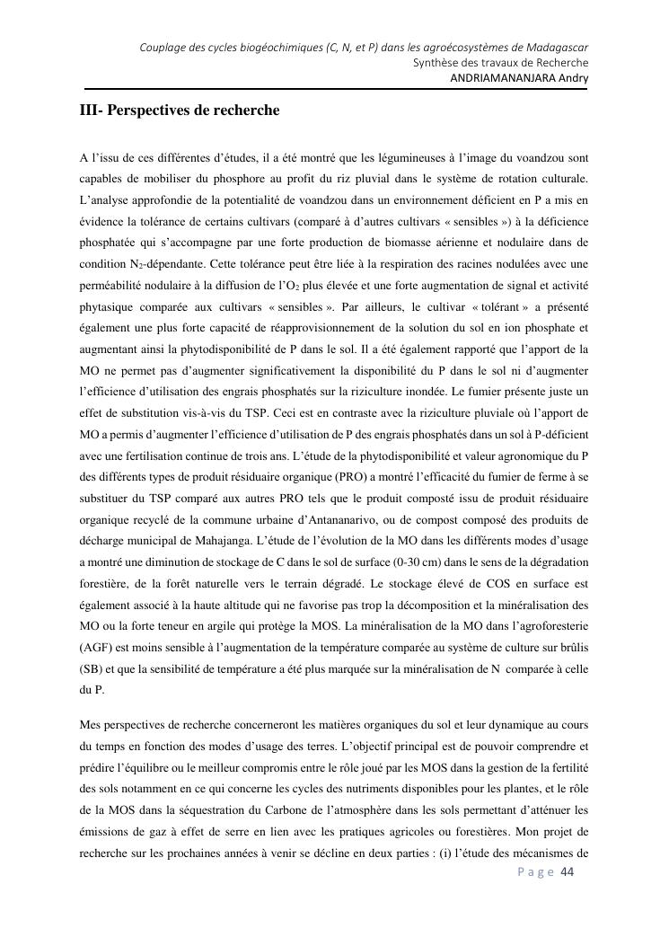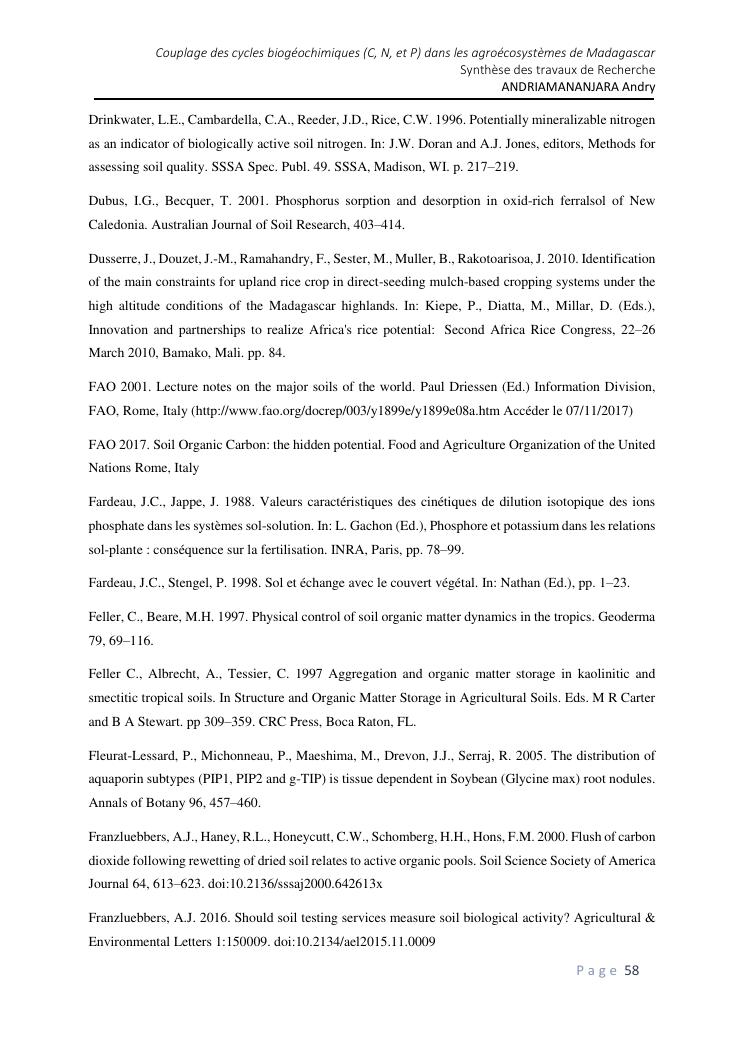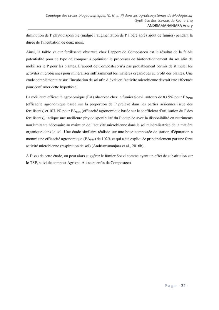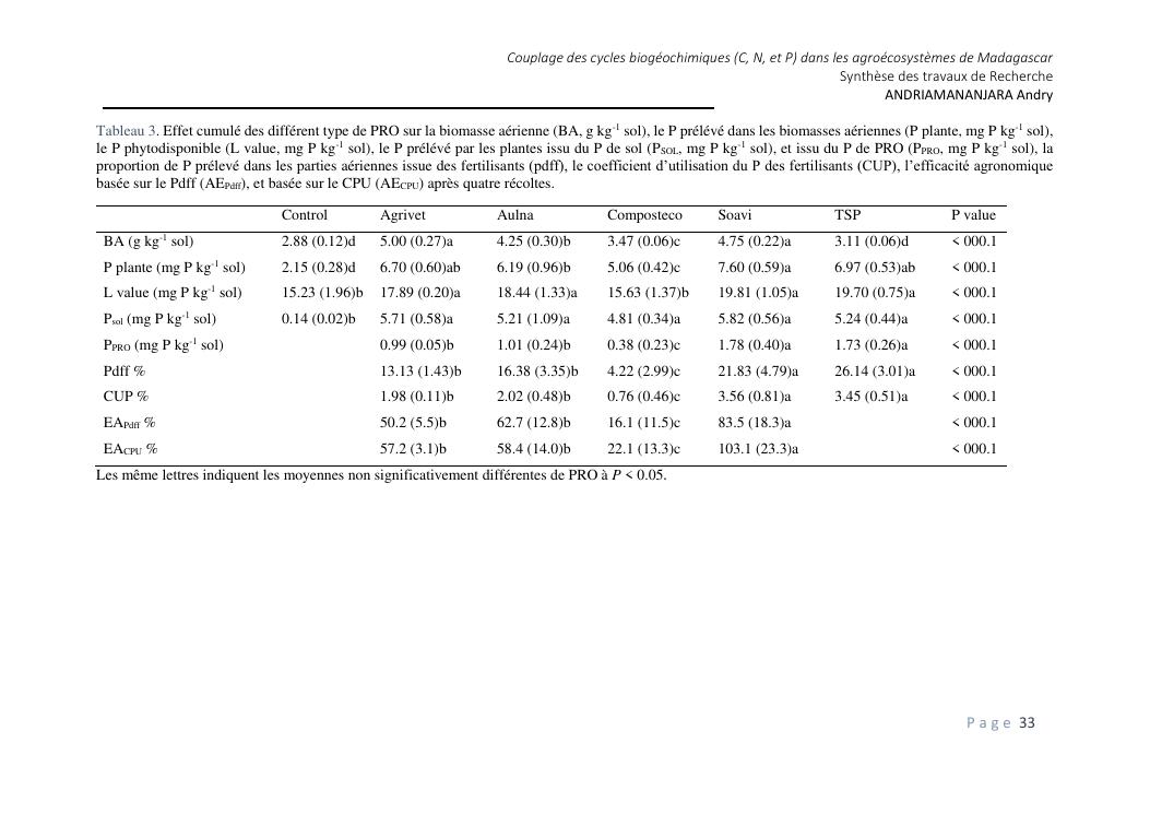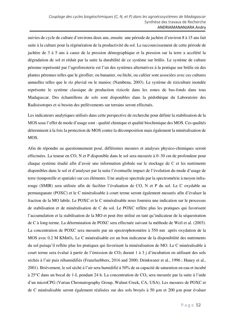 couplage des cycles biogeochimiques (carbone, azote et phosphore) dans les agroecosystemes de madagascar. document 1 : synthèses des résultats des travaux de recherches