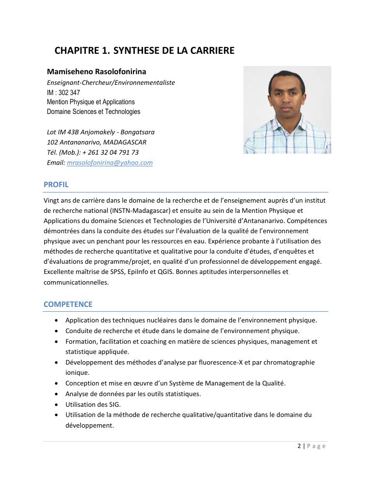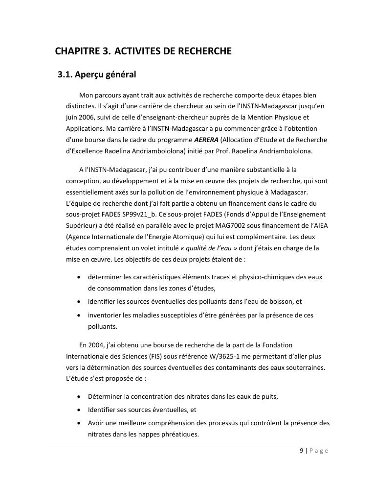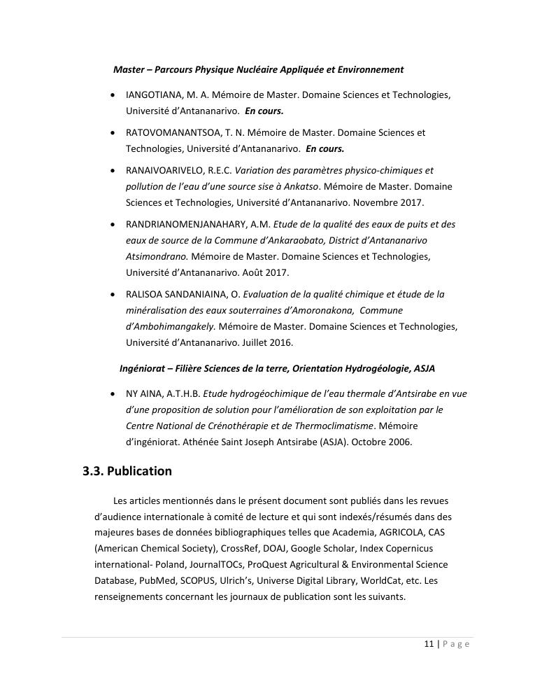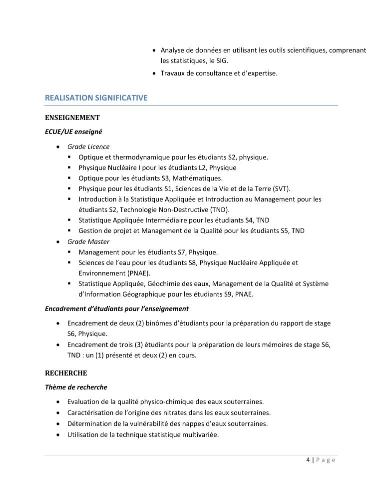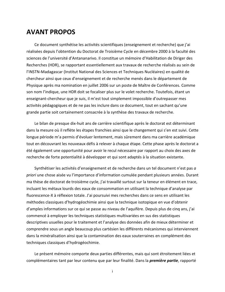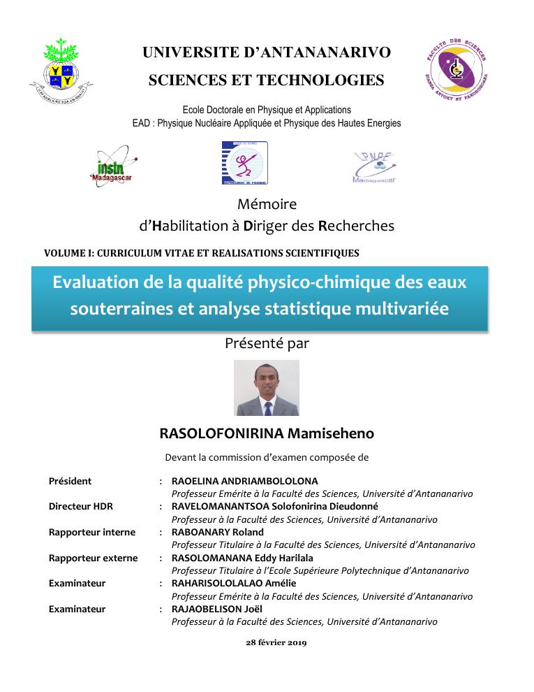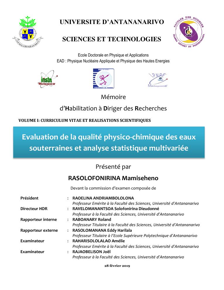 evaluation de la qualité physico-chimique des eaux souterraines et analyse statistique multivariée. volume i: curriculum vitae et realisations scientifiques
