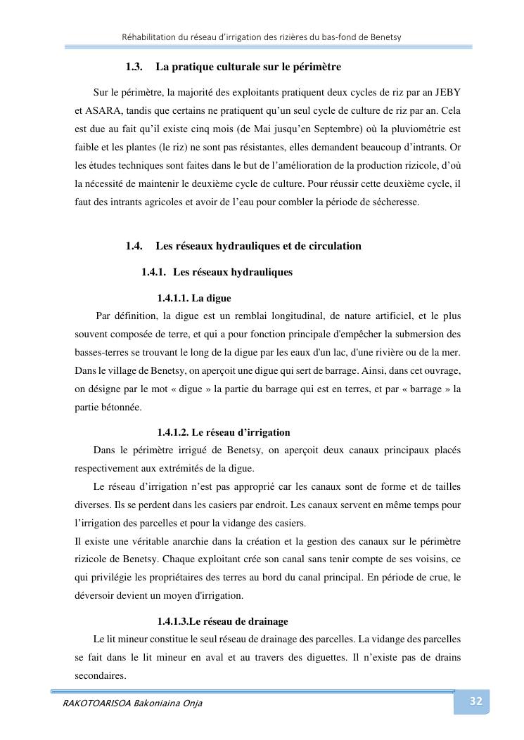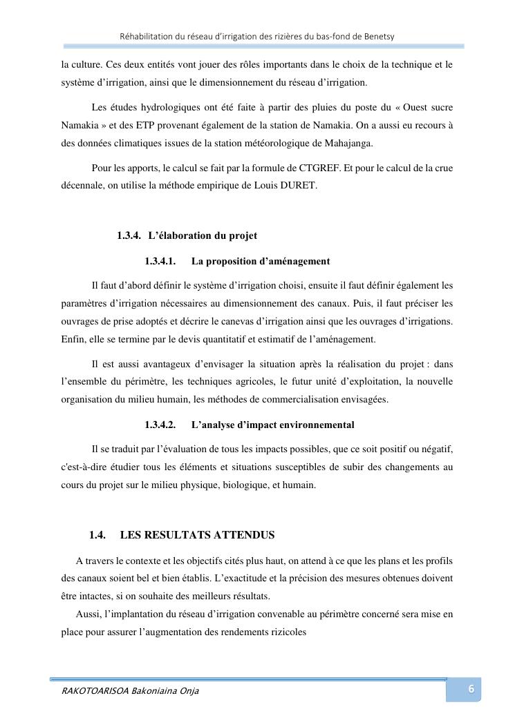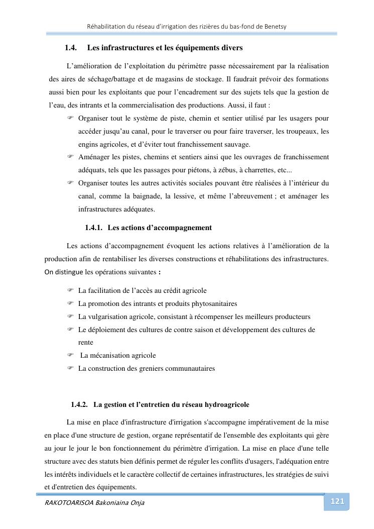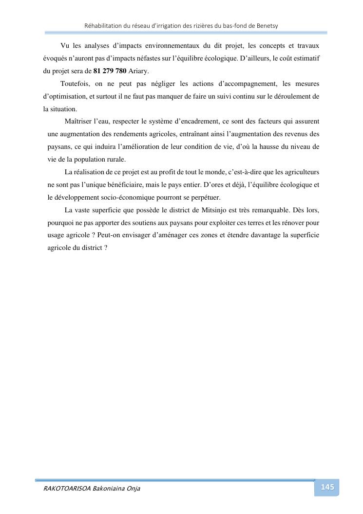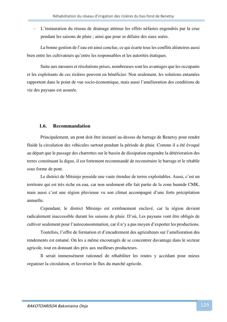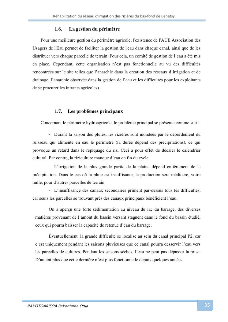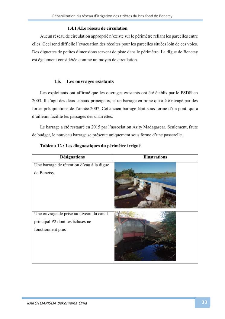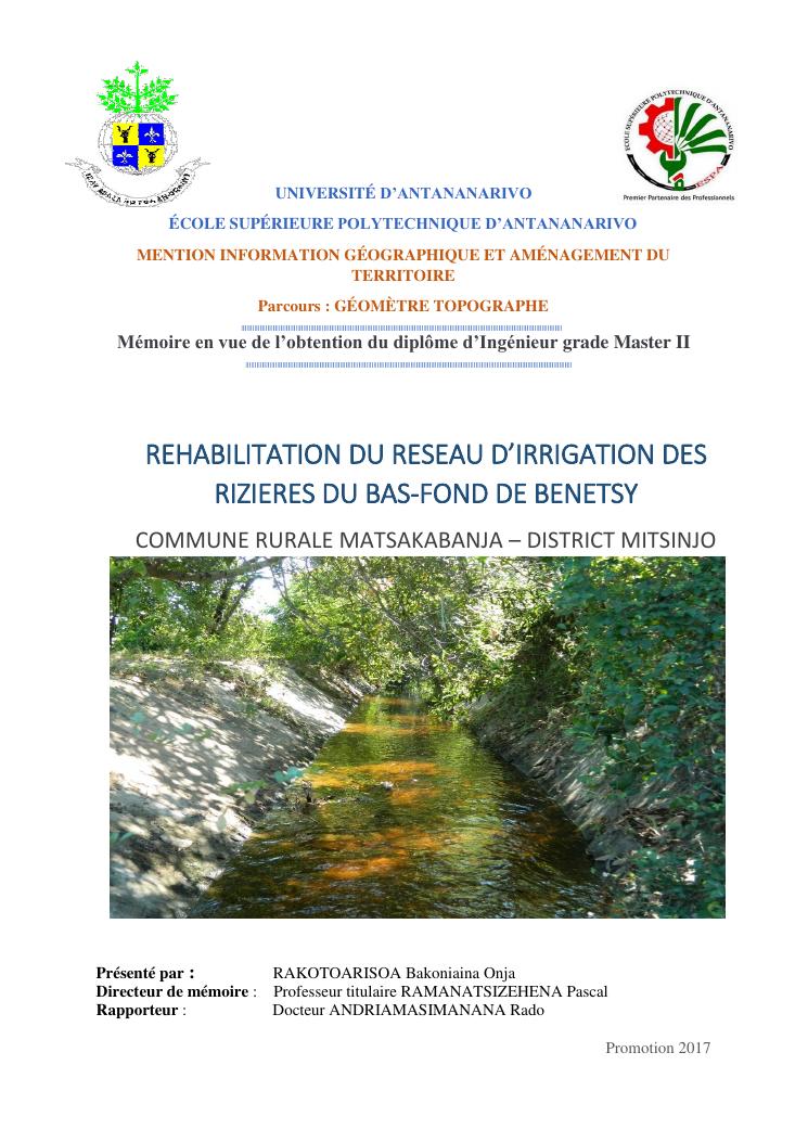 rehabilitation du reseau d'irrigation des rizieres du bas-fond de benetsy commune rurale matsakabanja district mitsinjo