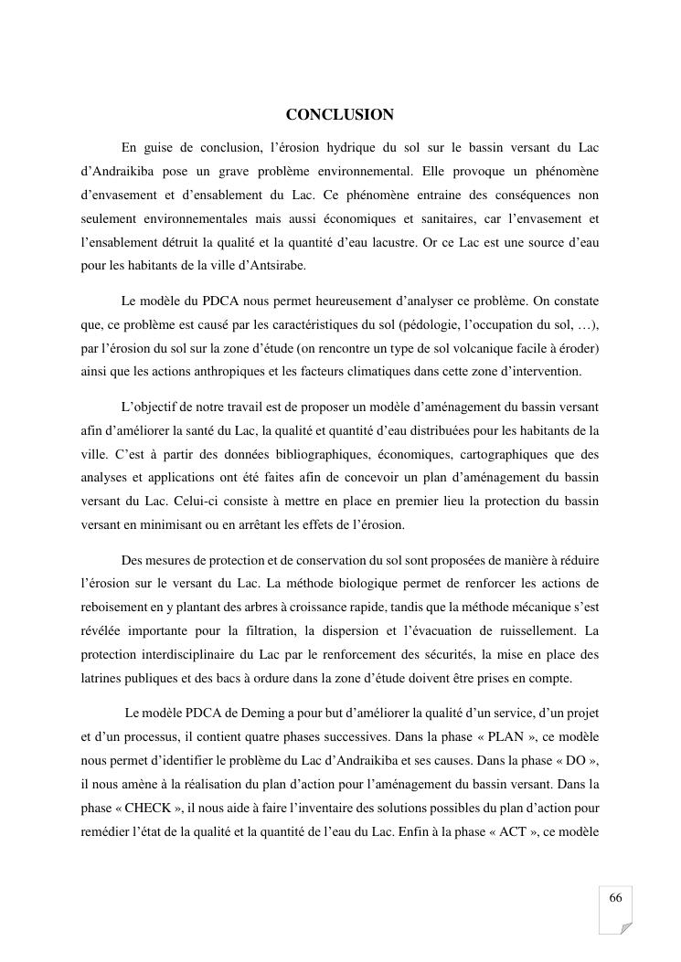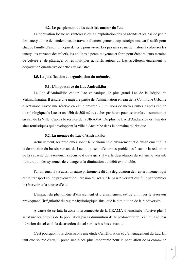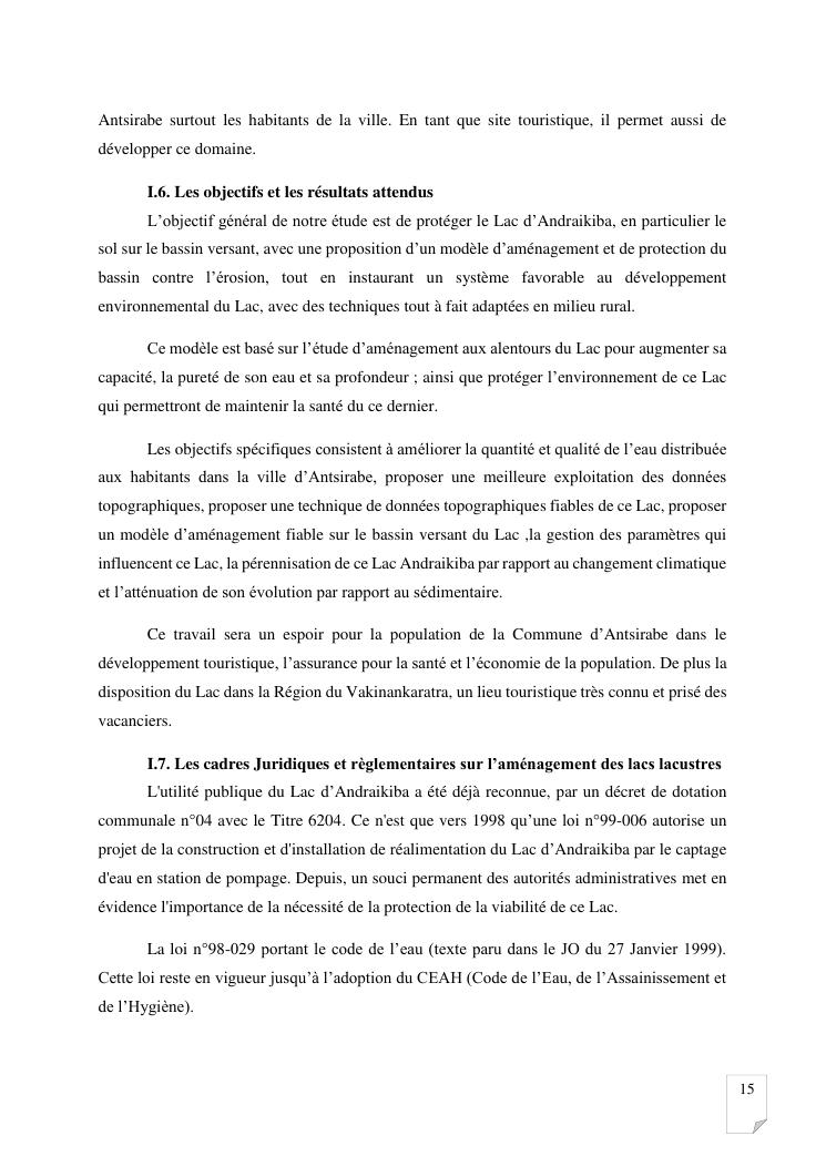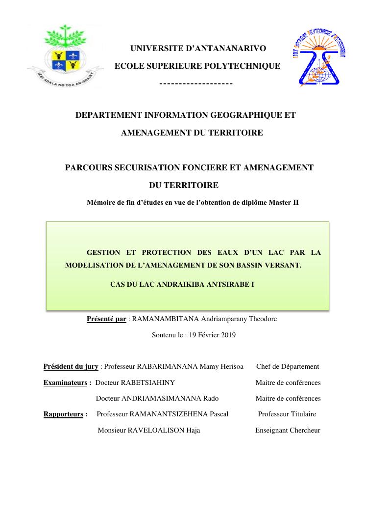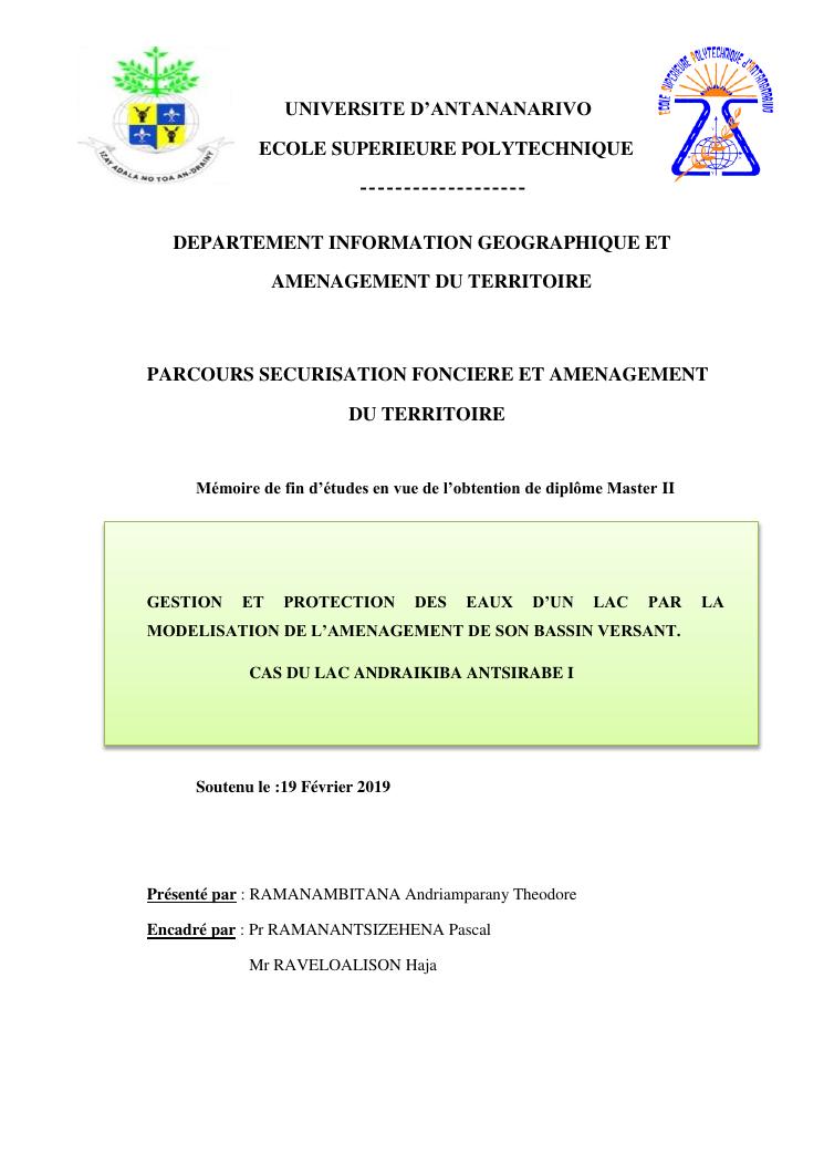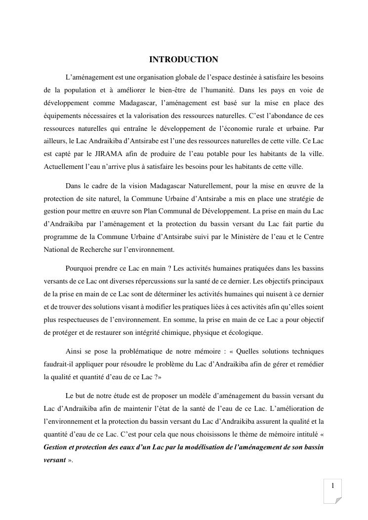 gestion et protection des eaux d'un lac par la modelisation de l'amenagement de son bassin versant. cas du lac andraikiba antsirabe i