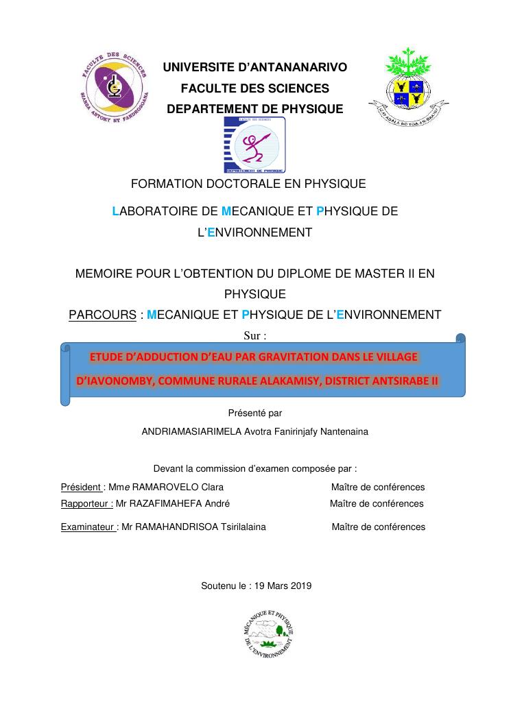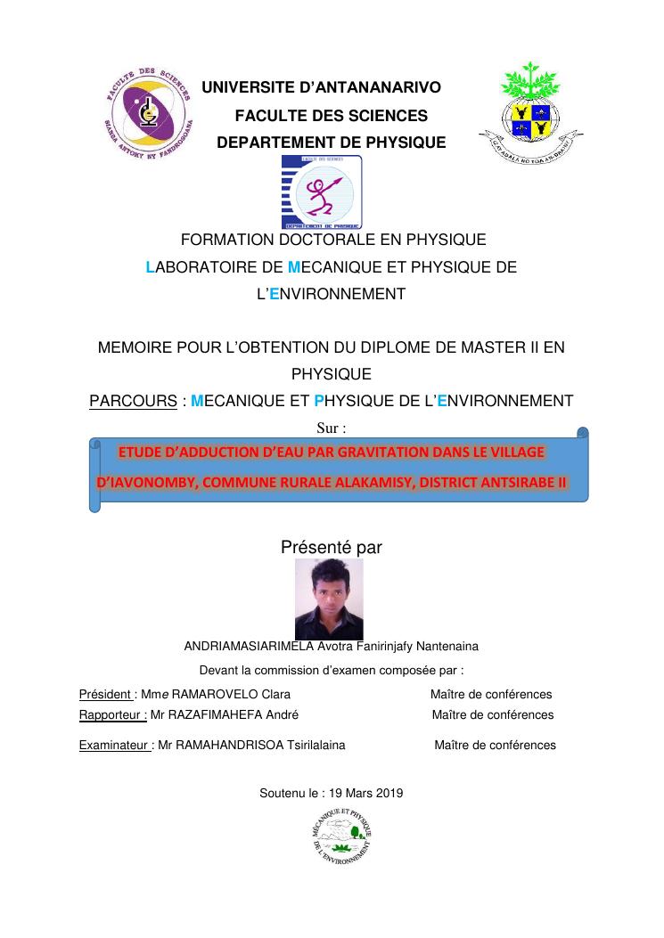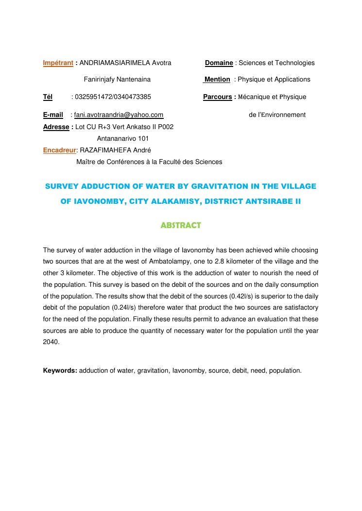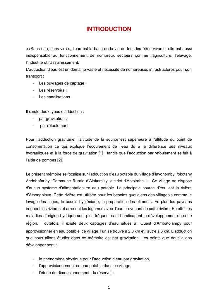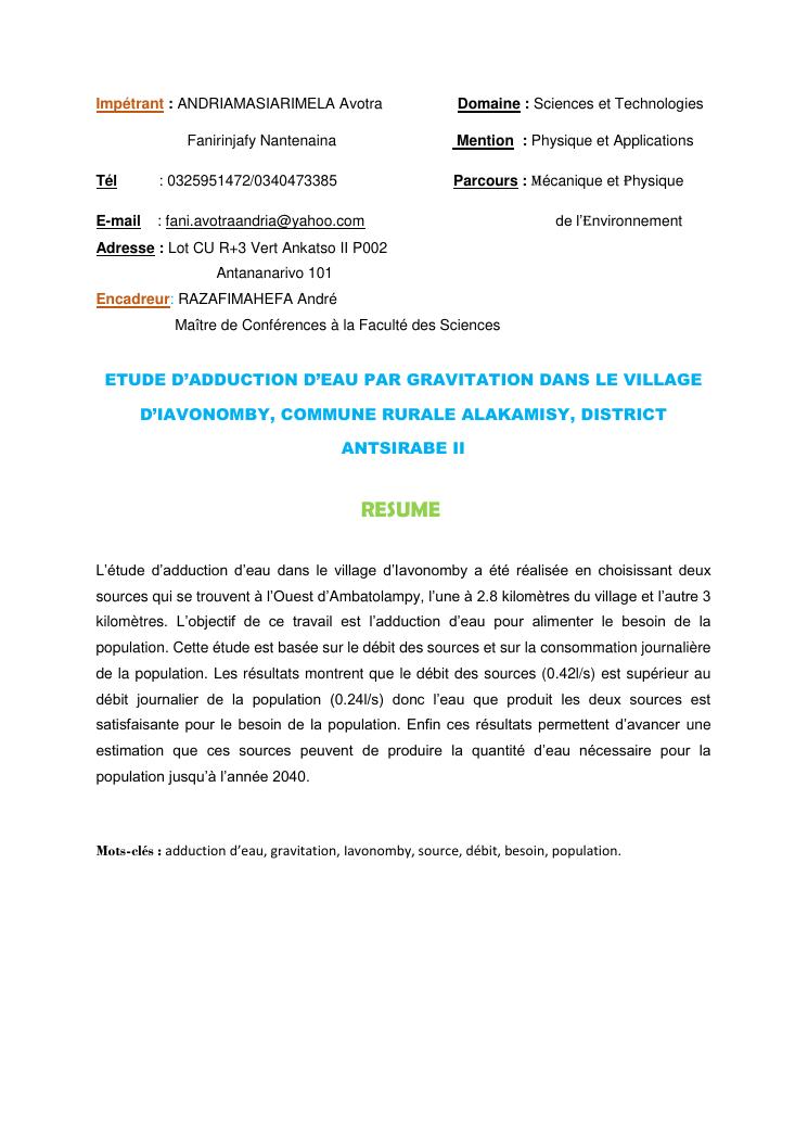 etude d'adduction d'eau par gravitation dans le village d'iavonomby, commune rurale alakamisy, district antsirabe ii