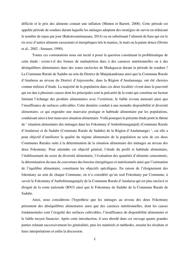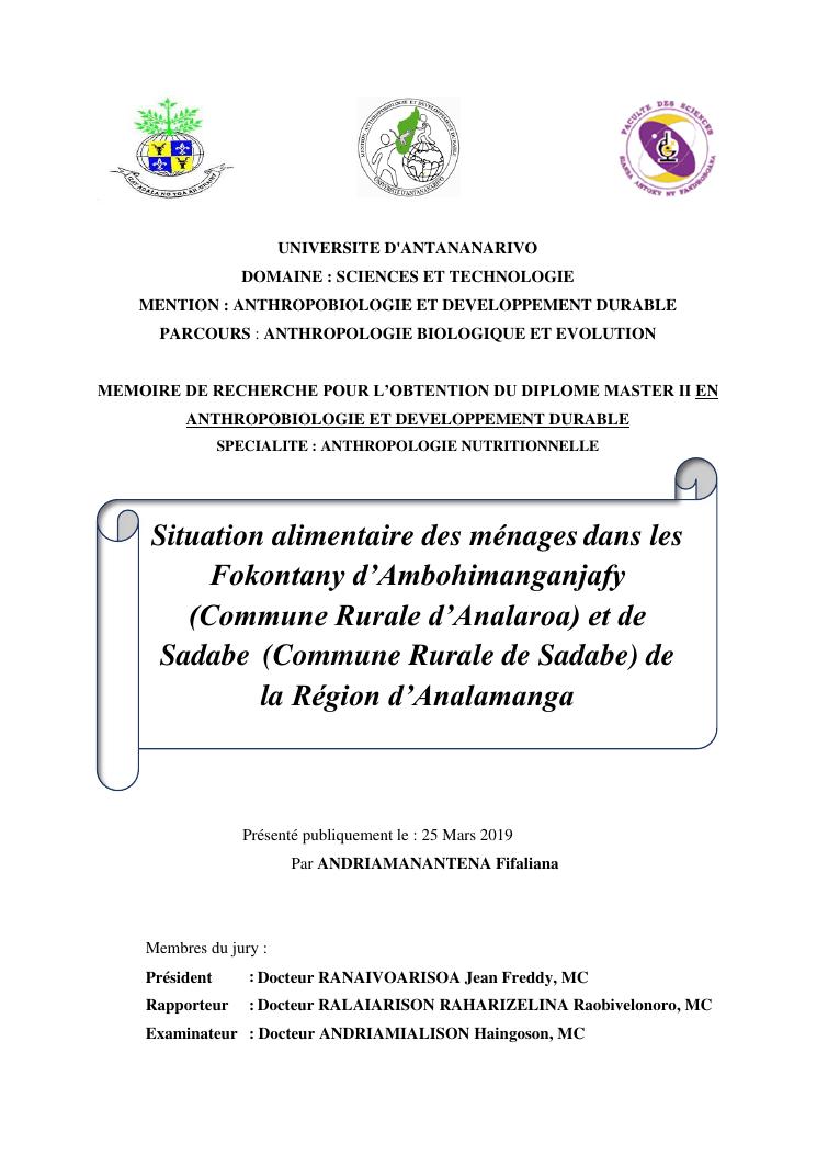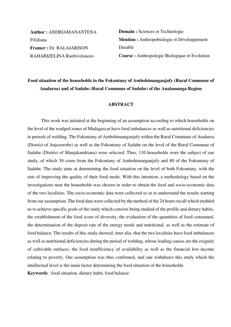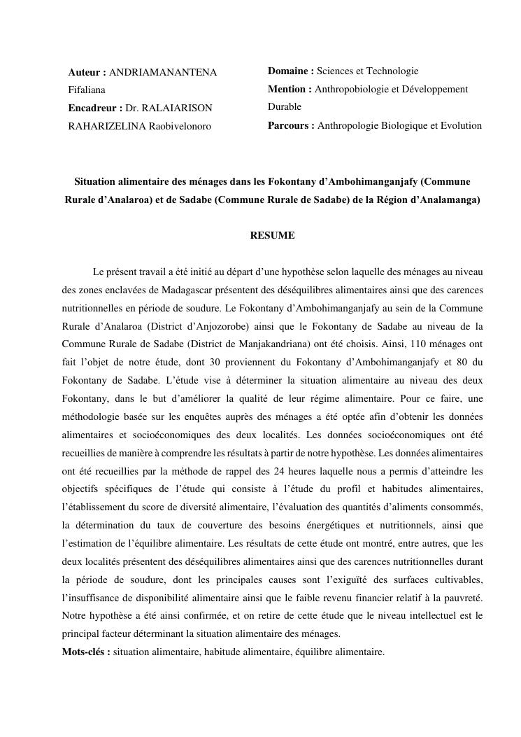 situation alimentaire des ménages dans les fokontany d'ambohimanganjafy (commune rurale d'analaroa) et de sadabe (commune rurale de sadabe) de la région d'analamanga