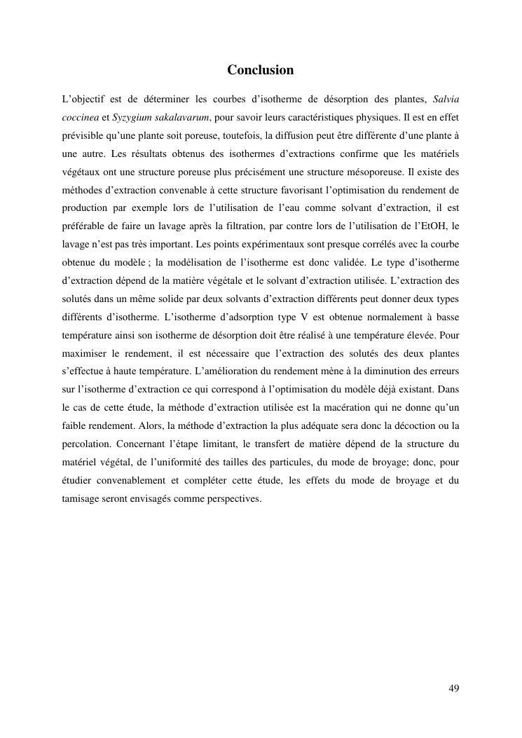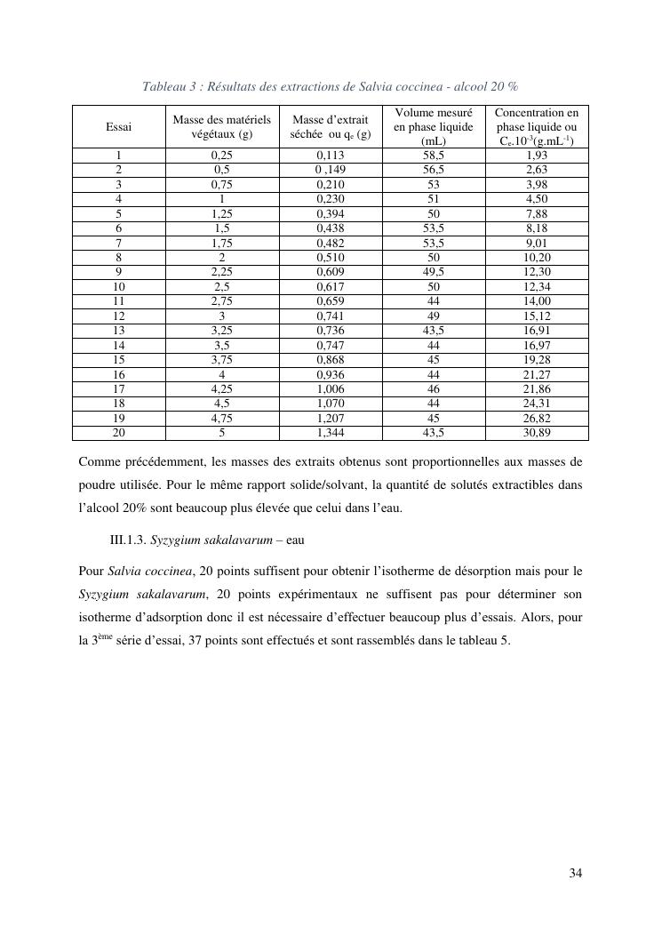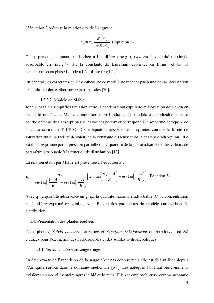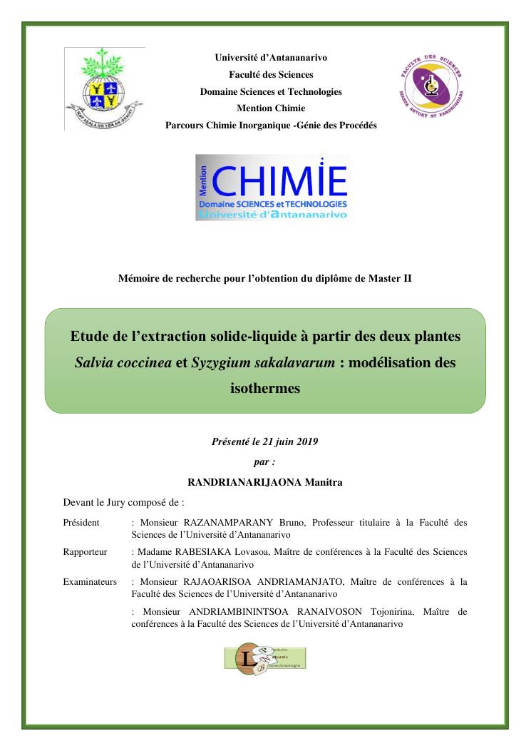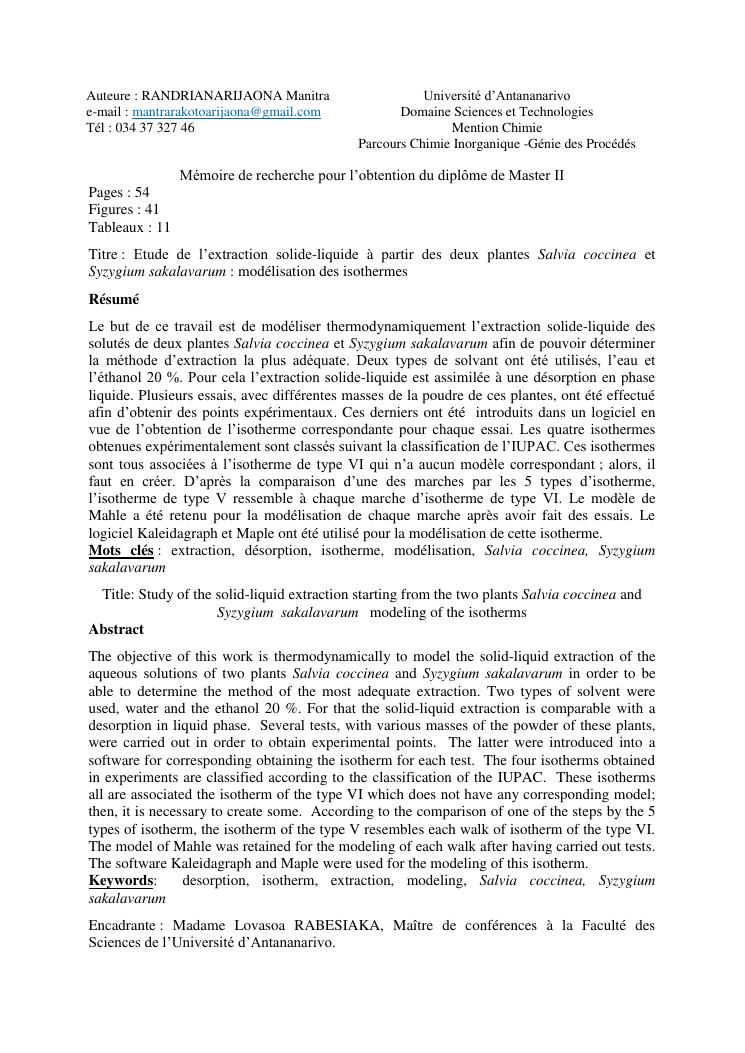 etude de l'extraction solide-liquide à partir des deux plantes salvia coccinea et syzygium sakalavarum : modélisation des isothermes