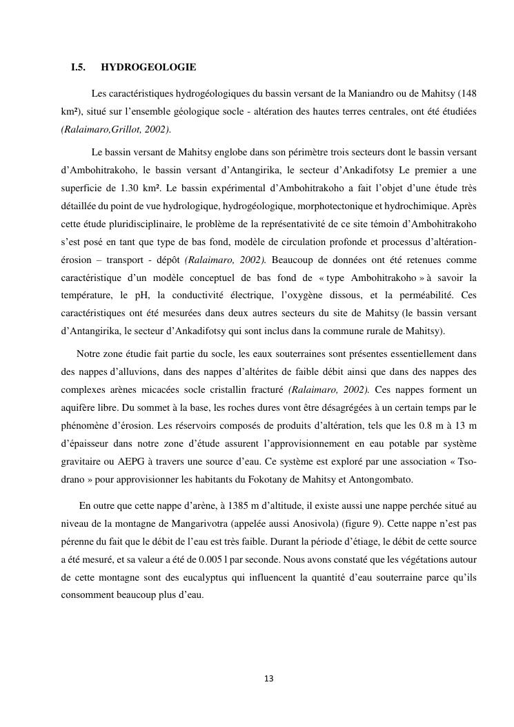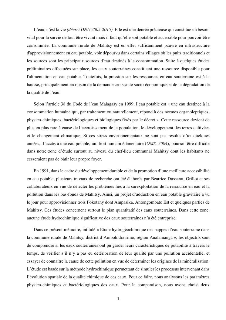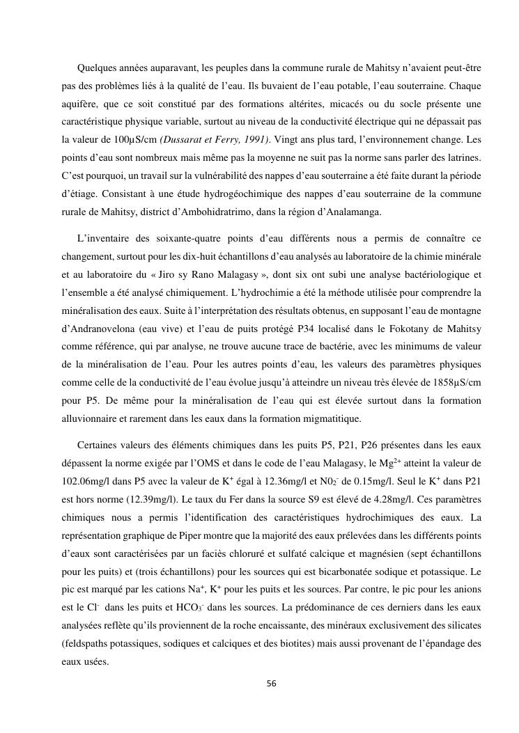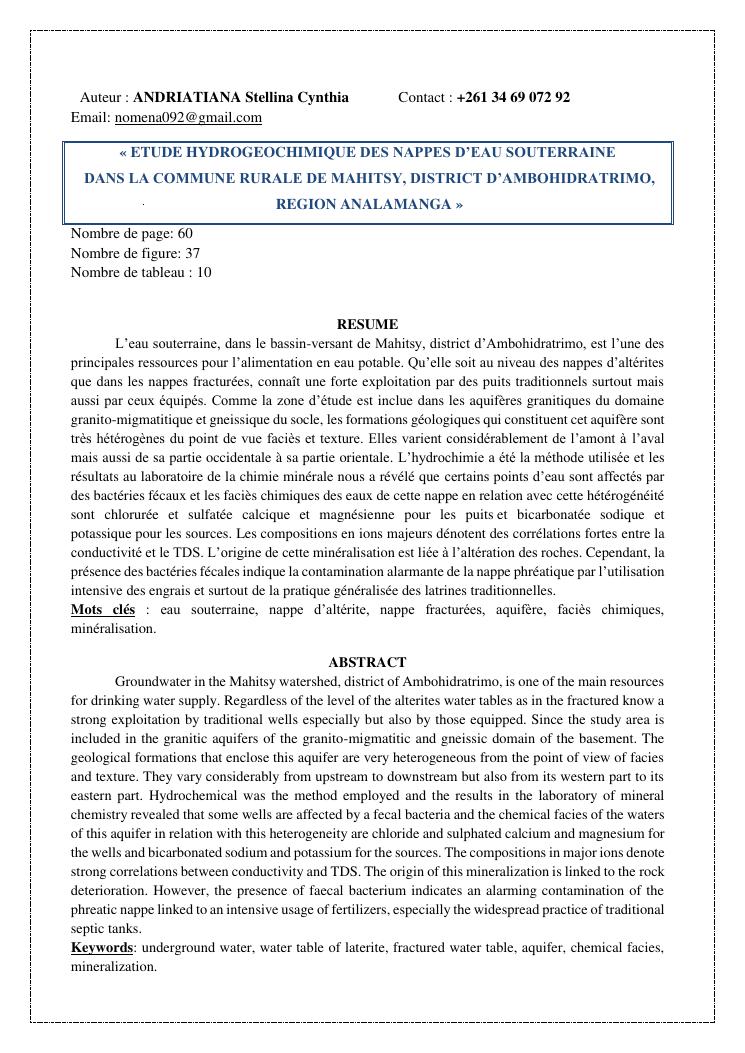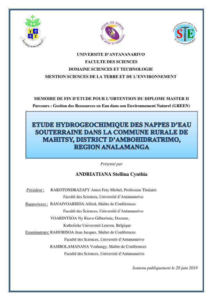 etude hydrogeochimique des nappes d'eau souterraine dans la commune rurale de mahitsy, district d'ambohidratrimo, region analamanga
