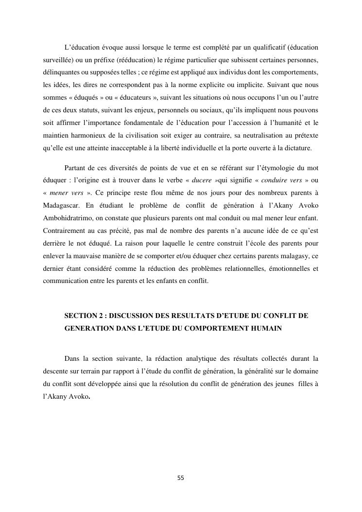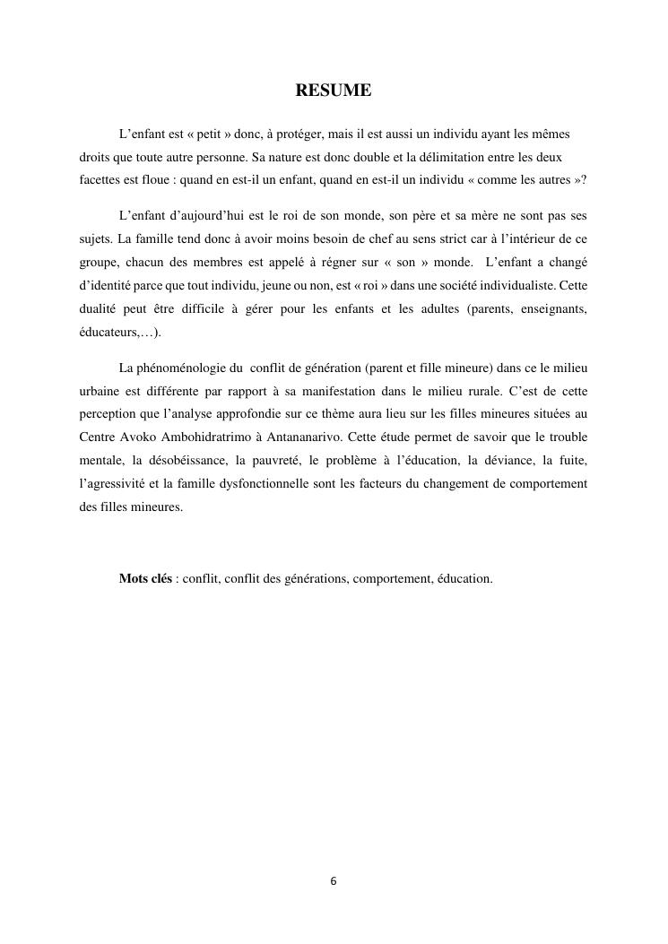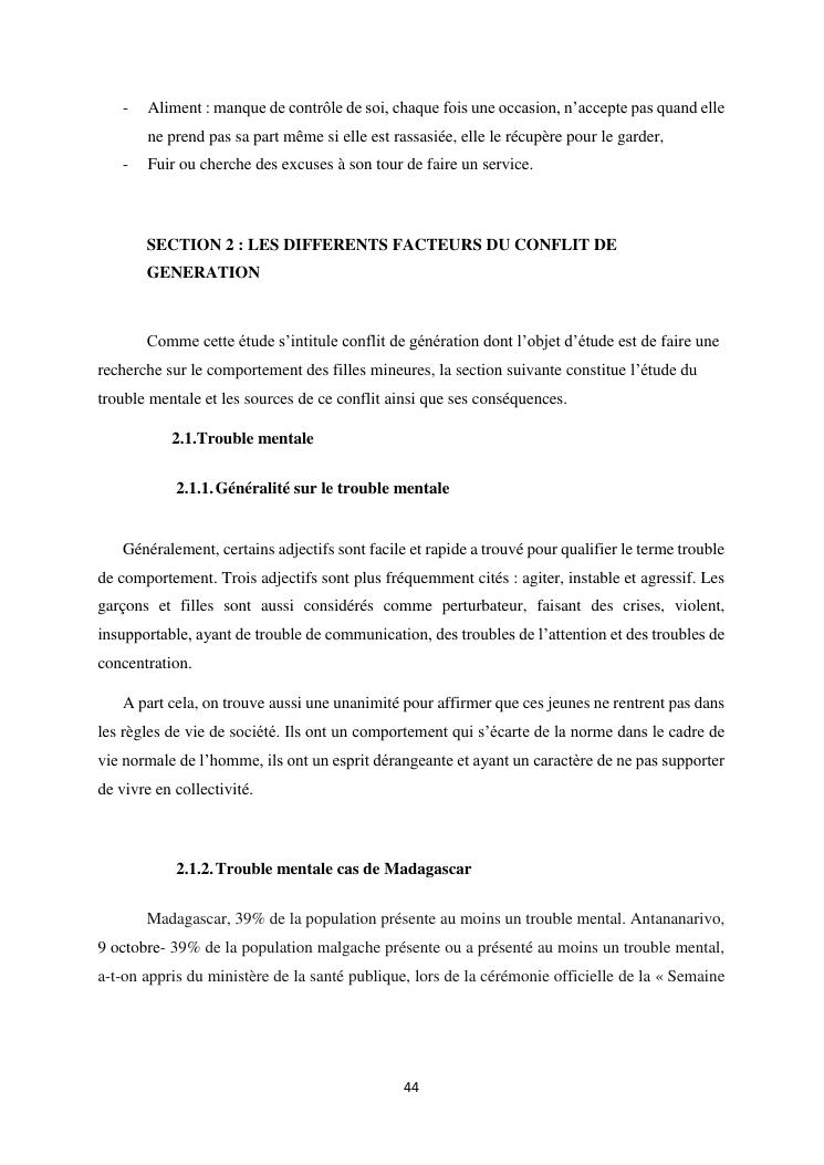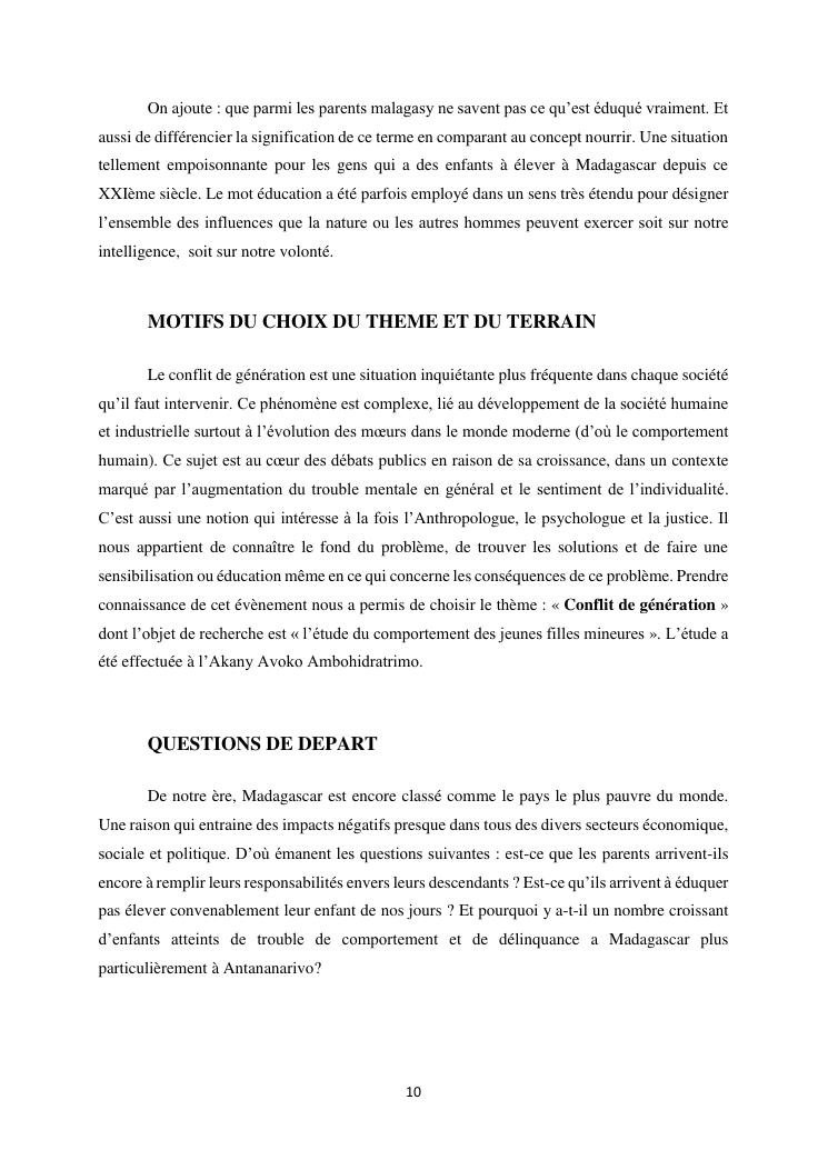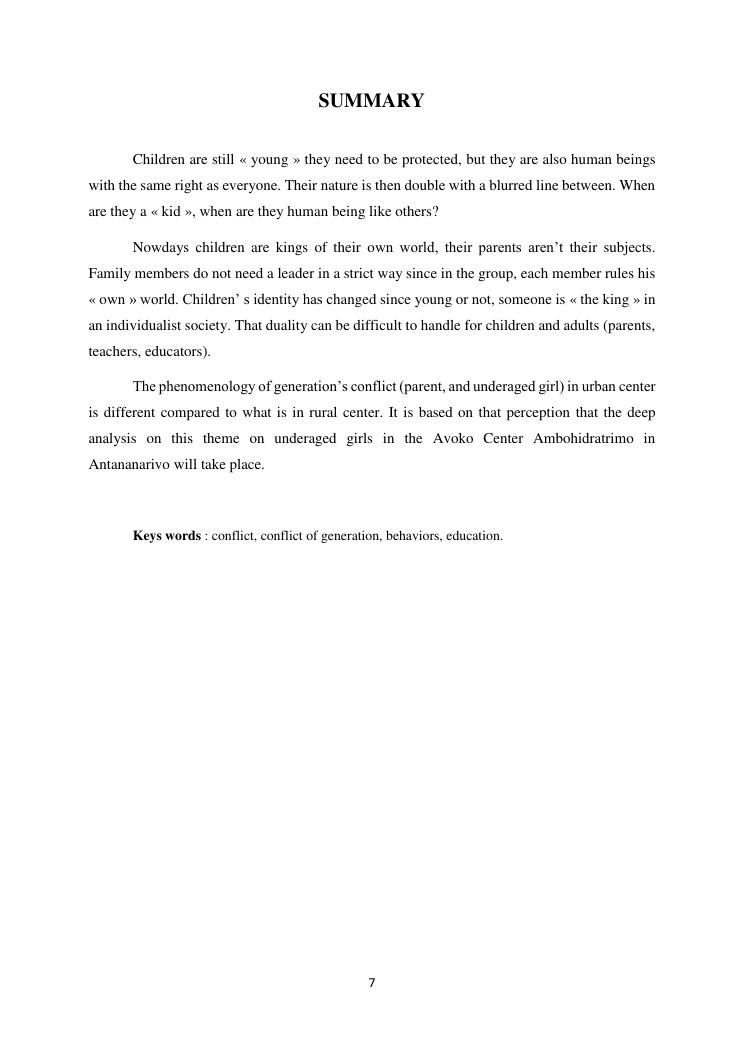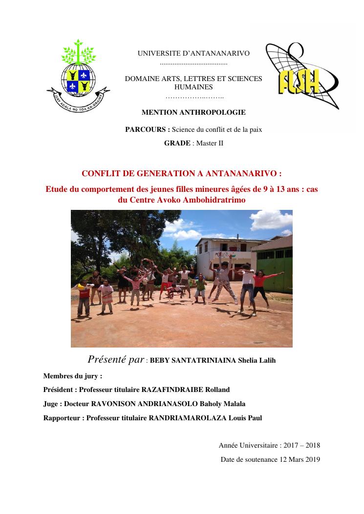 conflit de generation a antananarivo : etude du comportement des jeunes filles mineures âgées de 9 à 13 ans : cas du centre avoko ambohidratrimo