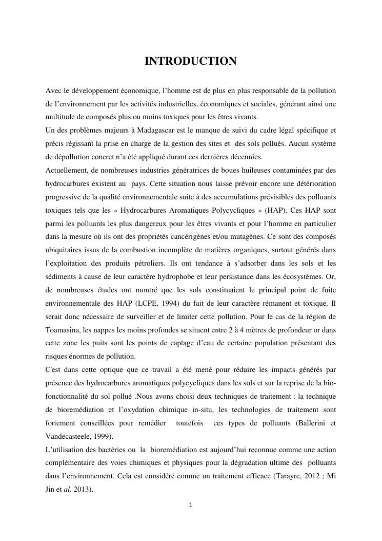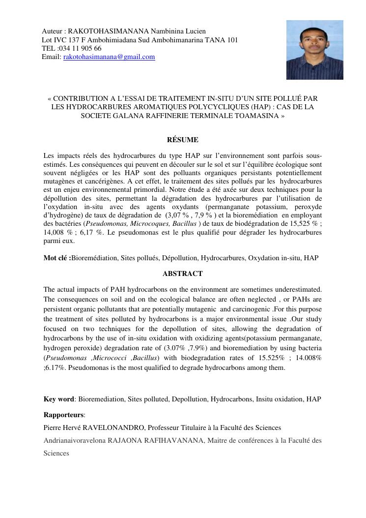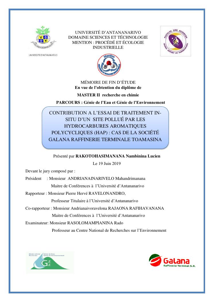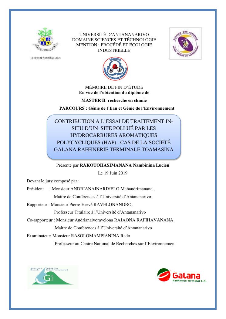 contribution a l'essai de traitement insitu d'un site pollué par les hydrocarbures aromatiques polycycliques (hap) : cas de la société galana raffinerie terminale toamasina