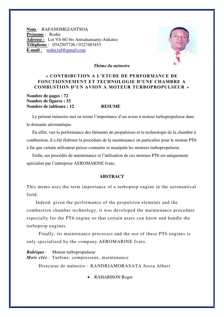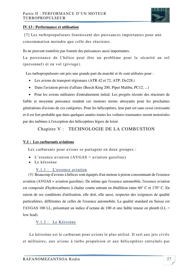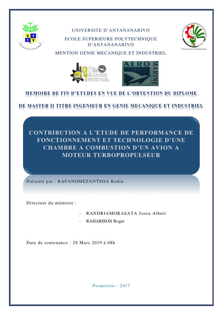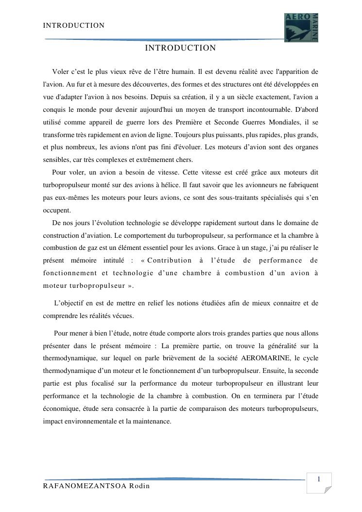 contribution a l'etude de performance de fonctionnement et technologie d'une chambre a combustion d'un avion a moteur turbopropulseur