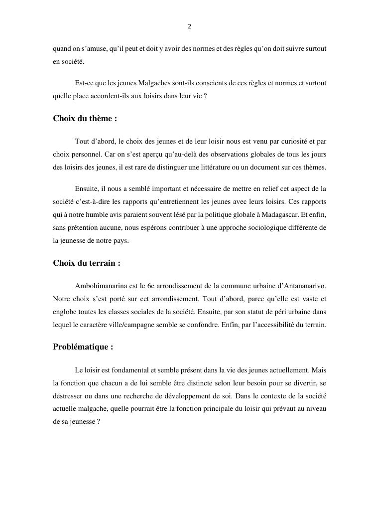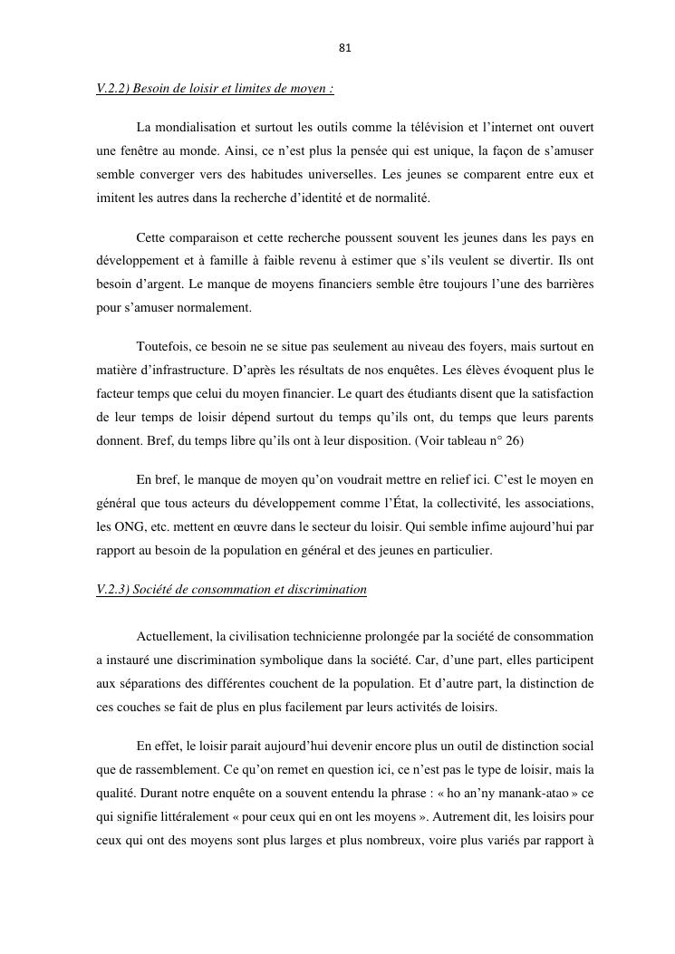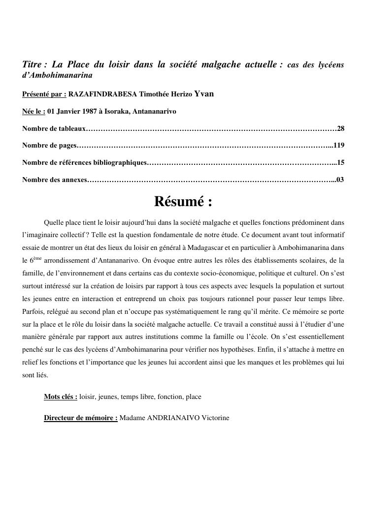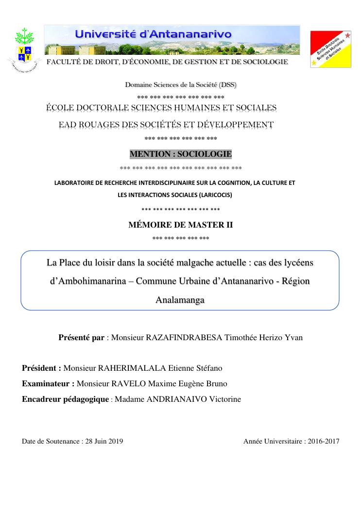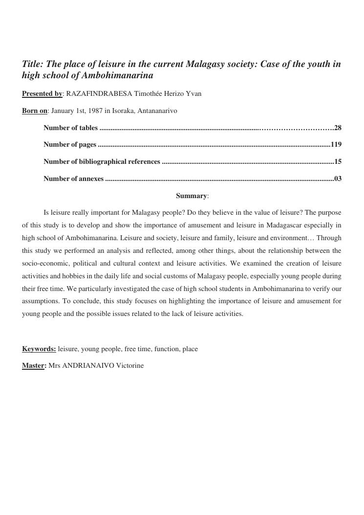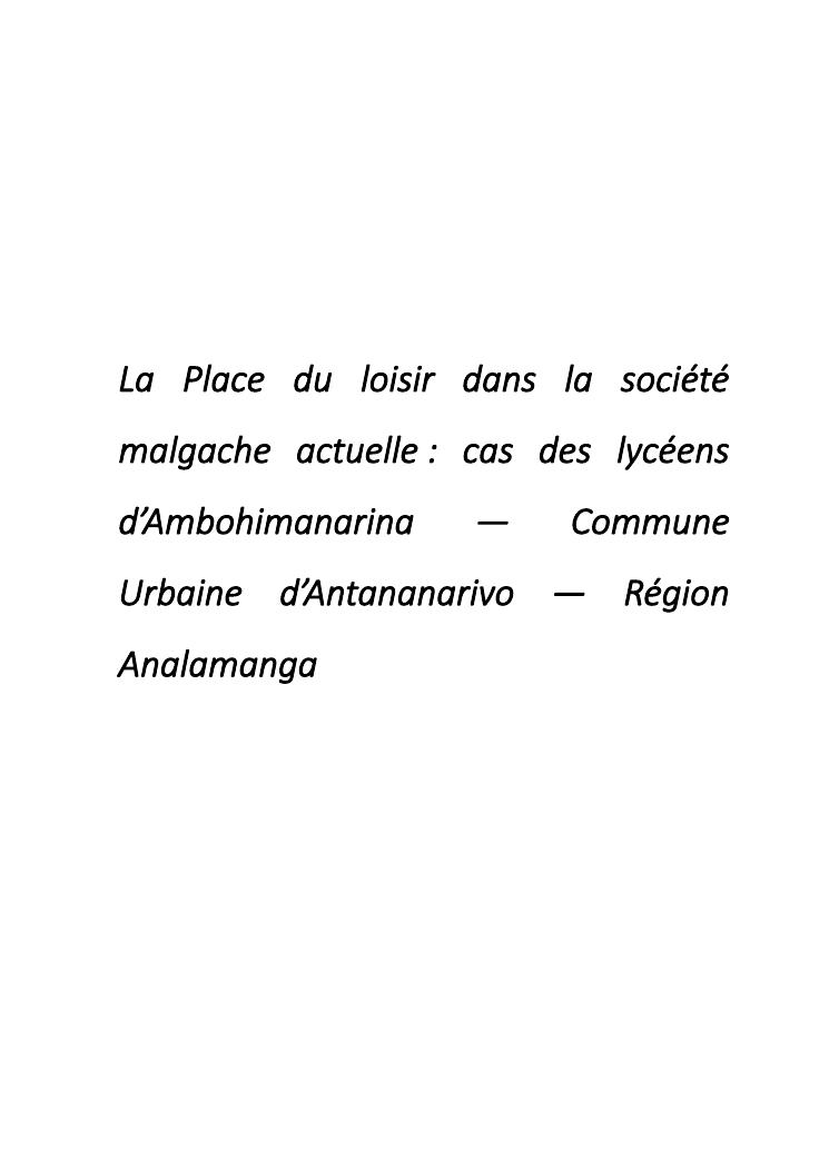 la place du loisir dans la société malgache actuelle : cas des lycéens d'ambohimanarina commune urbaine d'antananarivo région analamanga