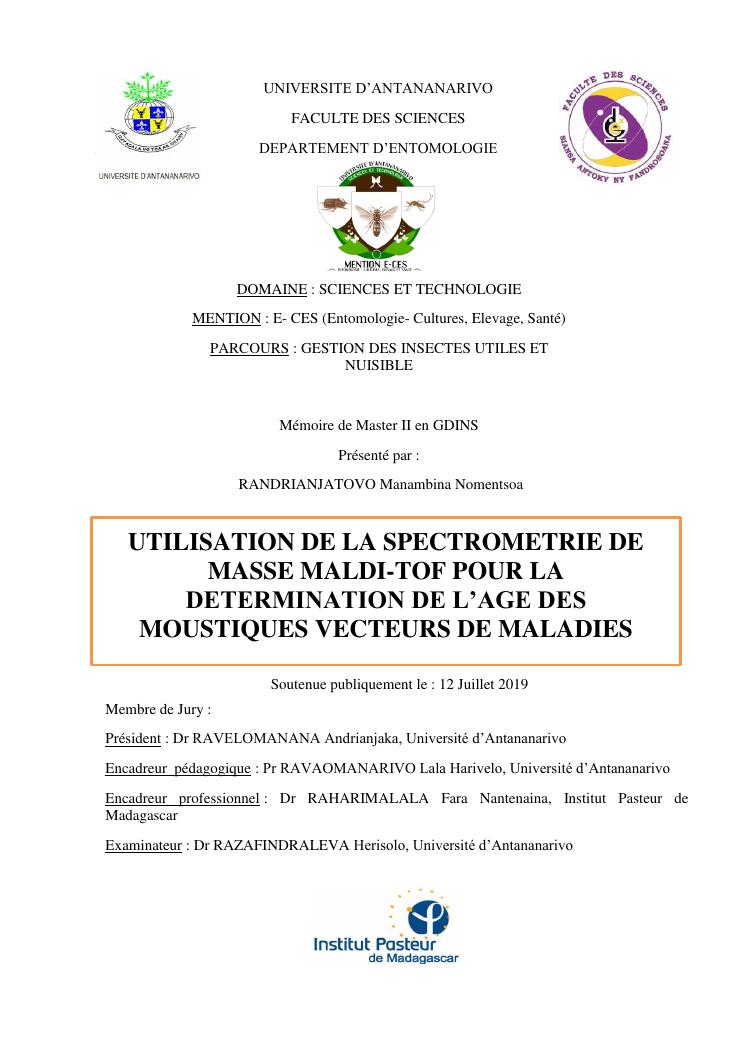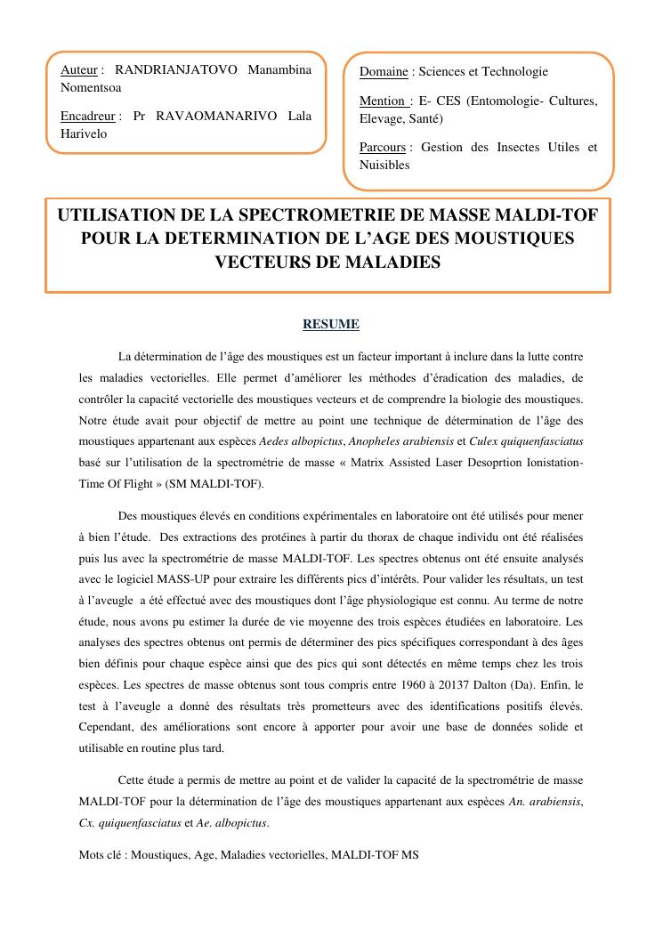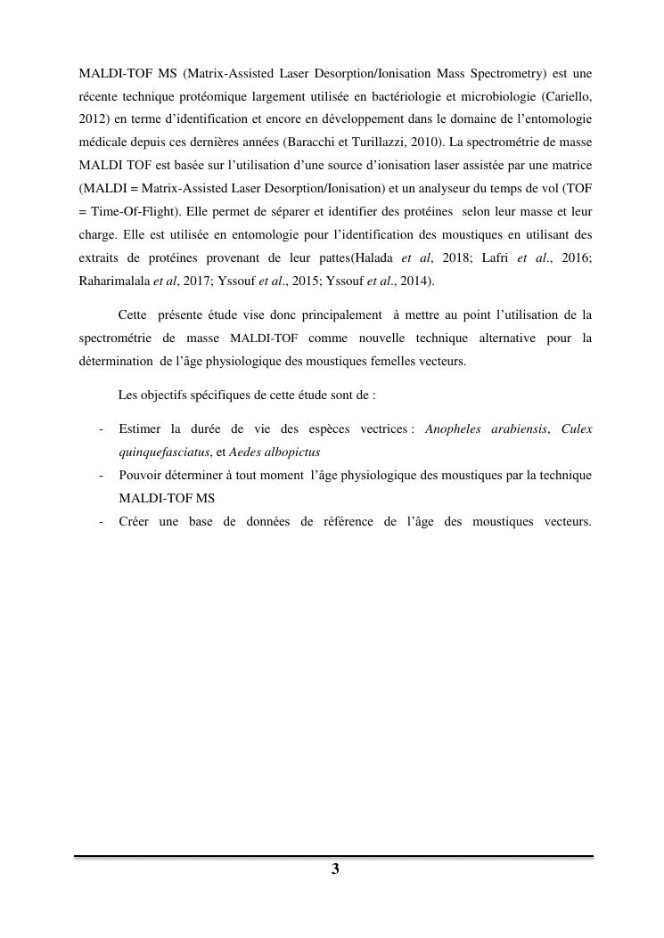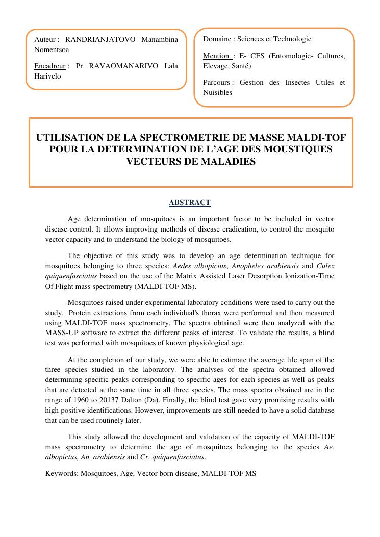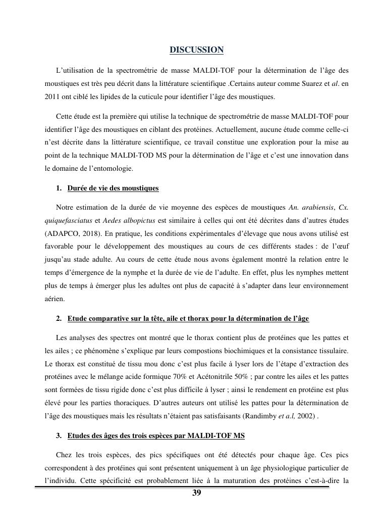 utilisation de la spectrometrie de masse maldi-tof pour la determination de l'age des moustiques vecteurs de maladies