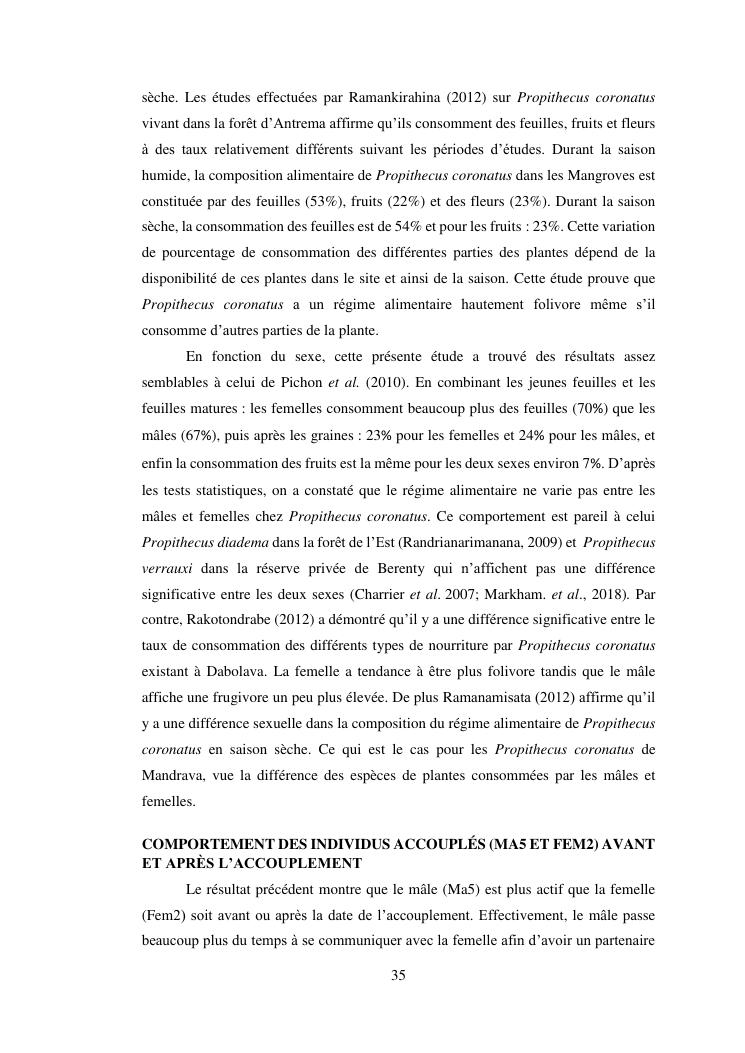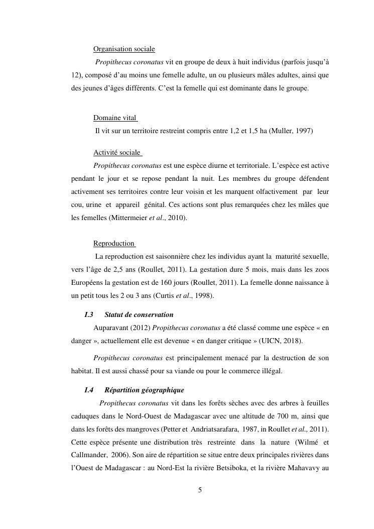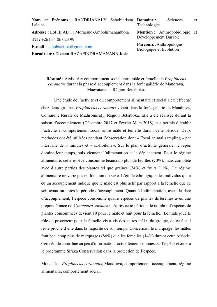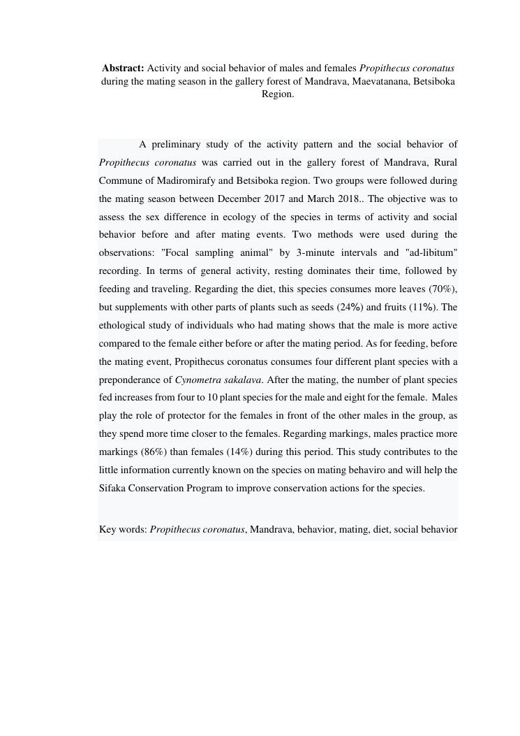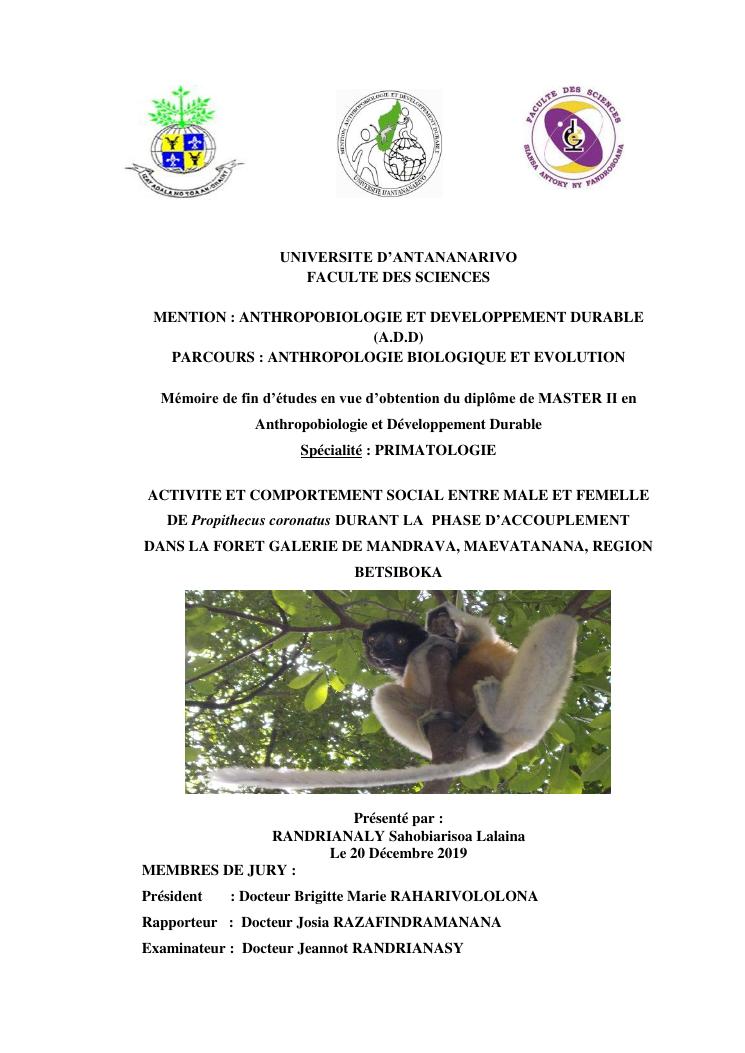 activite et comportement social entre male et femelle de propithecus coronatus durant la phase d'accouplement dans la foret galerie de mandrava, maevatanana, region betsiboka
