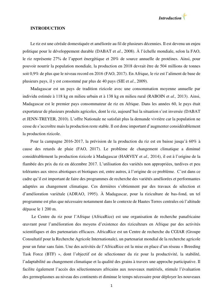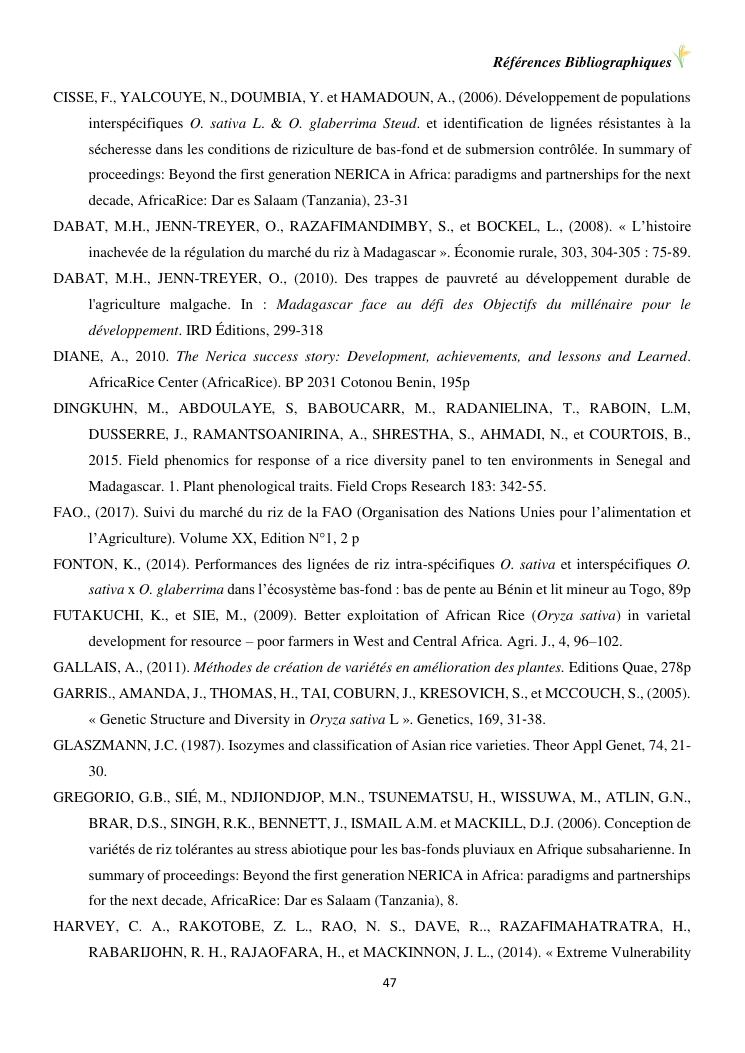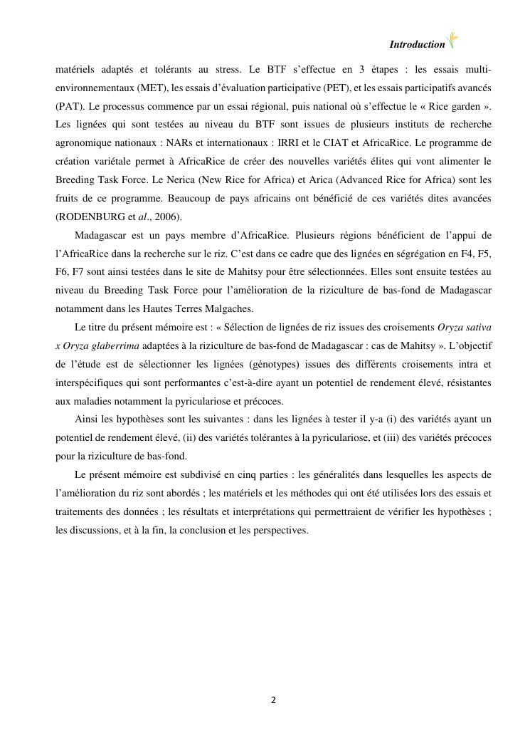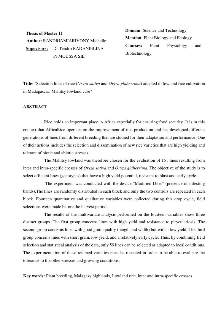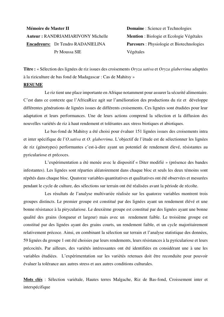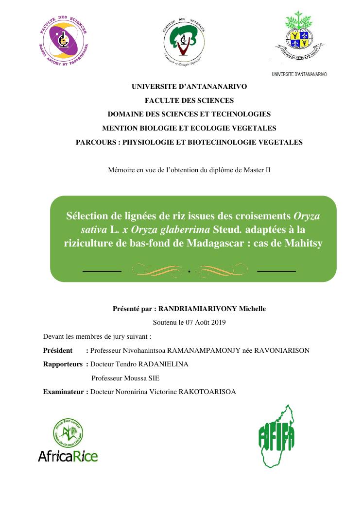 sélection de lignées de riz issues des croisements oryza sativa l. x oryza glaberrima steud. adaptées à la riziculture de bas-fond de madagascar : cas de mahitsy