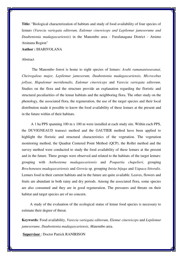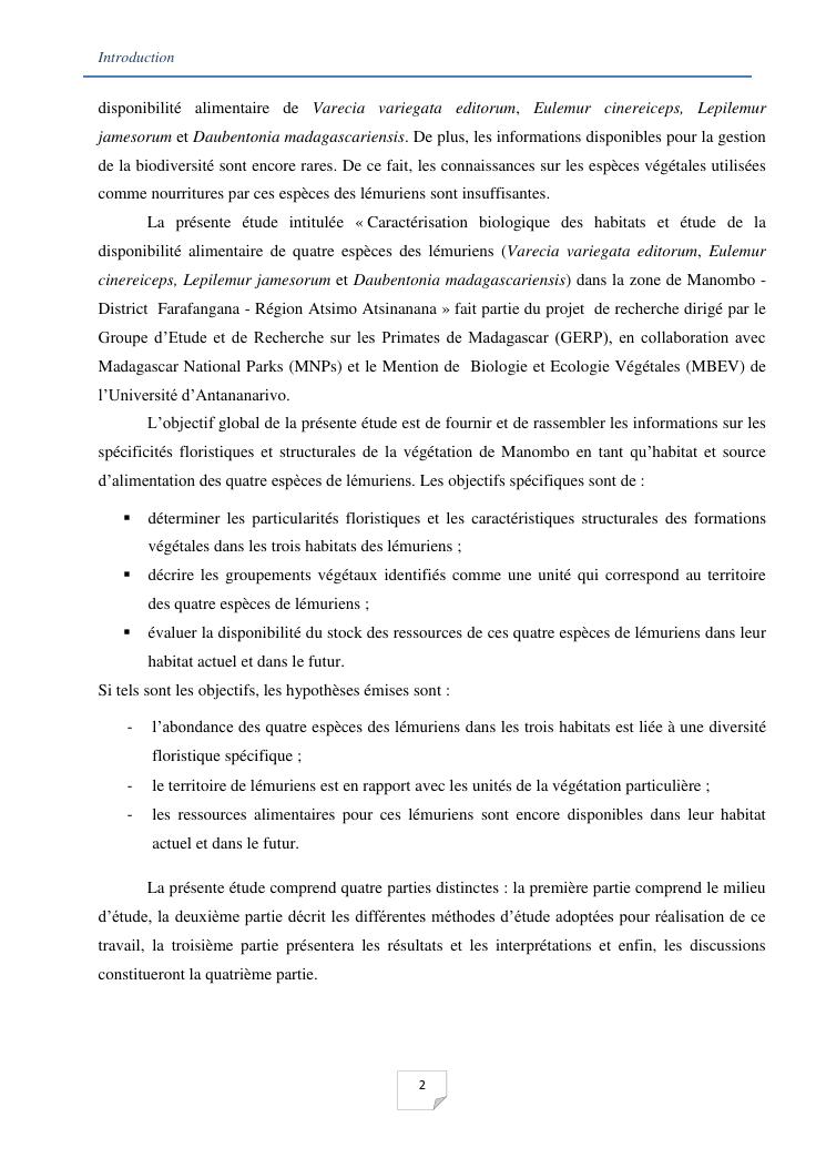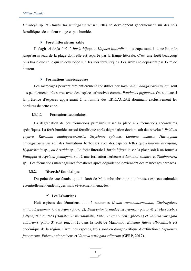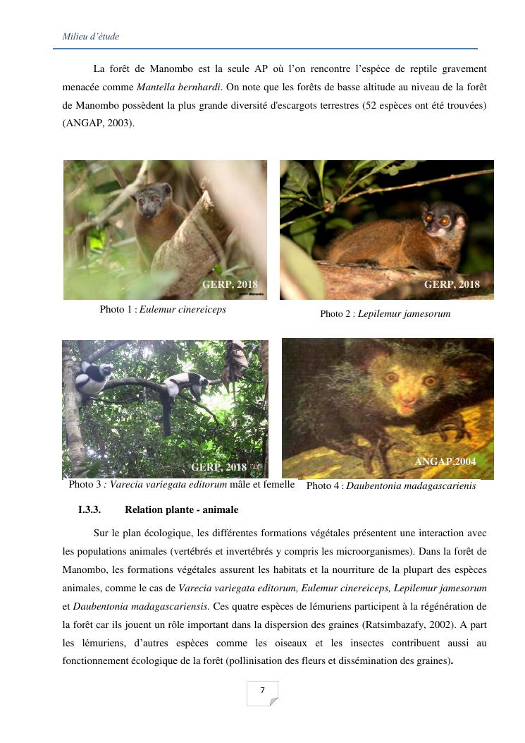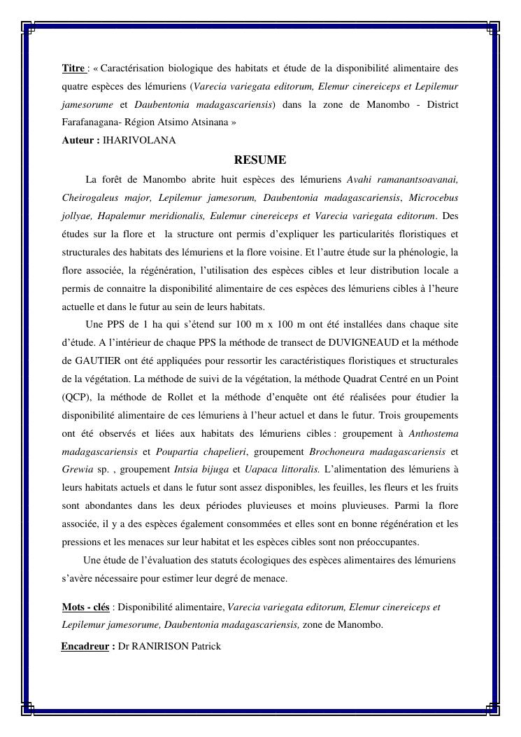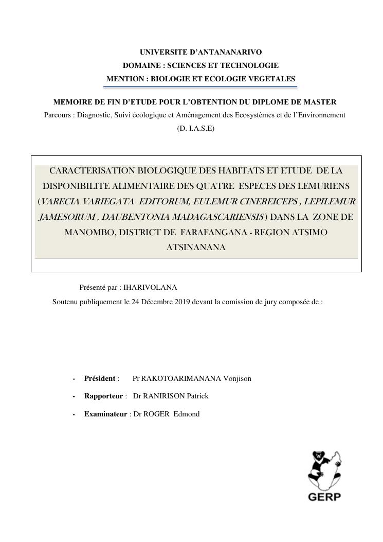 caractérisation biologique des habitats et étude de la disponibilité alimentaire des quatre espèces des lémuriens (varecia variegata editorum, eulemur cinereiceps , lepilemur jamesorum , daubentonia madagascariensis ) dans la zone de manombo, district de farafangana région atsimo atsinanana.