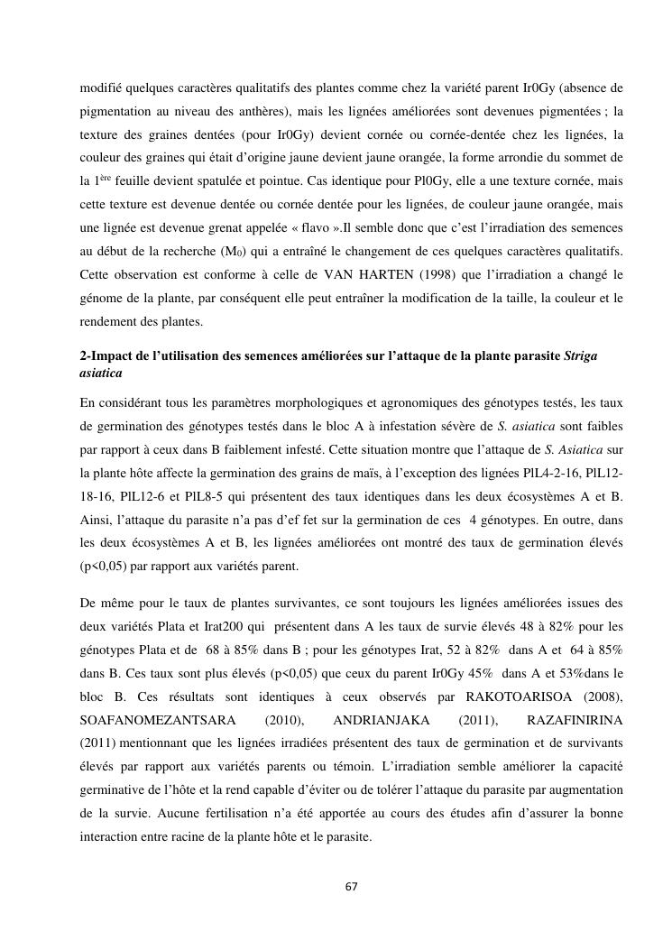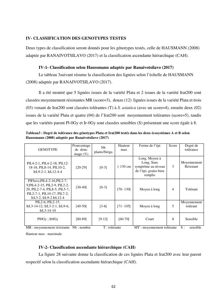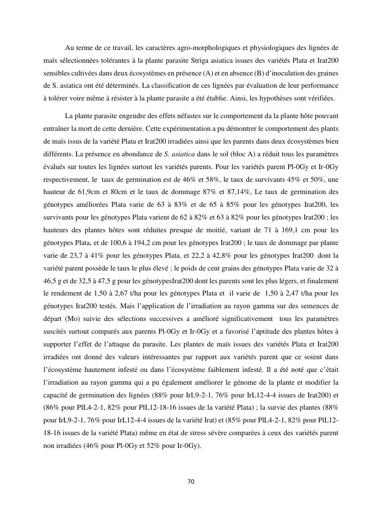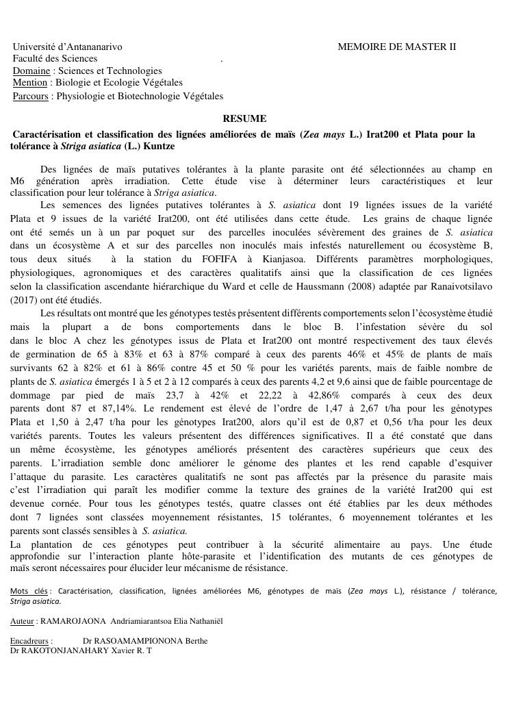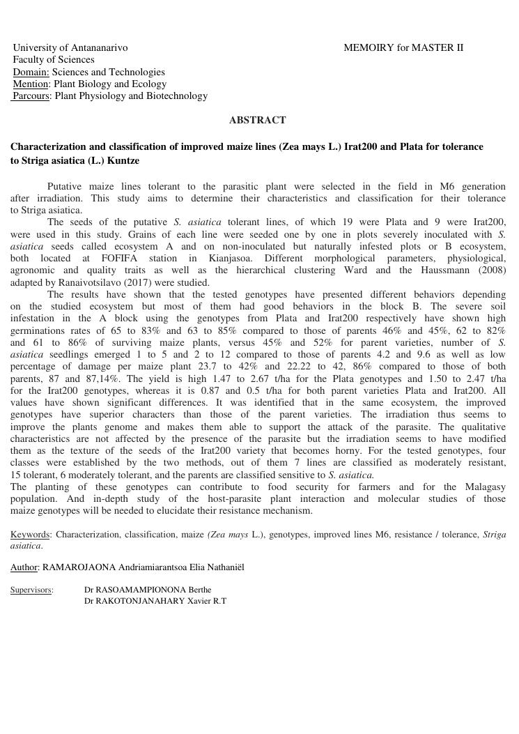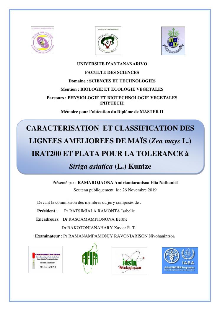 caracterisation et classification des lignees ameliorees de maïs (zea mays l.) irat200 et plata pour la tolerance à striga asiatica (l.) kuntze