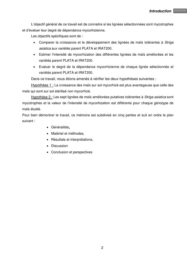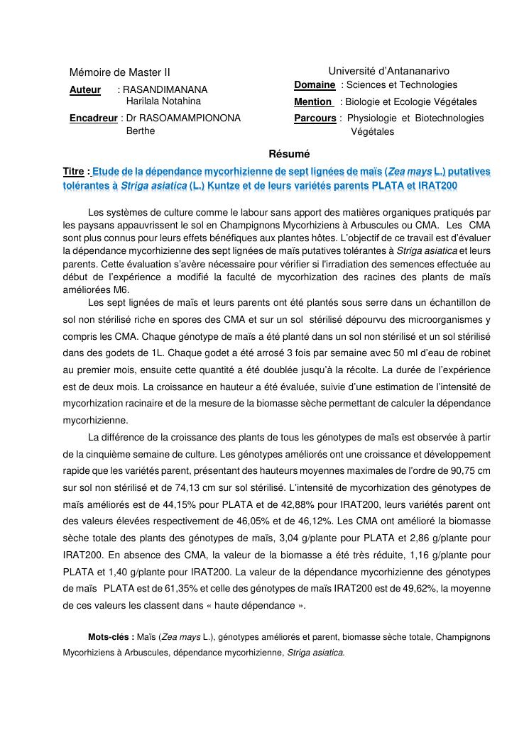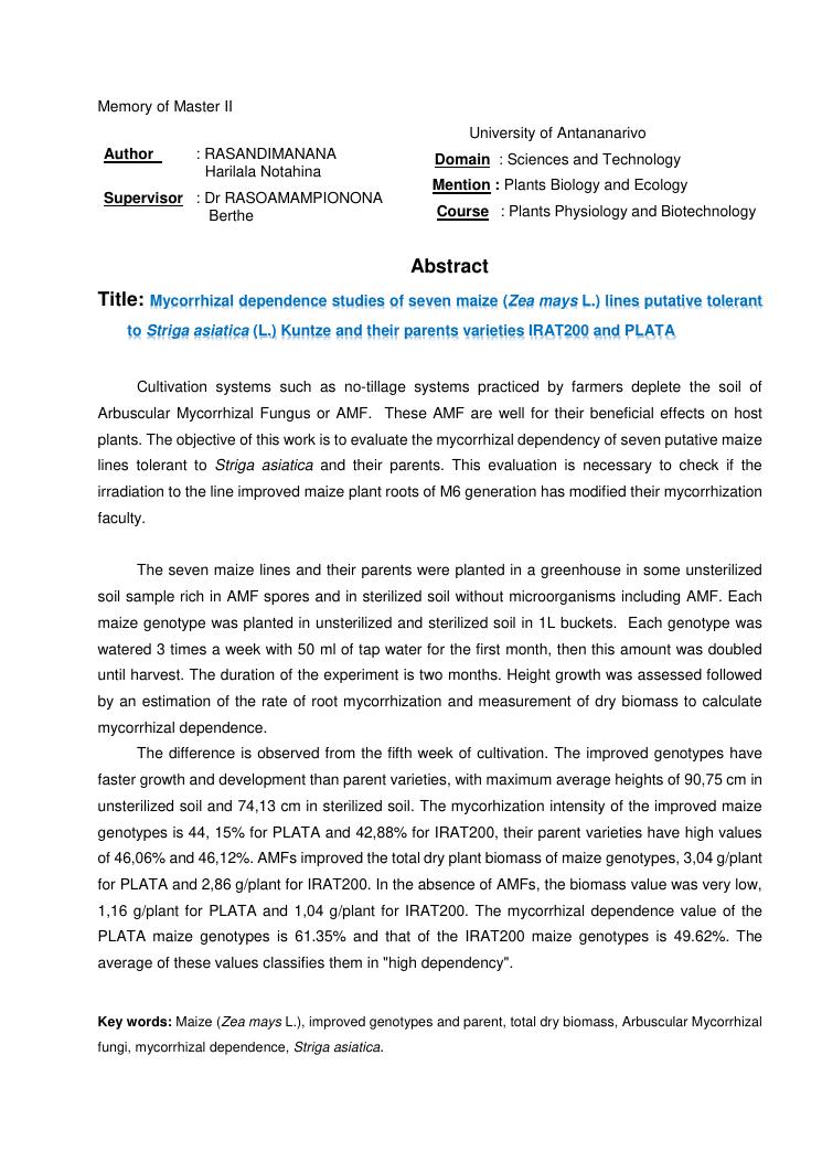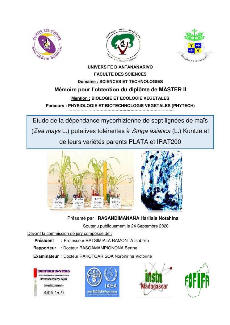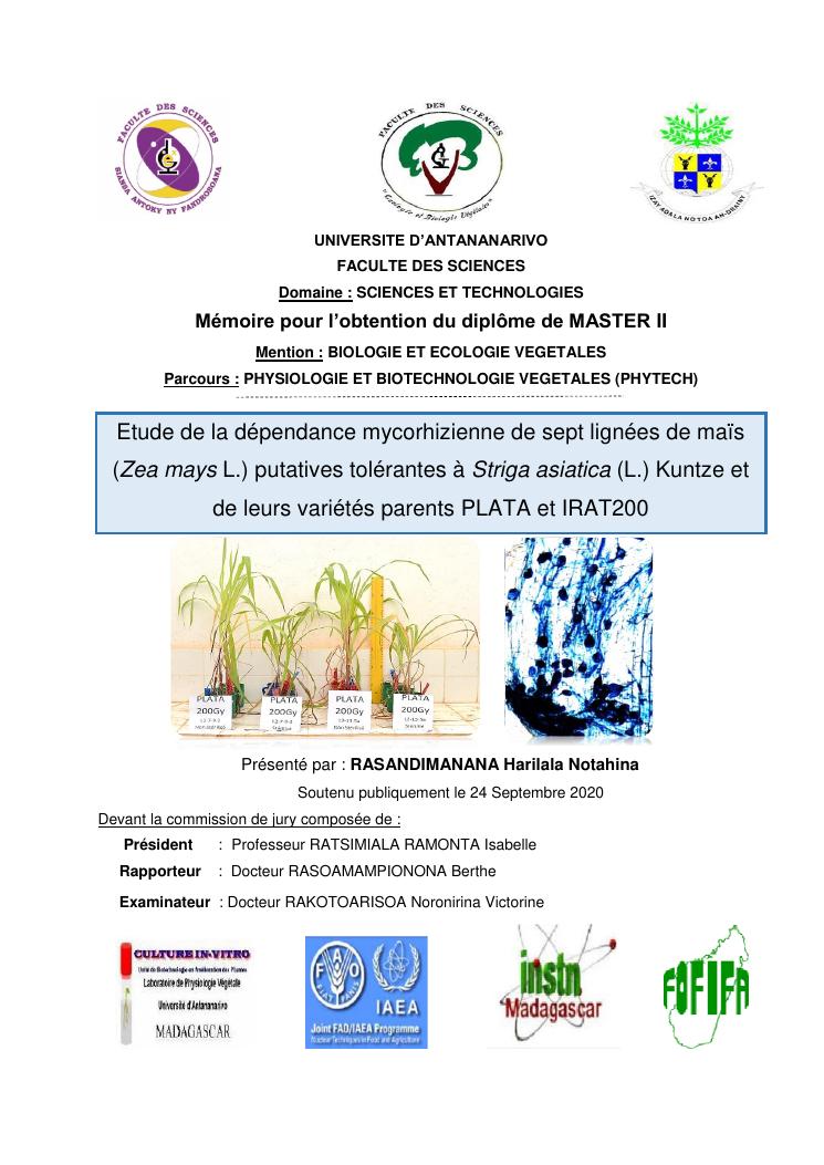 etude de la dépendance mycorhizienne de sept lignées de maïs (zea mays l.) putatives tolérantes à striga asiatica (l.) kuntze et de leurs variétés parents plata et irat200