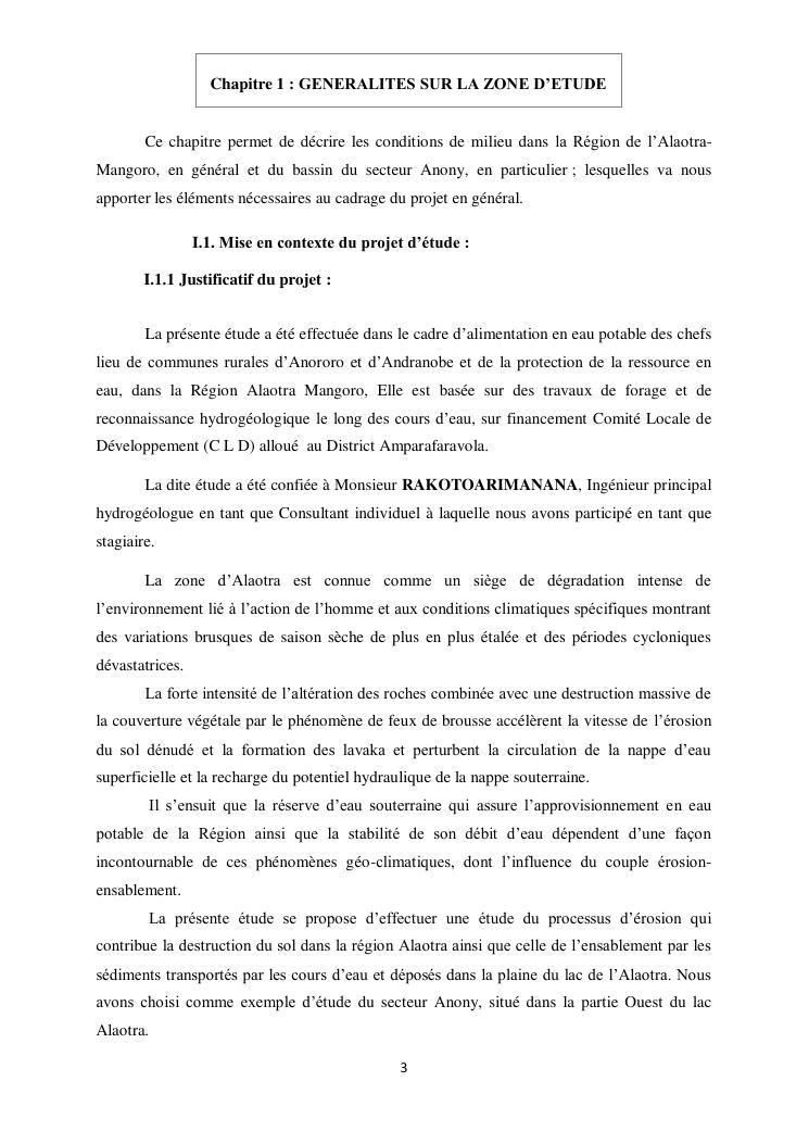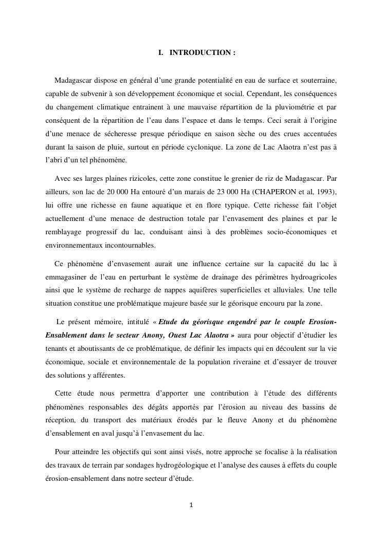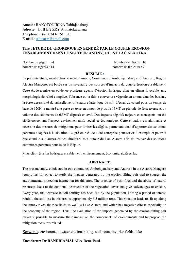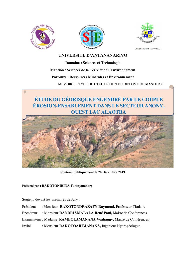 étude du géorisque engendré par le couple érosion-ensablement dans le secteur anony, ouest lac alaotra