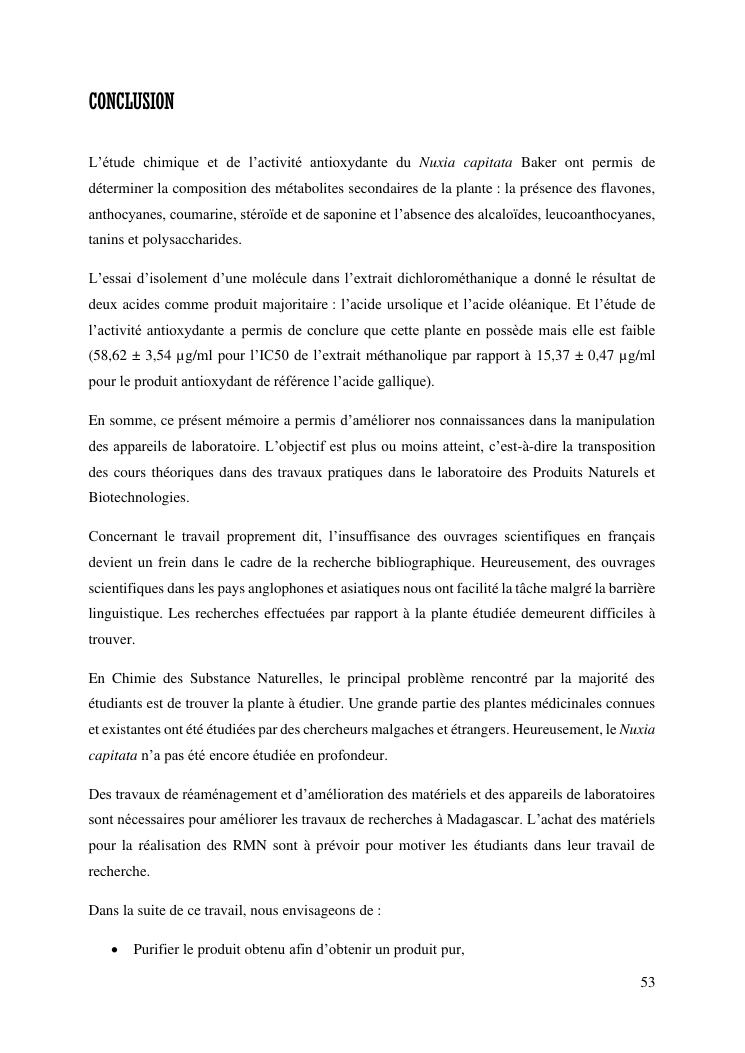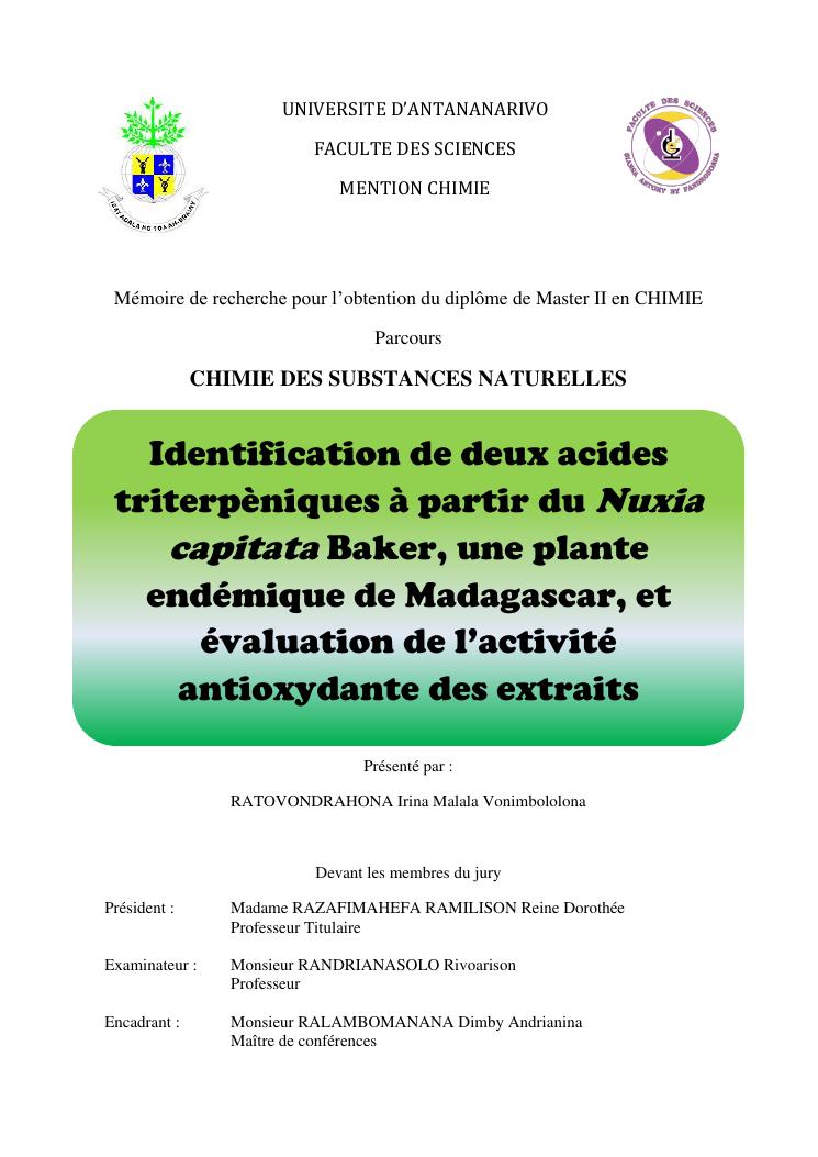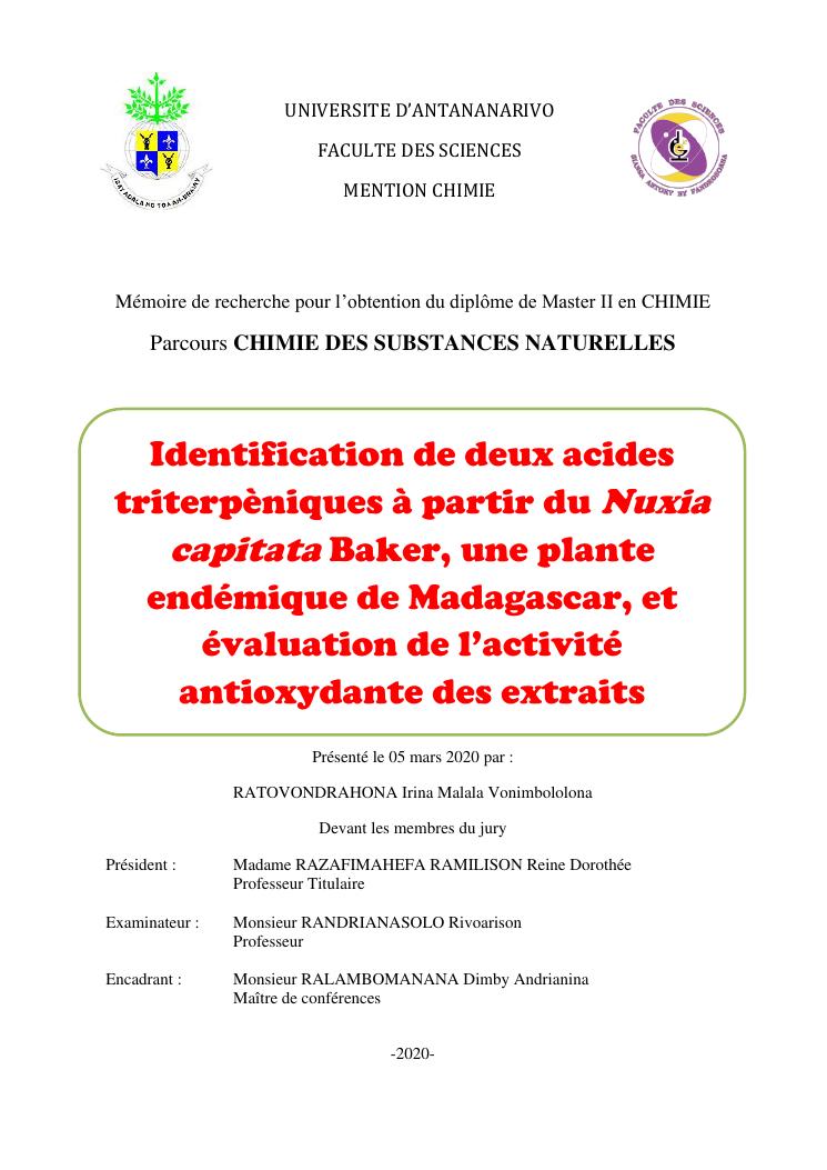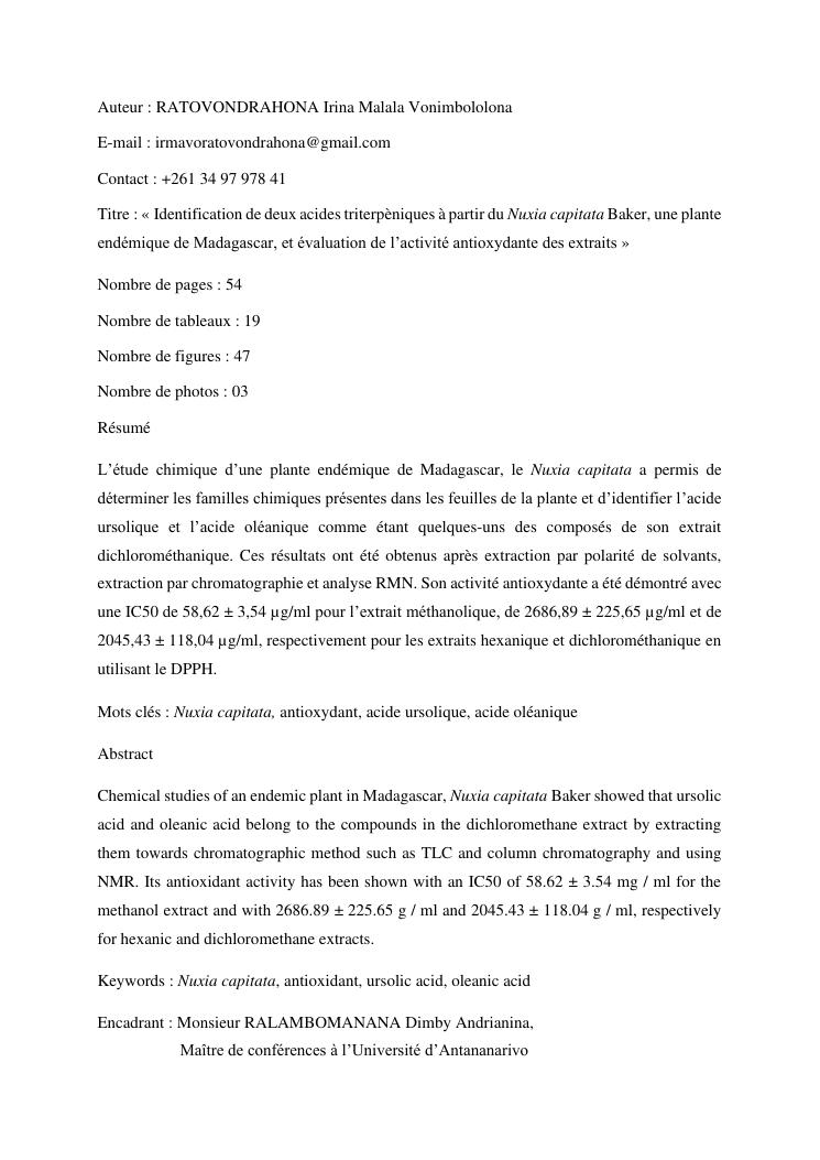 identification de deux acides triterpèniques à partir du nuxia capitata baker, une plante endémique de madagascar, et évaluation de l'activité antioxydante des extraits