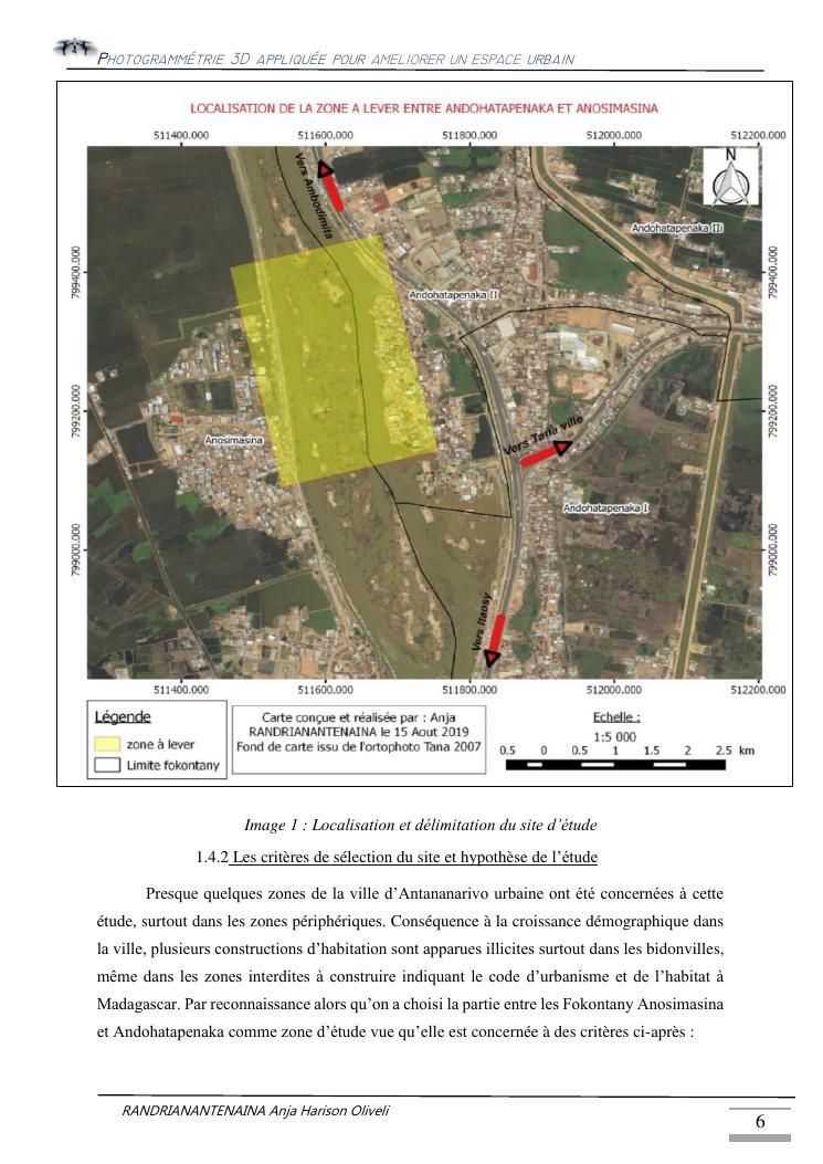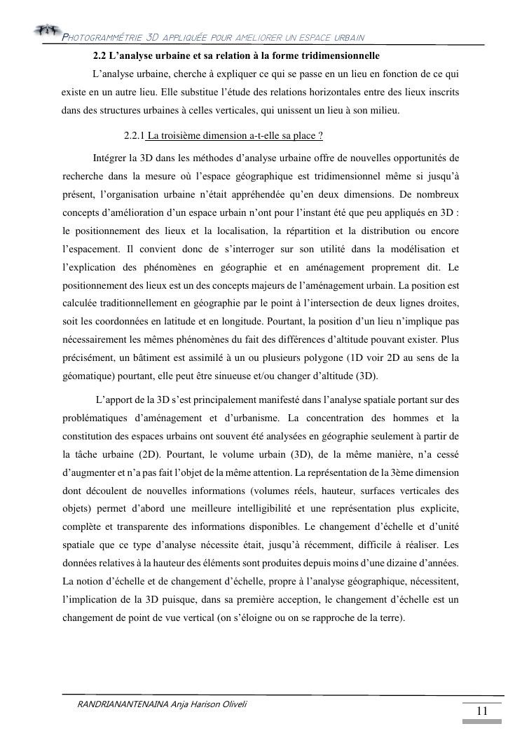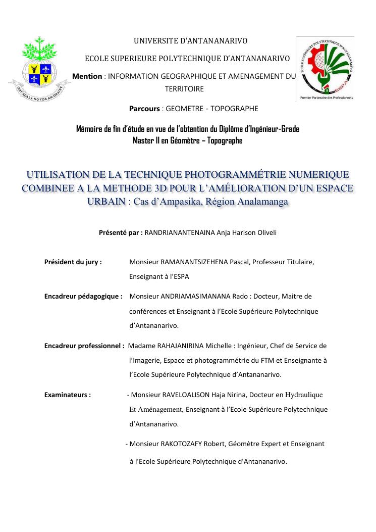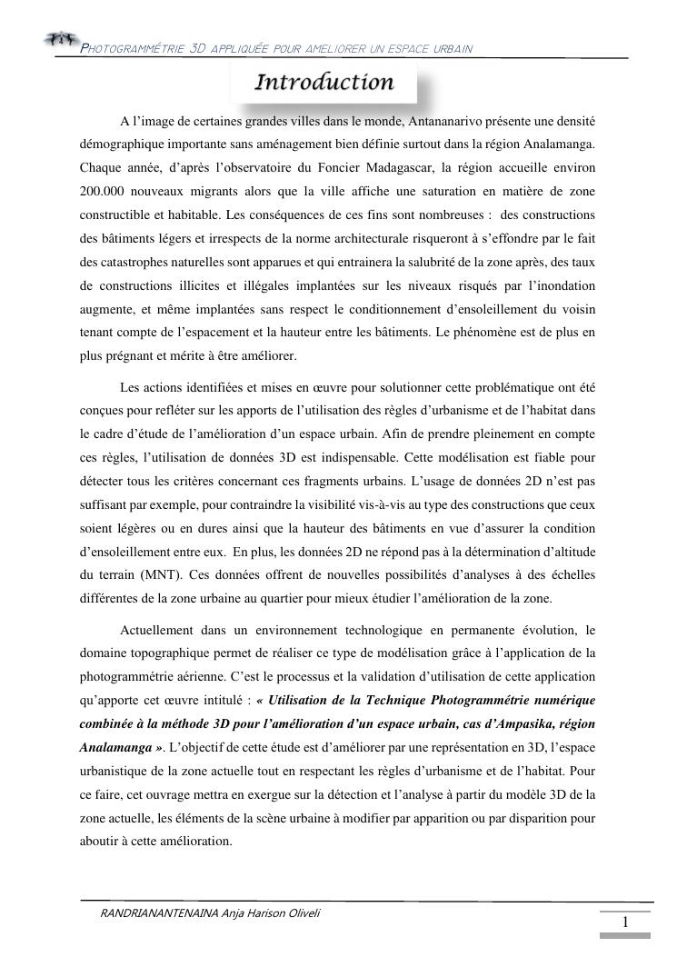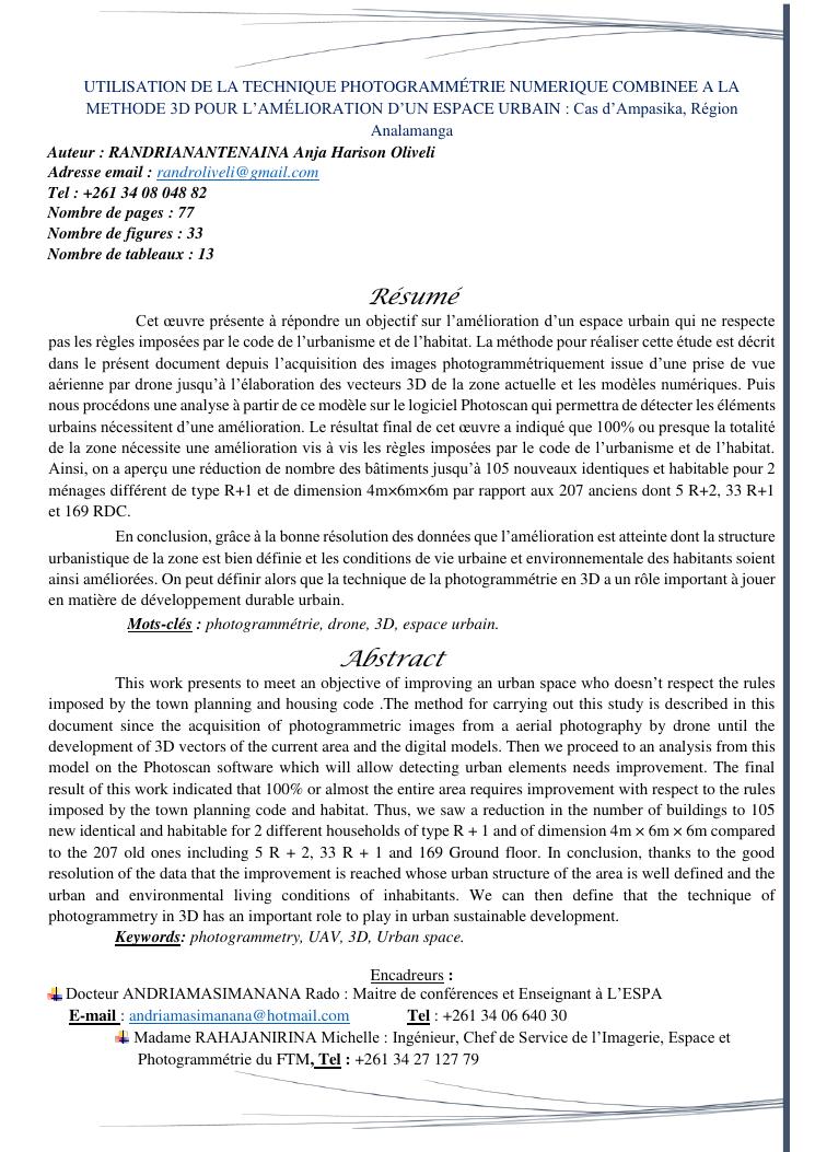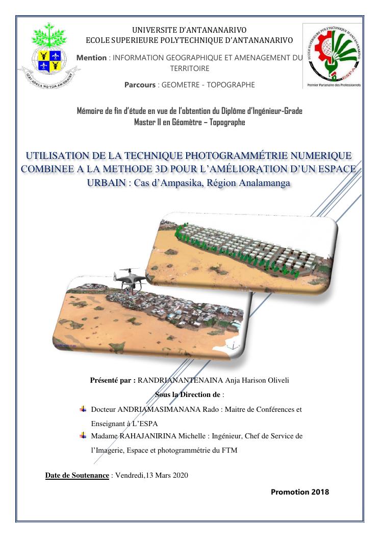 utilisation de la technique photogrammétrie numerique combinee a la methode 3d pour l'amélioration d'un espace urbain : cas d'ampasika, région analamanga