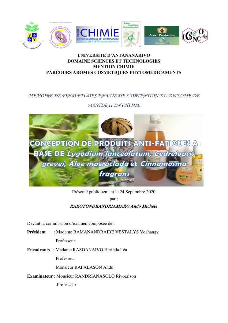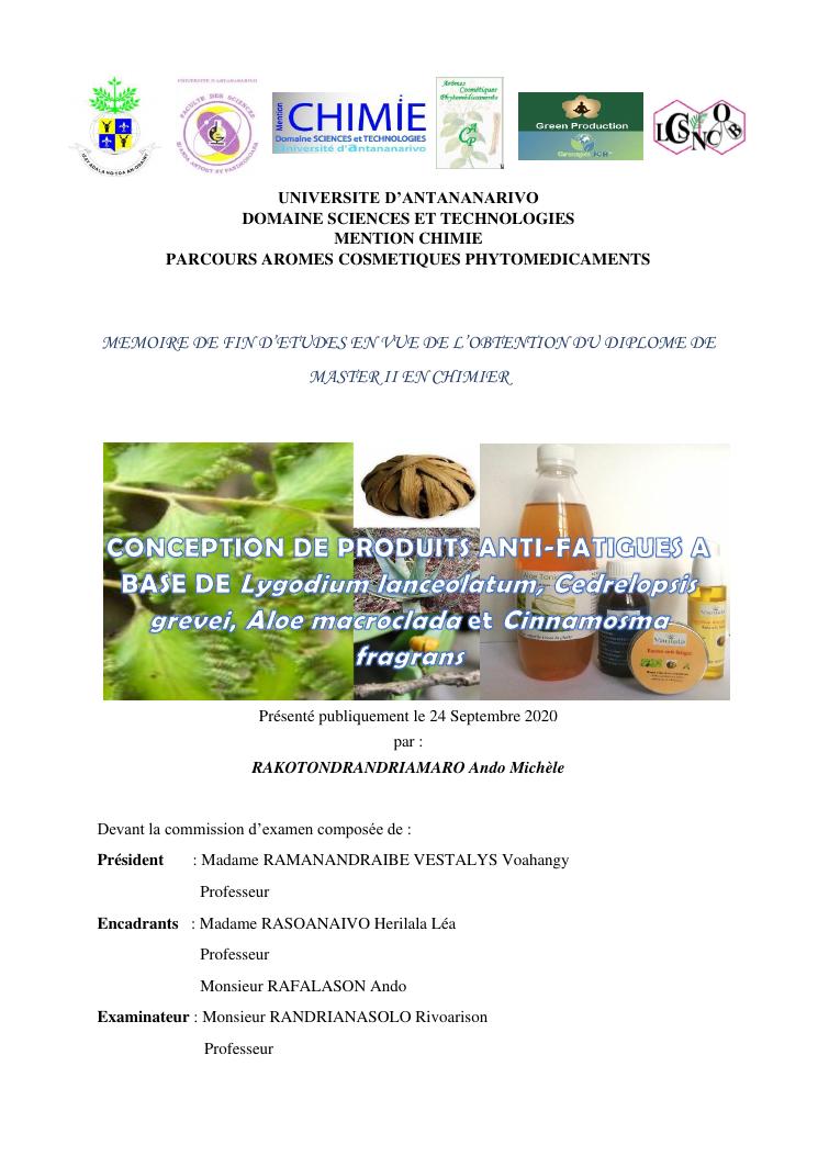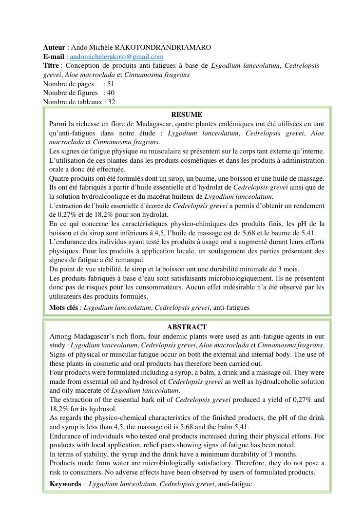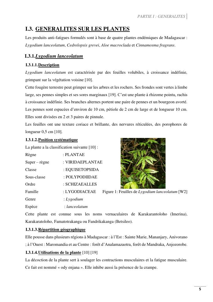 conception de produits anti-fatigues à base de lygodium lanceolatum, cedrelopsis grevei, aloe macroclada et cinnamosma fragrans