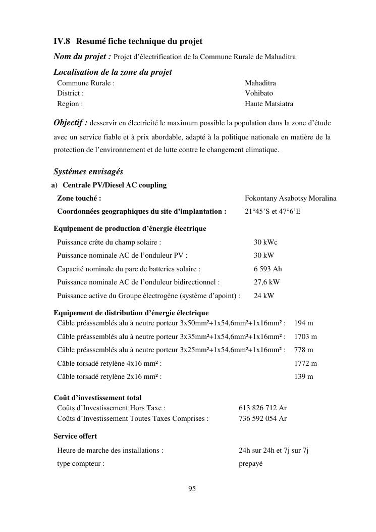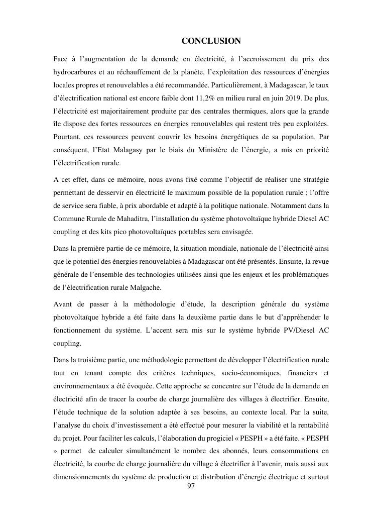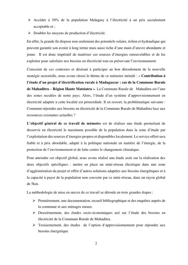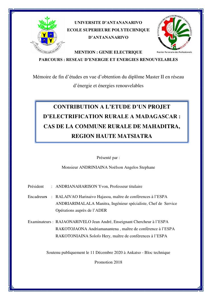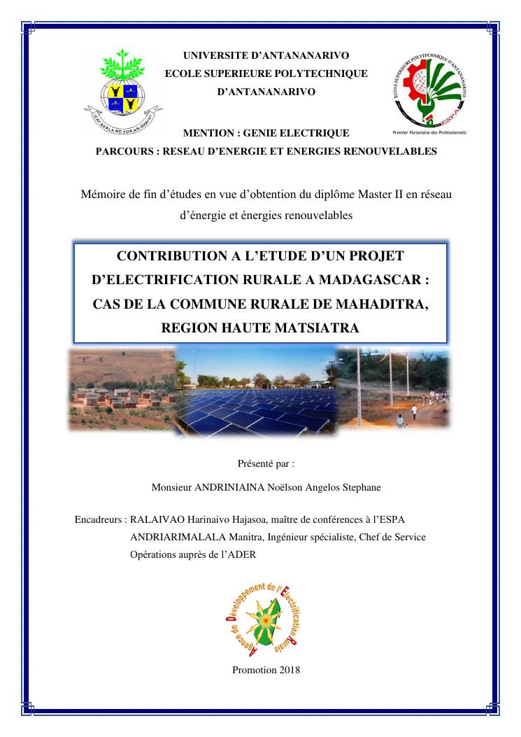 contribution à l'étude d'un projet d'electrification rurale à madagascar : cas de la commune rurale de mahaditra, region haute matsiatra