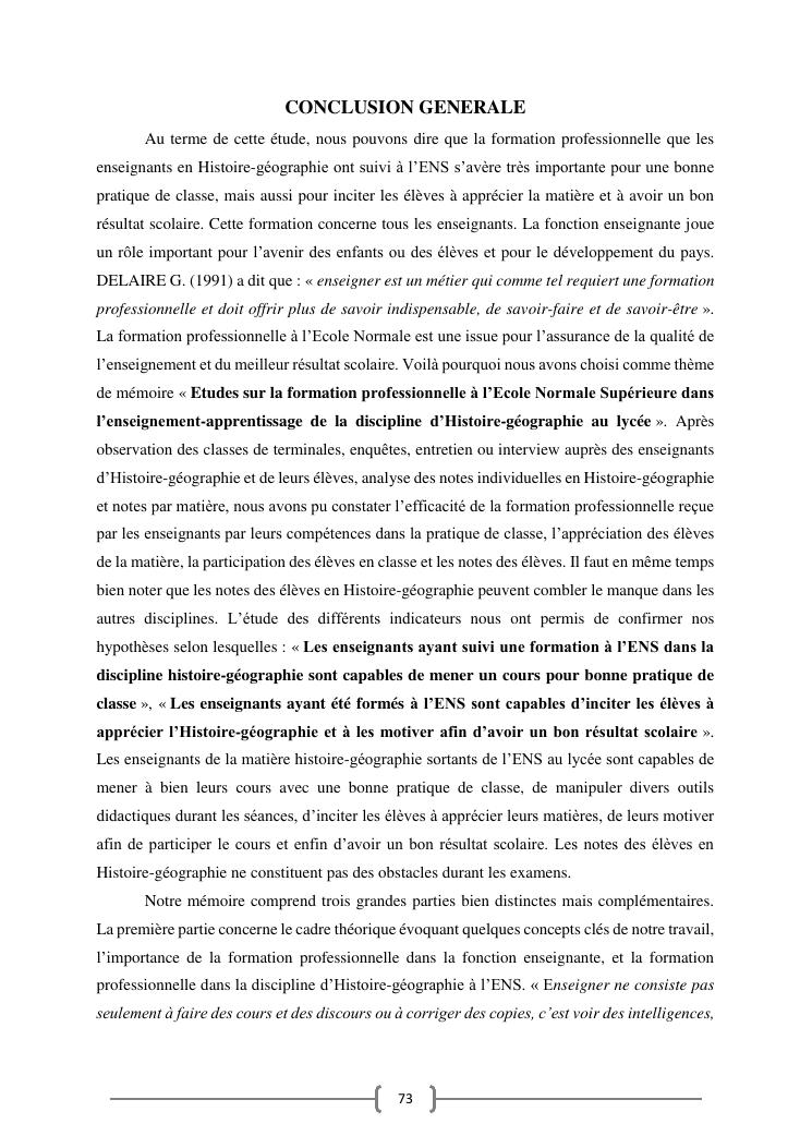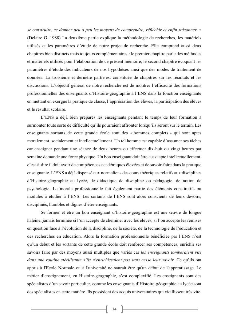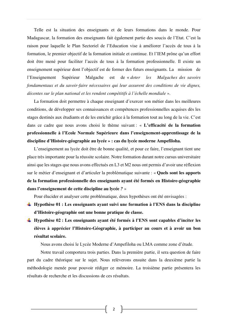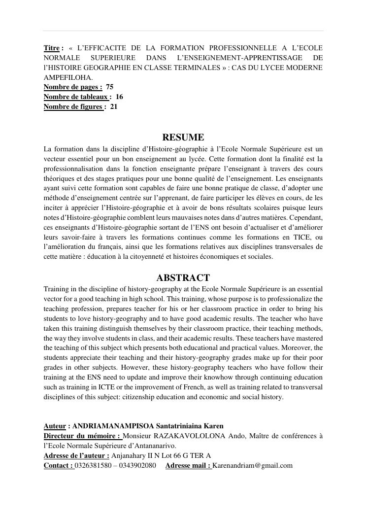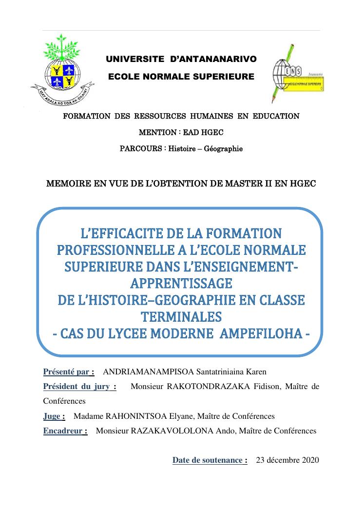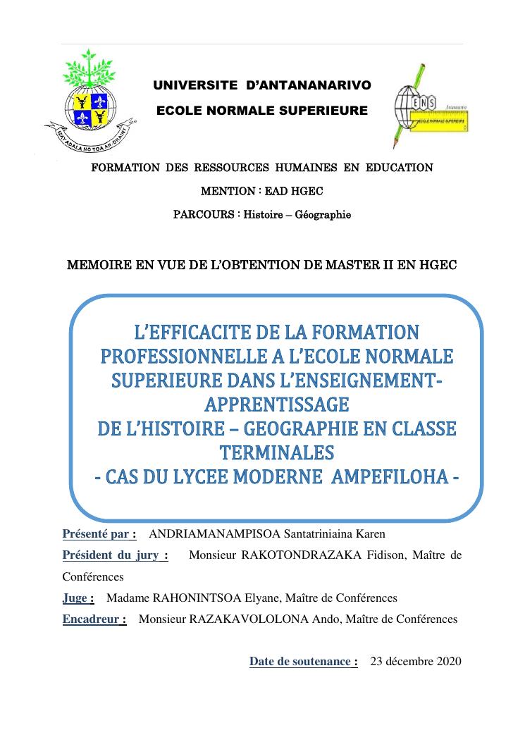 l'efficacite de la formation professionnelle a l'ecole normale superieure dans l'enseignement-apprentissage de l'histoire geographie en classe terminales » : cas du lycee moderne ampefiloha.