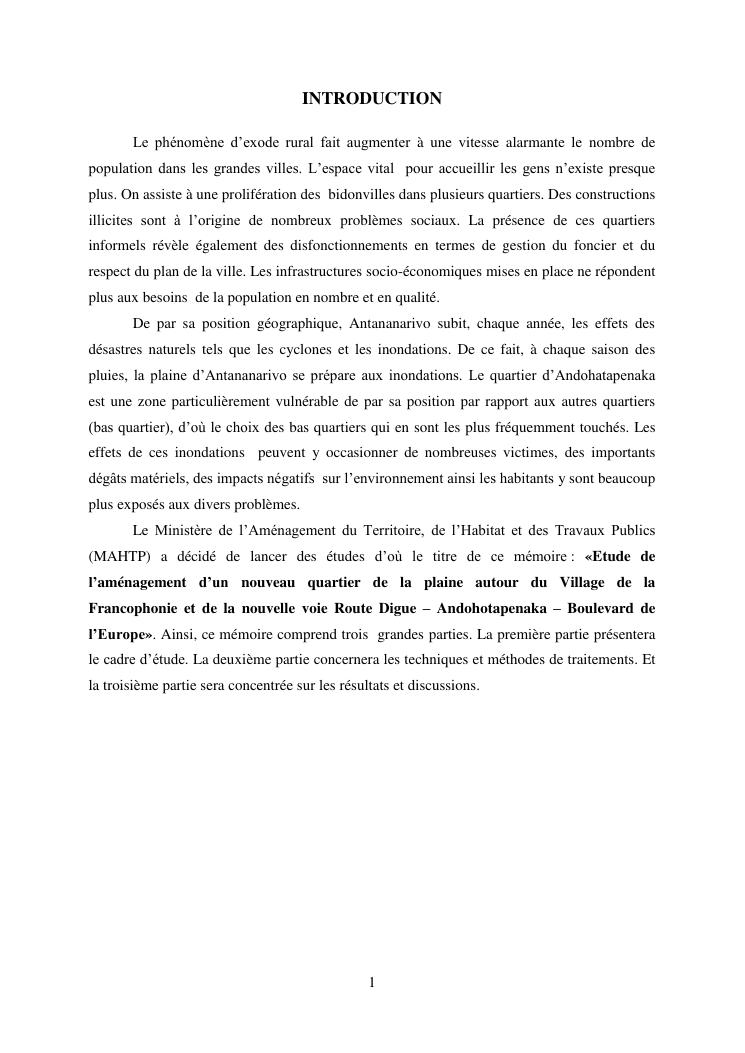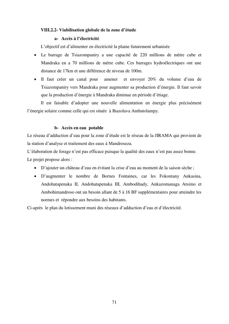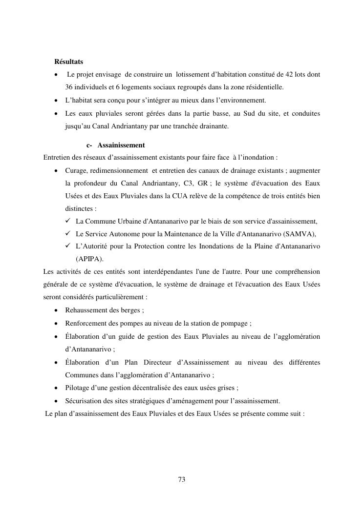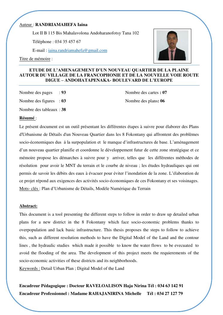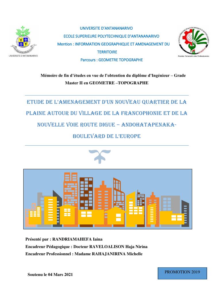 etude de l'amenagement d'un nouveau quartier de la plaine autour du village de la francophonie et de la nouvelle voie route digue andohatapenaka- boulevard de l'europe
