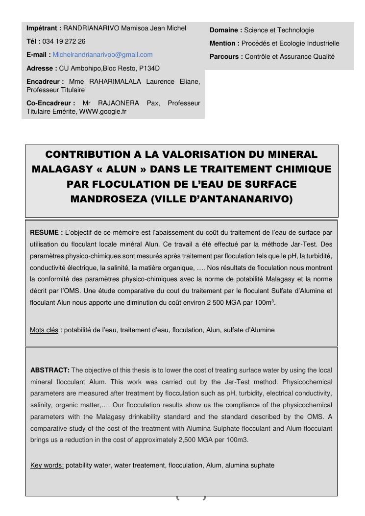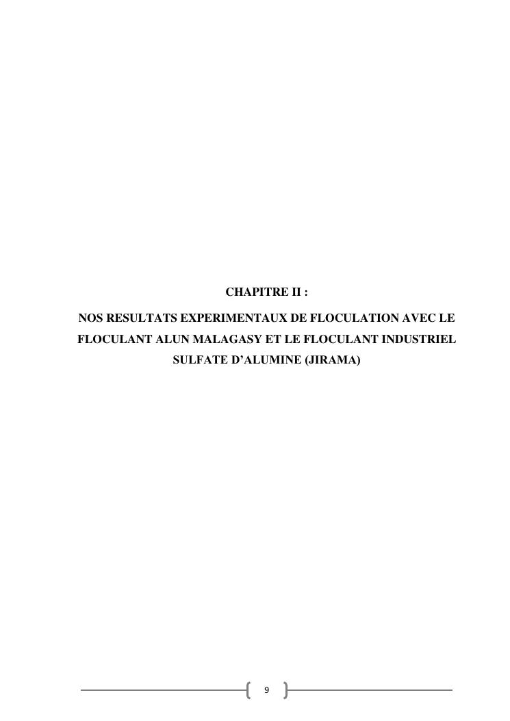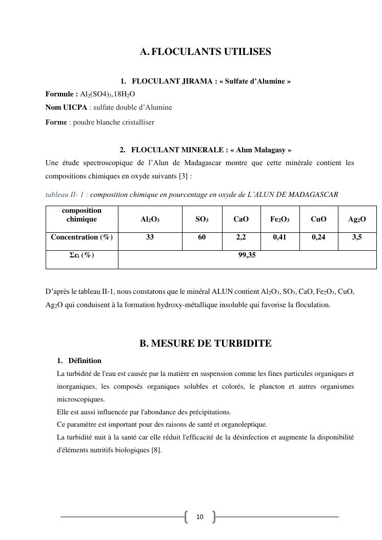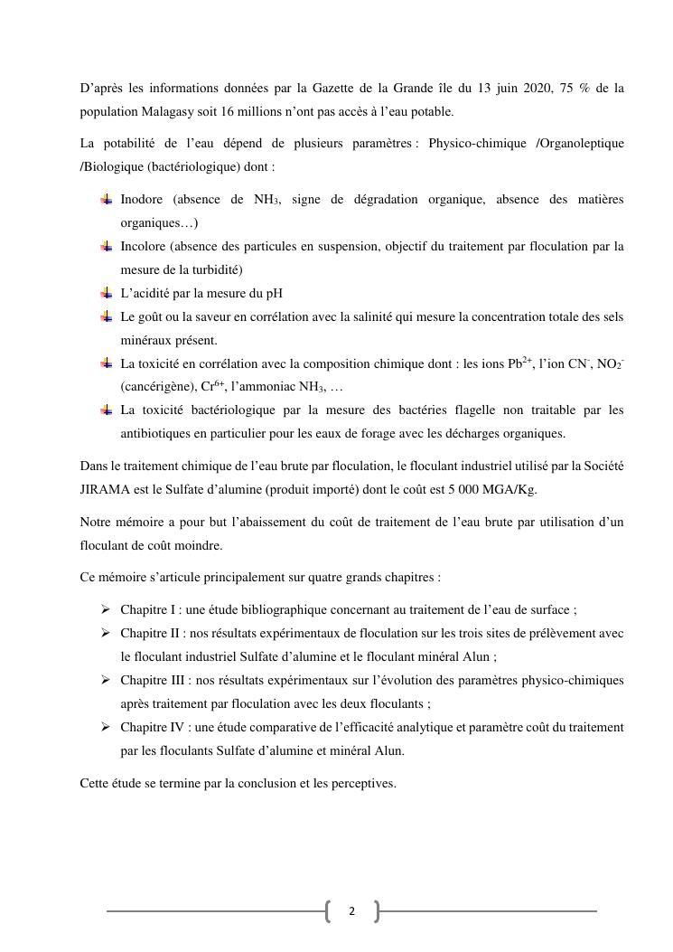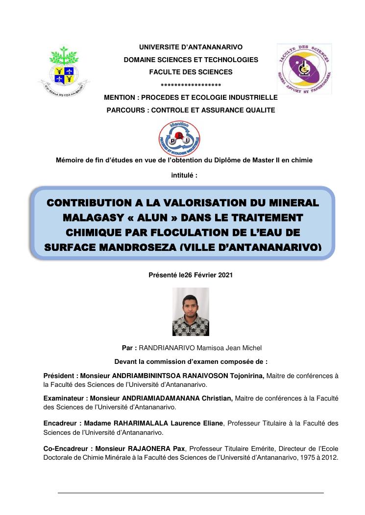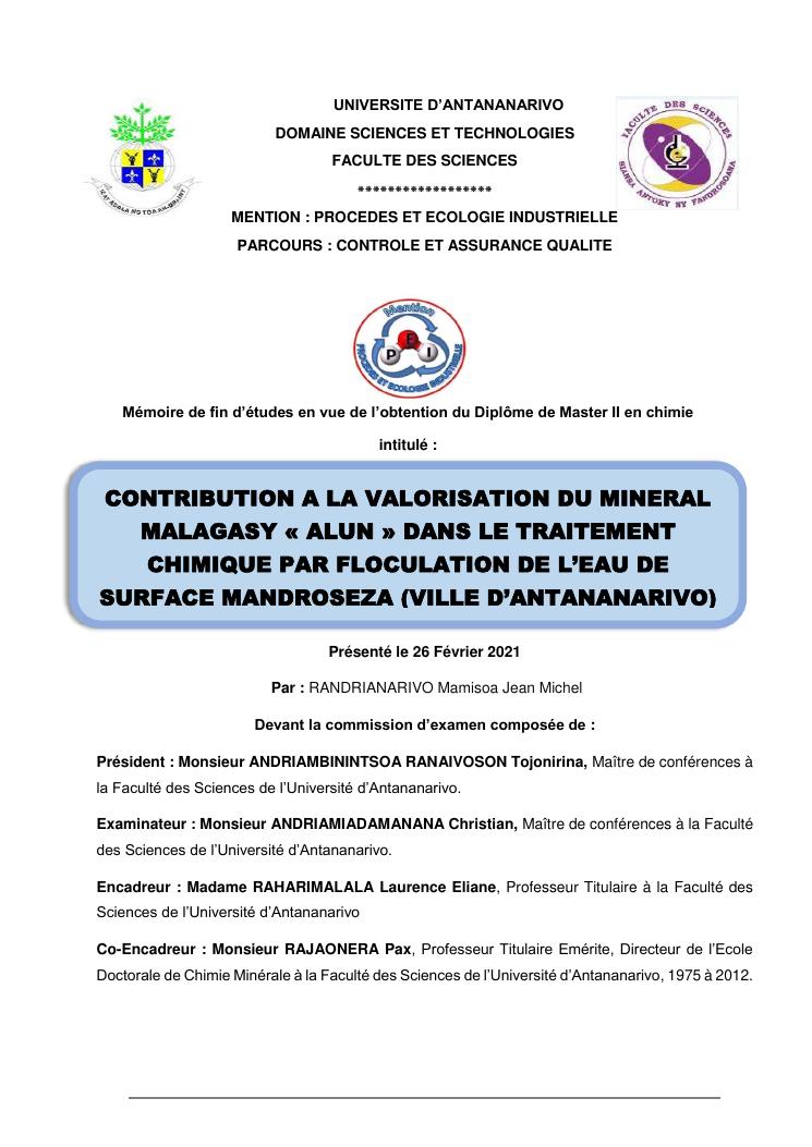 contribution a la valorisation du mineral malagasy « alun » dans le traitement chimique par floculation de l'eau de surface mandroseza (ville d'antananarivo)
