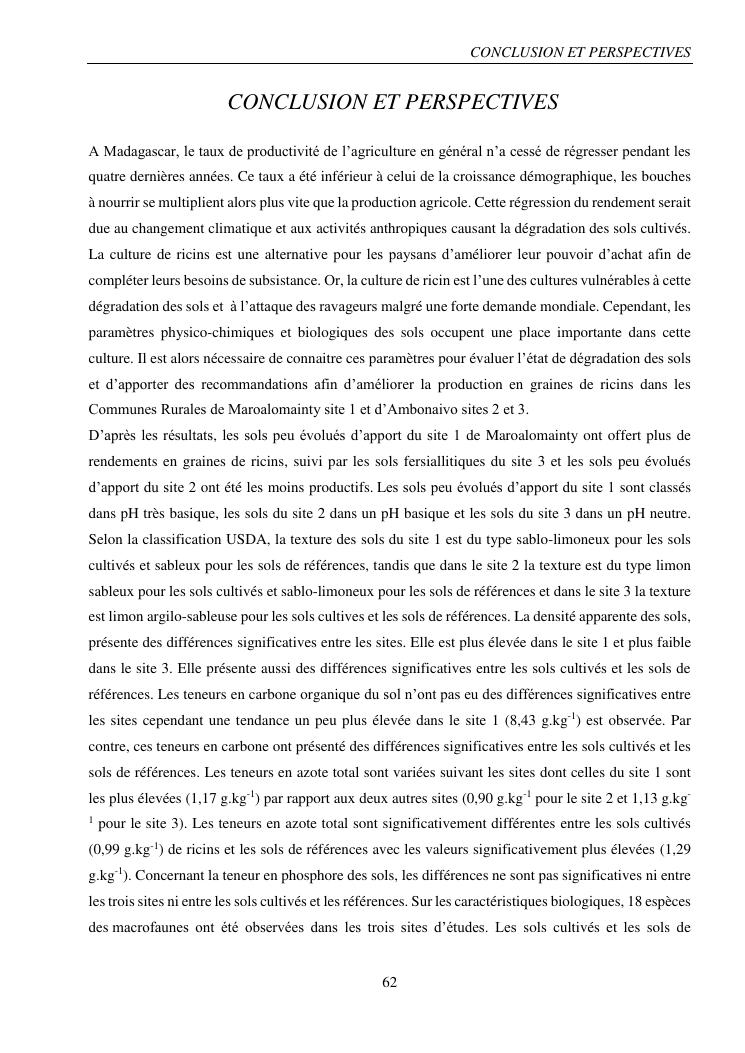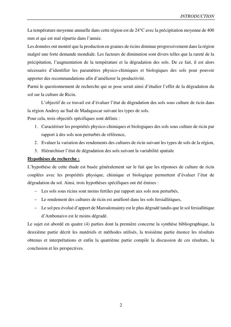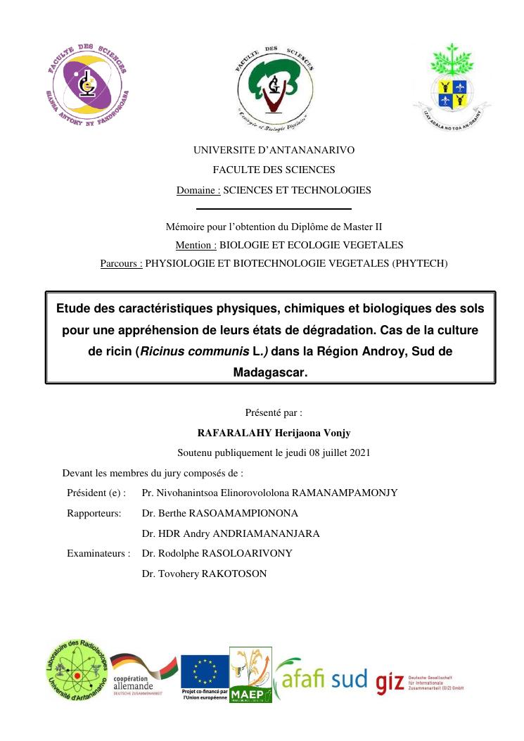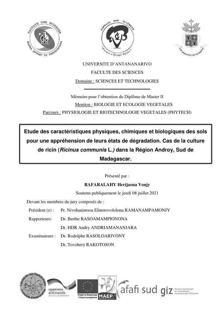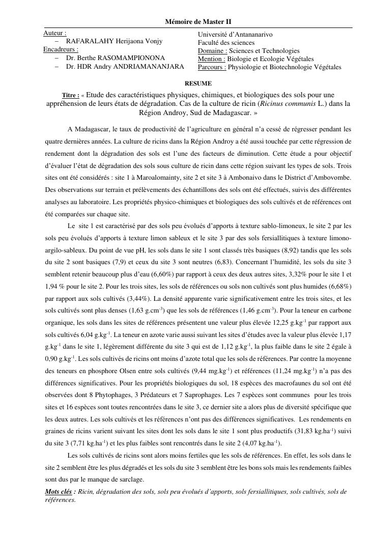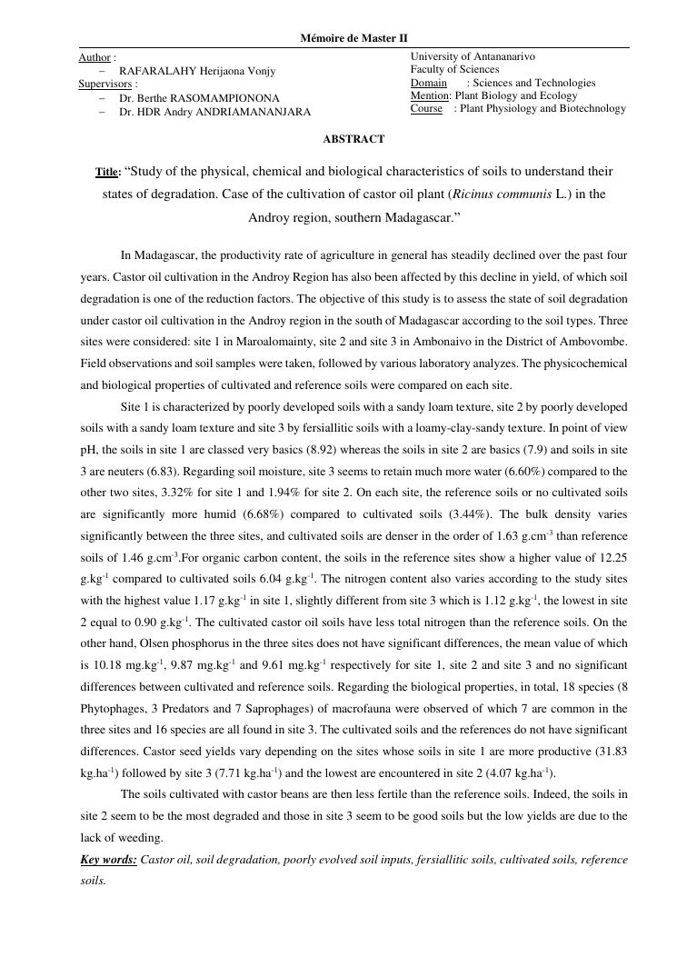etude des caractéristiques physiques, chimiques et biologiques des sols pour une appréhension de leurs états de dégradation. cas de la culture de ricin (ricinus communis l.) dans la région androy, sud de madagascar.