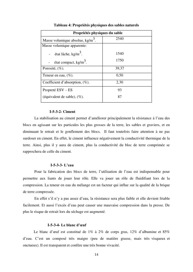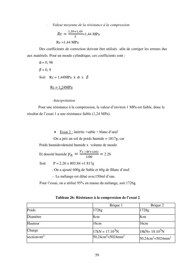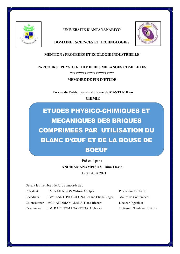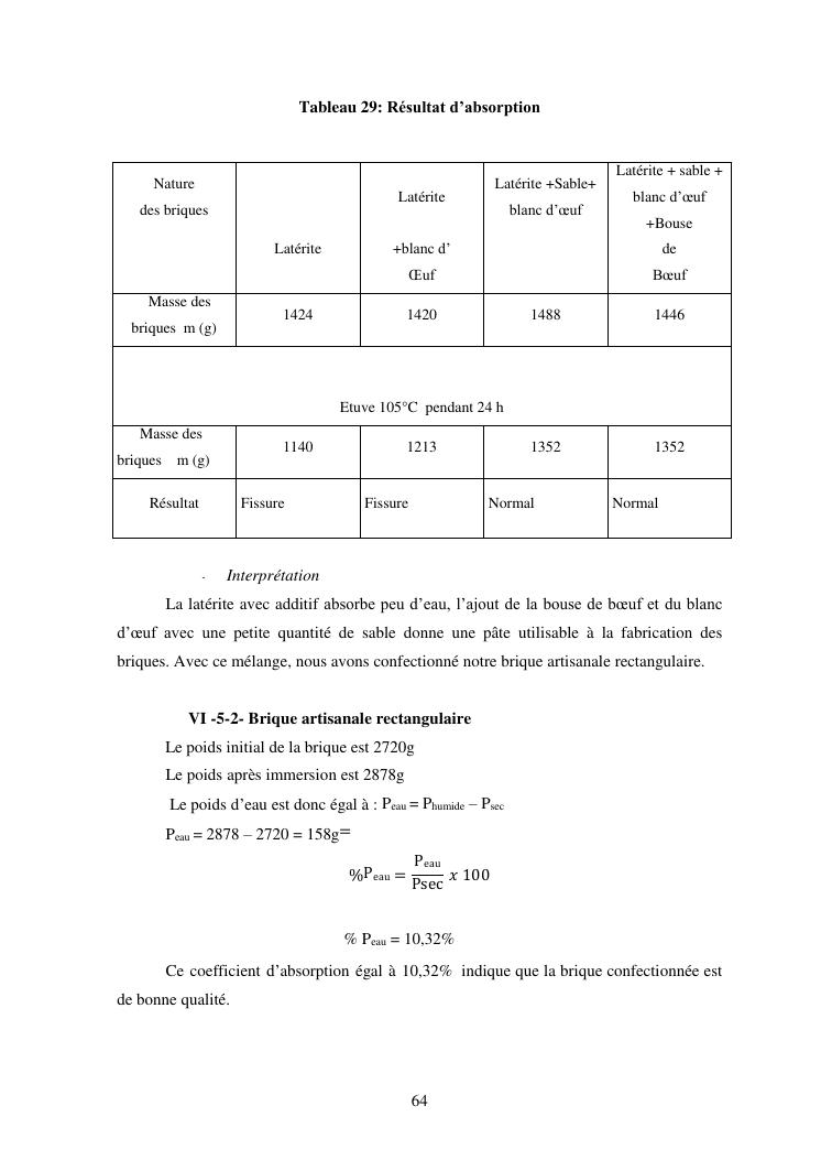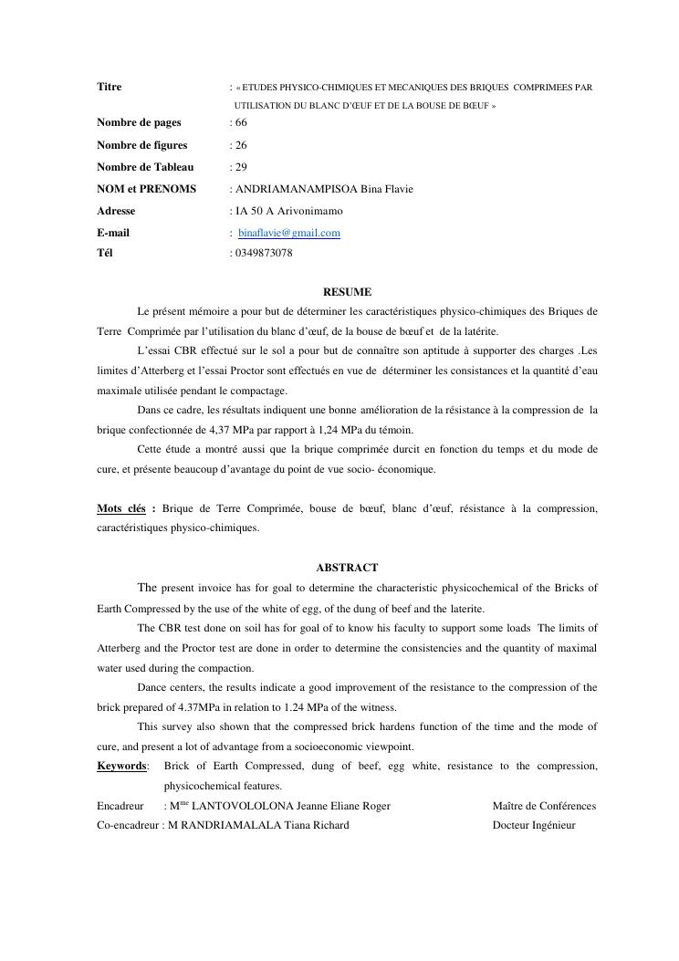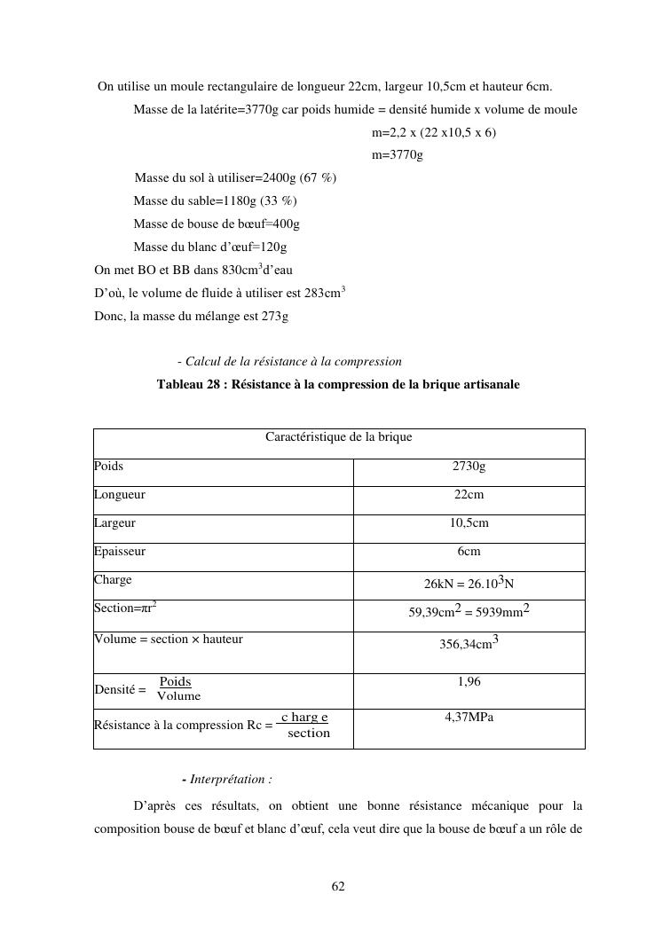 etudes physico-chimiques et mecaniques des briques comprimees par utilisation du blanc d'oeuf et de la bouse de boeuf