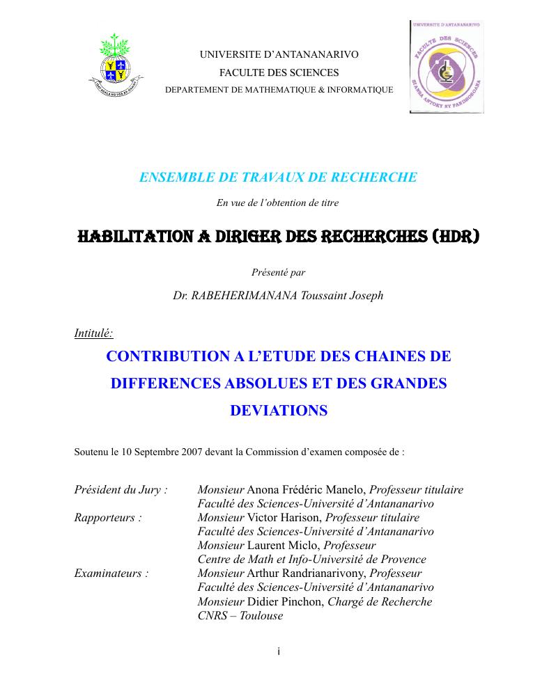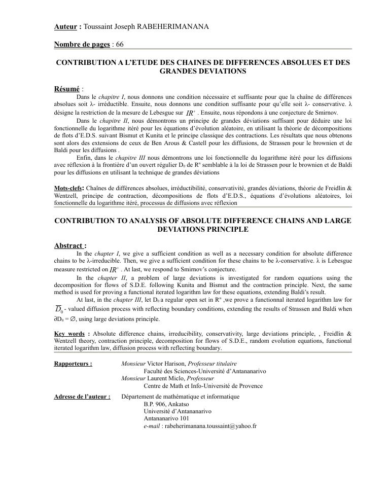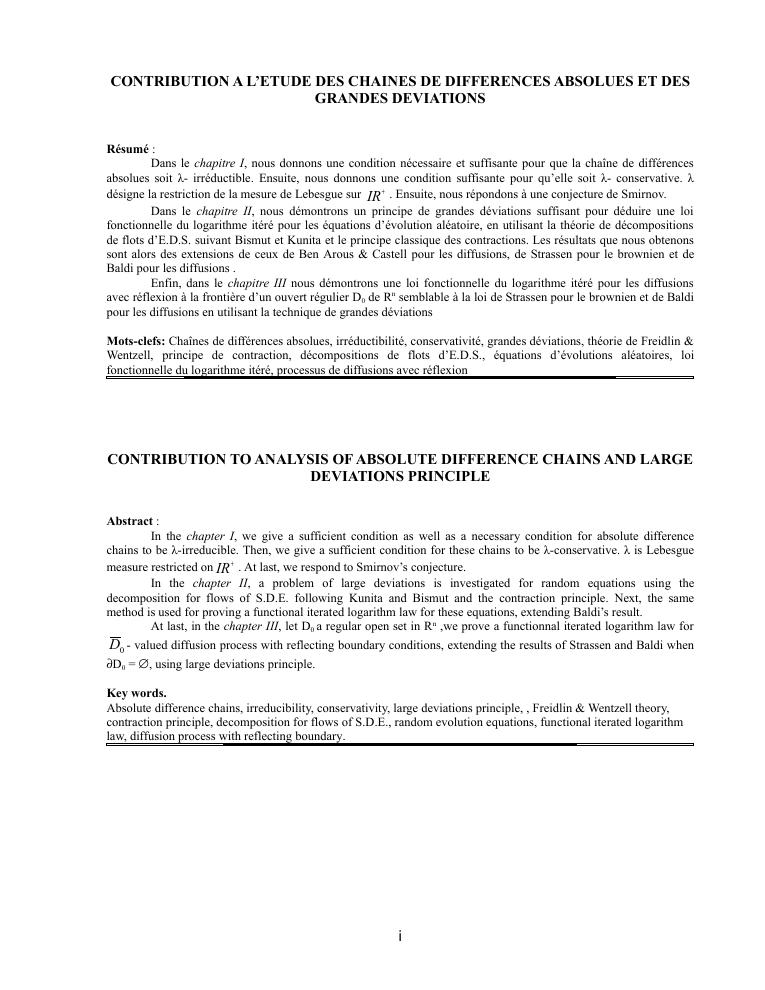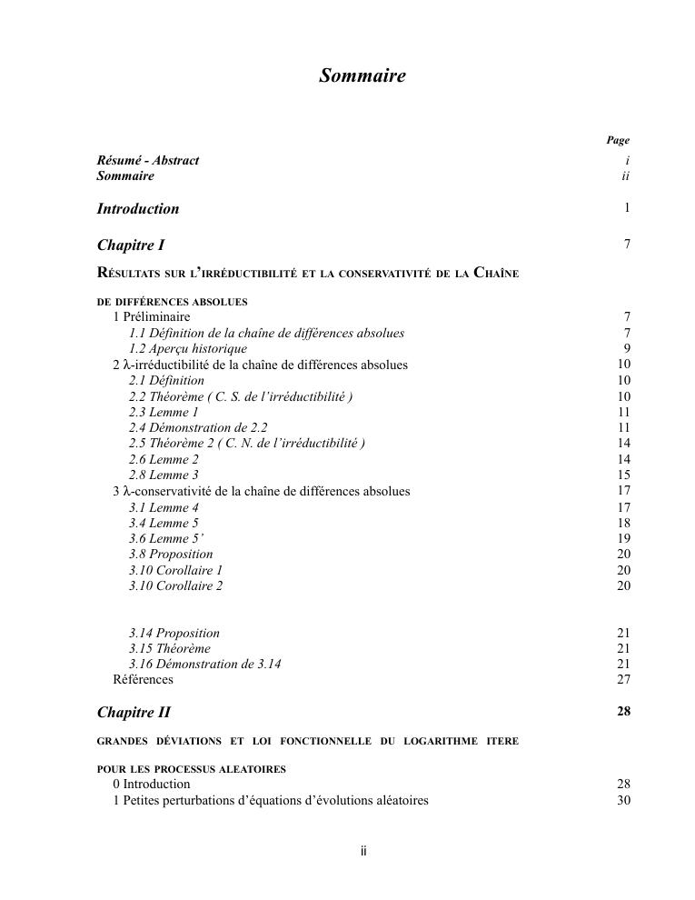 contribution a l'etude des chaines de differences absolues et des grandes deviations