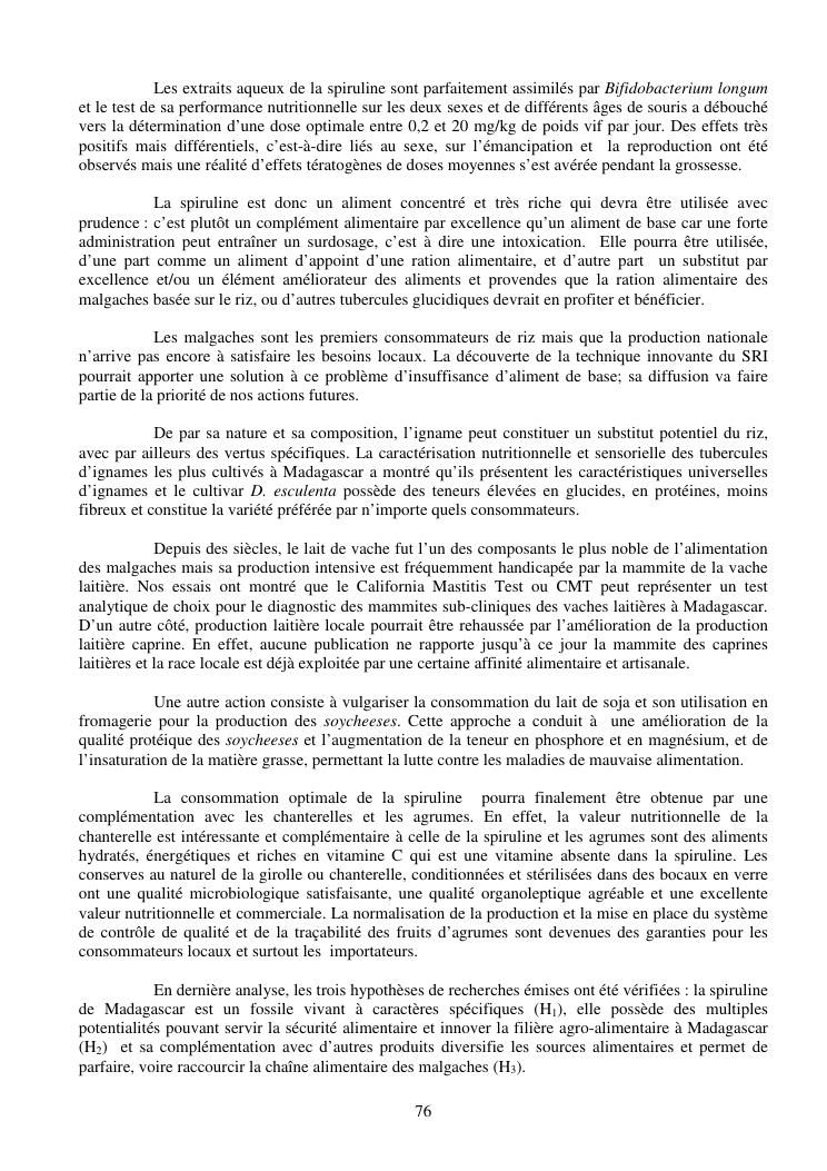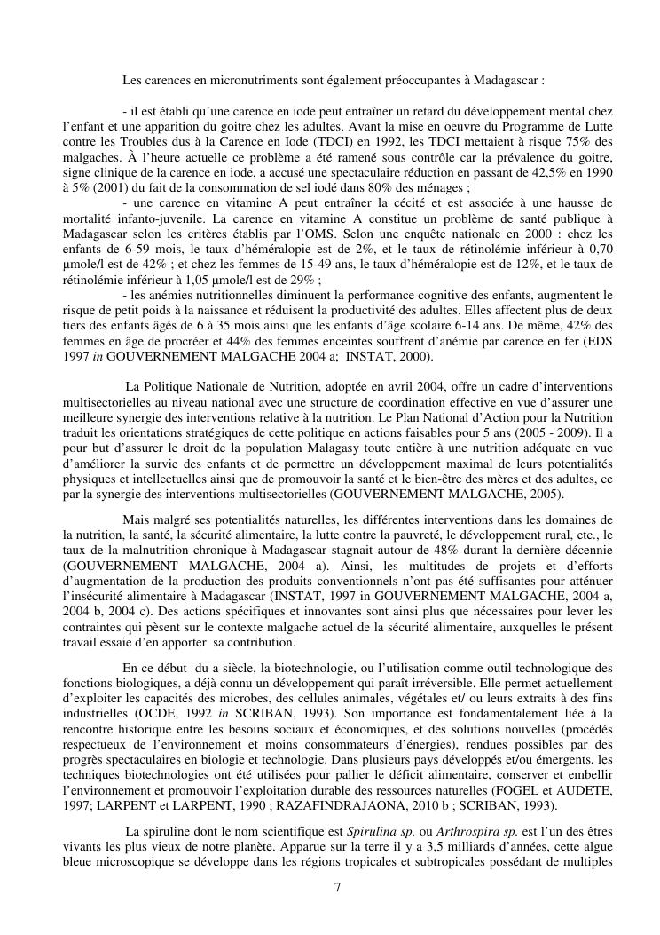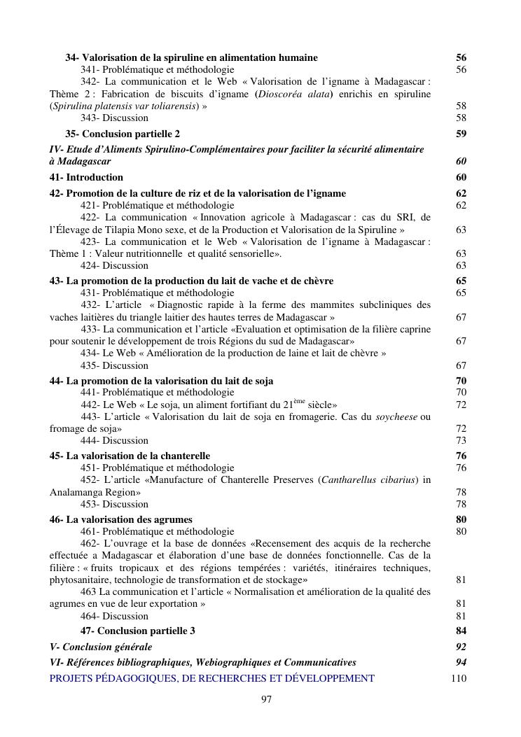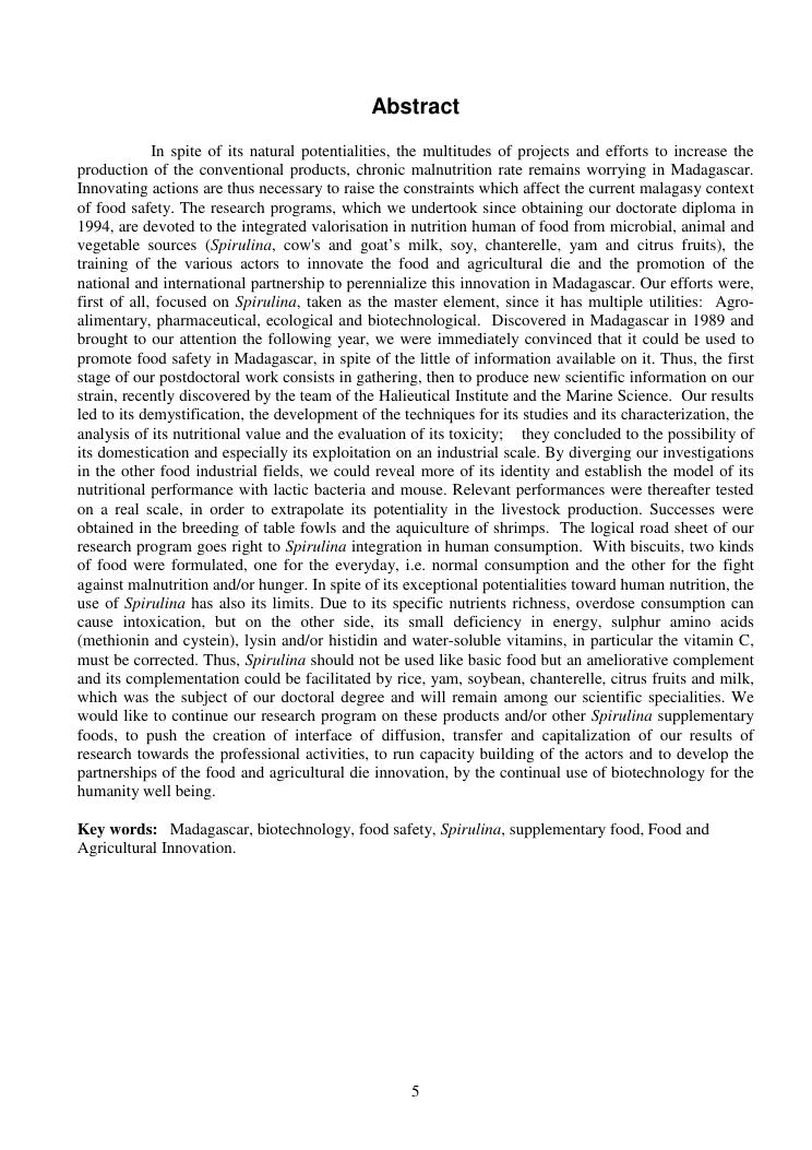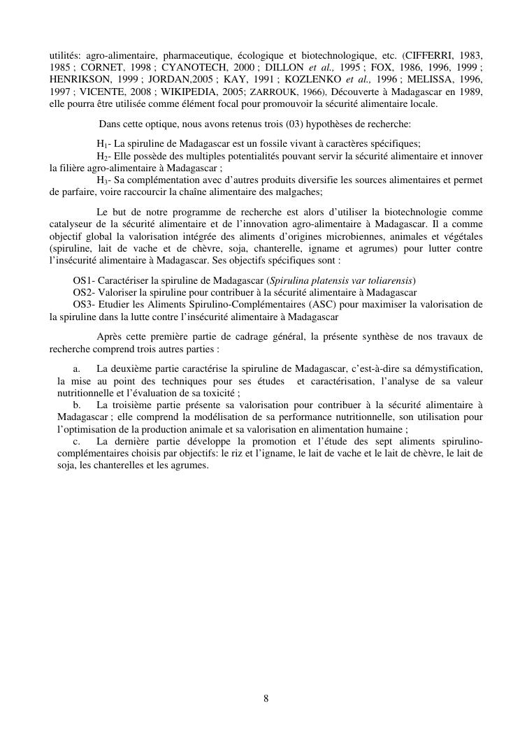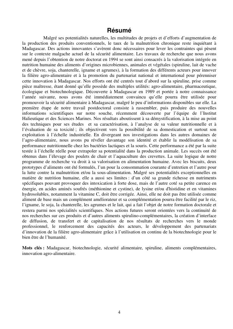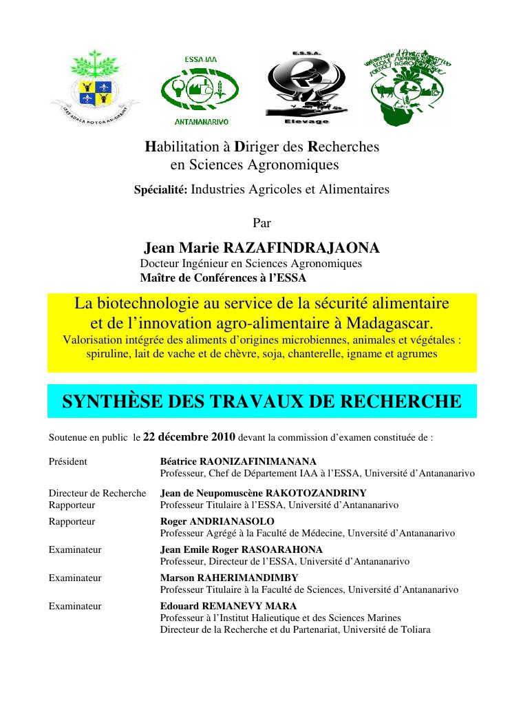 la biotechnologie au service de la sécurité alimentaire et de l'innovation agro-alimentaire à madagascar. valorisation intégrée des aliments d'origines microbiennes, animales et végétales : spiruline, lait de vache et de chèvre, soja, chanterelle, igname et agrumes. synthèse des travaux de recherche