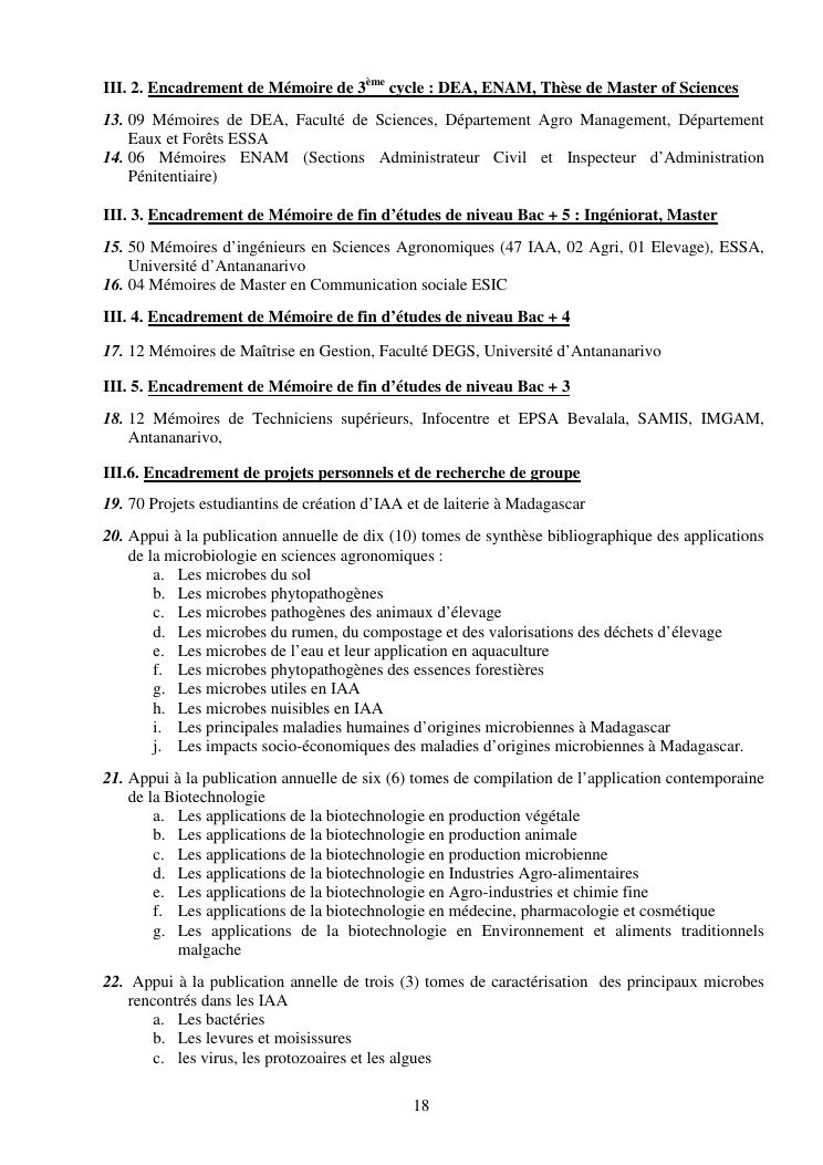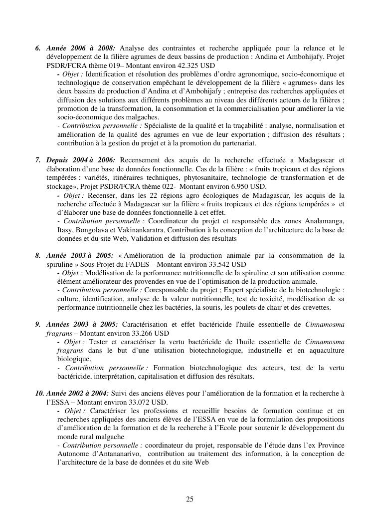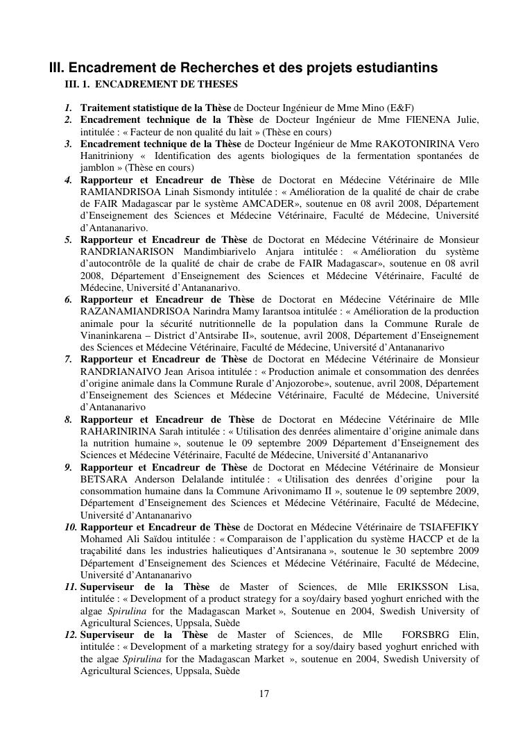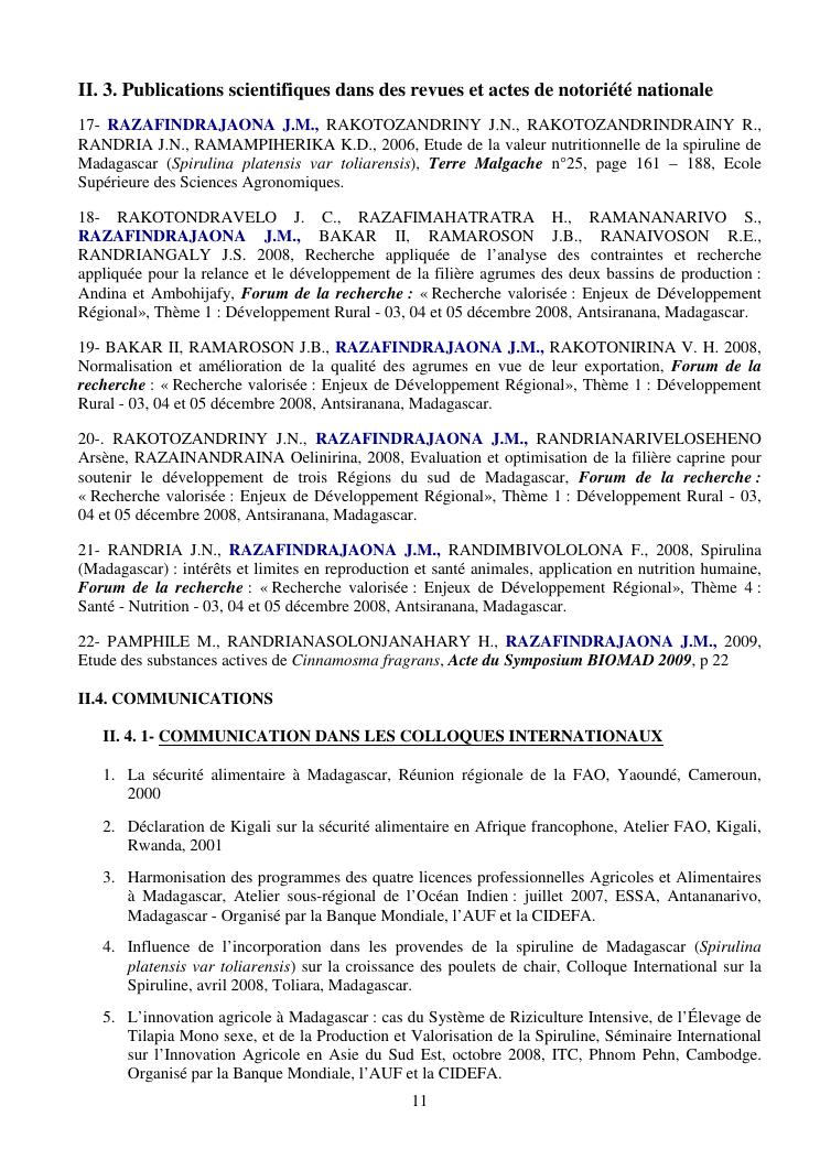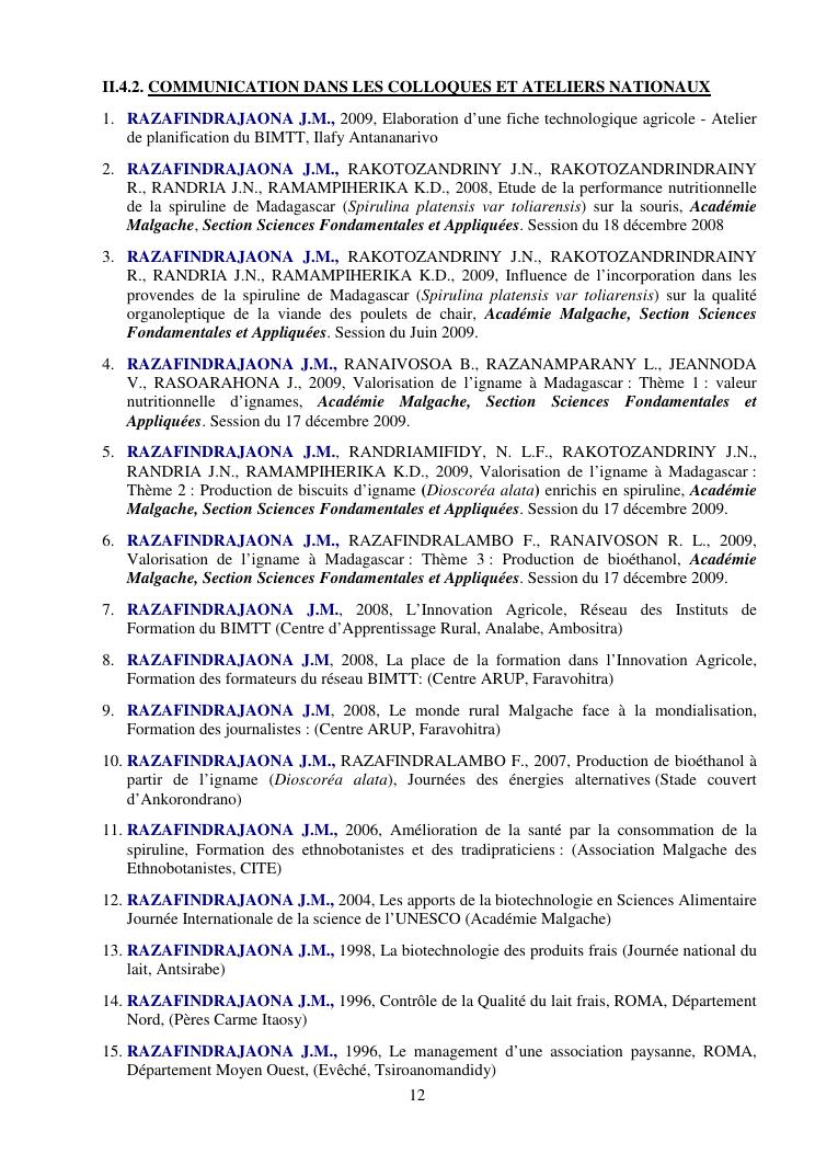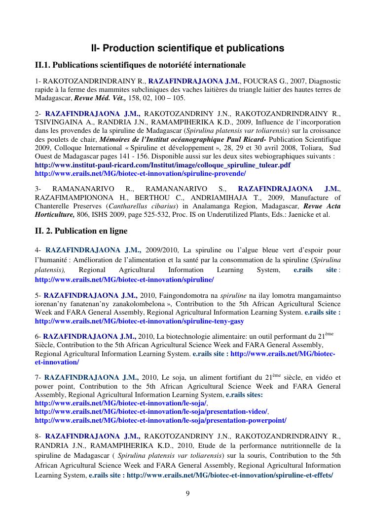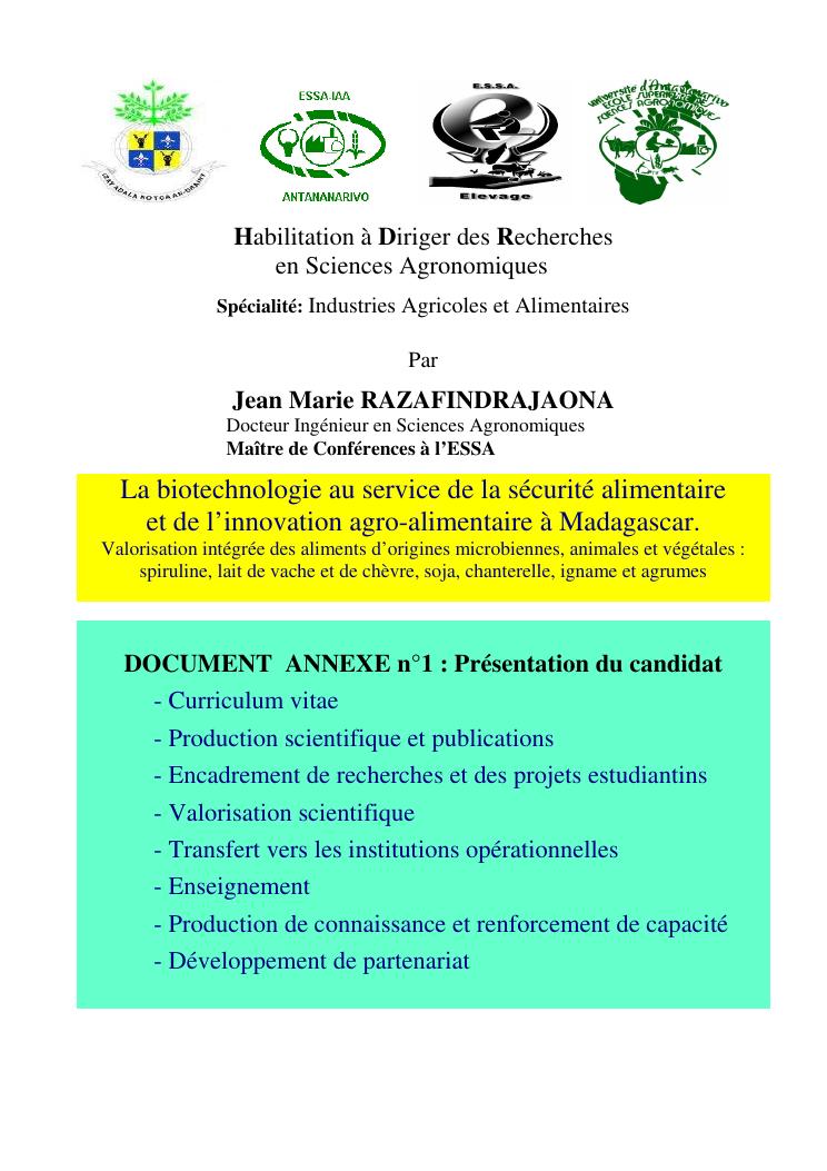 la biotechnologie au service de la sécurité alimentaire et de l'innovation agro-alimentaire à madagascar. valorisation intégrée des aliments d'origines microbiennes, animales et végétales : spiruline, lait de vache et de chèvre, soja, chanterelle, igname et agrumes. document annexe n°1 : présentation du candidat - curriculum vitae - production scientifique et publications - encadrement de recherches et des projets estudiantins - valorisation scientifique - transfert vers les institutions opérationnelles - enseignement - production de connaissance et renforcement de capacité - développement de partenariat