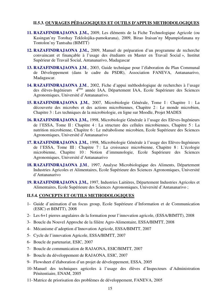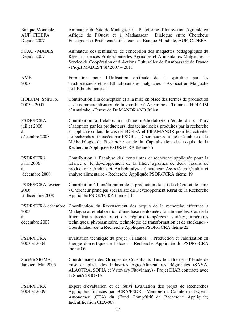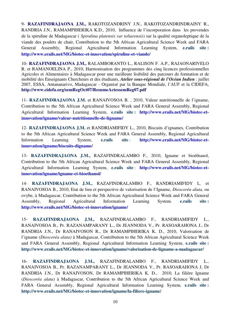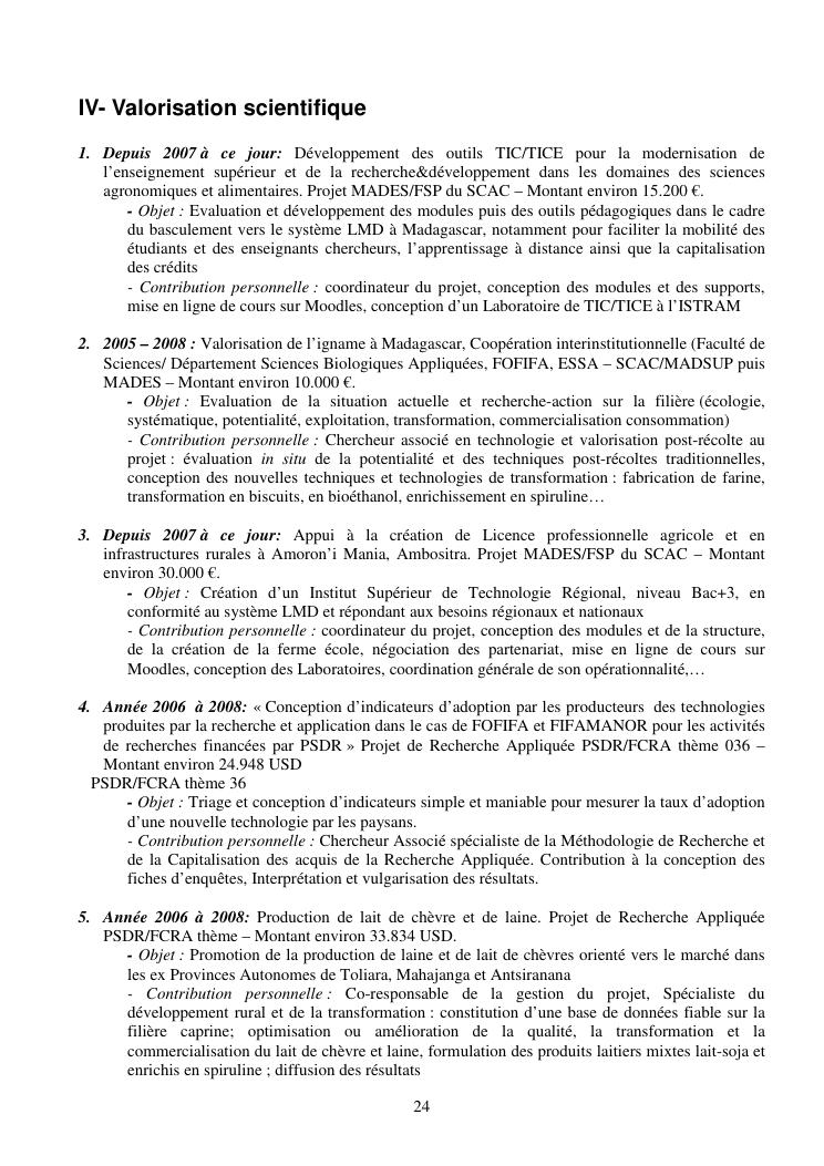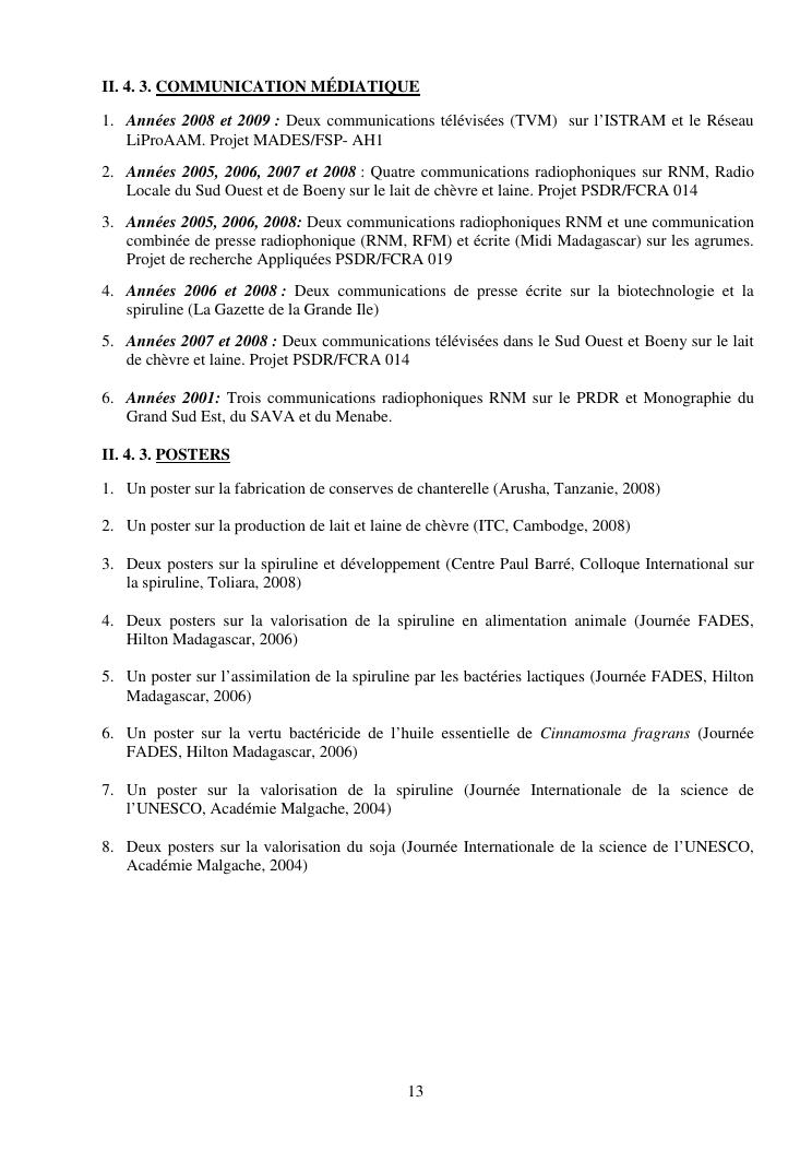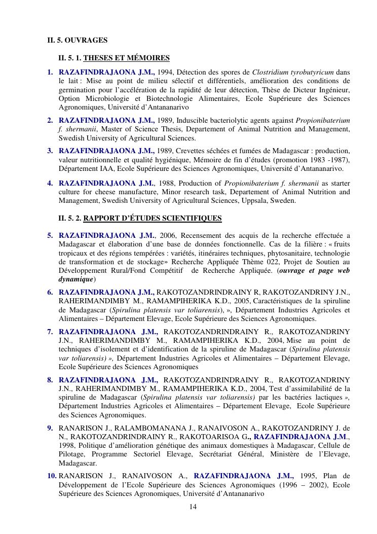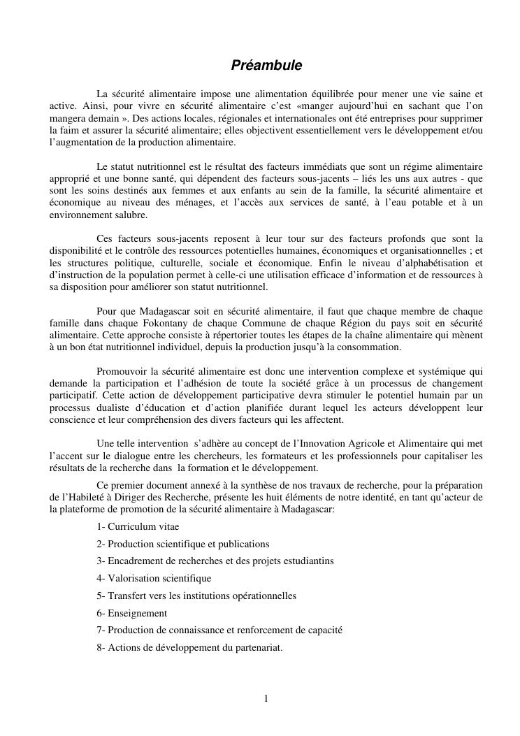 la biotechnologie au service de la sécurité alimentaire et de l'innovation agro-alimentaire à madagascar. valorisation intégrée des aliments d'origines microbiennes, animales et végétales : spiruline, lait de vache et de chèvre, soja, chanterelle, igname et agrumes. document annexe n°1 : présentation du candidat - curriculum vitae - production scientifique et publications - encadrement de recherches et des projets estudiantins - valorisation scientifique - transfert vers les institutions opérationnelles - enseignement - production de connaissance et renforcement de capacité - développement de partenariat