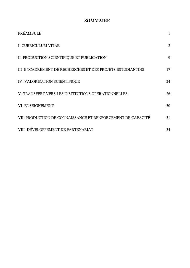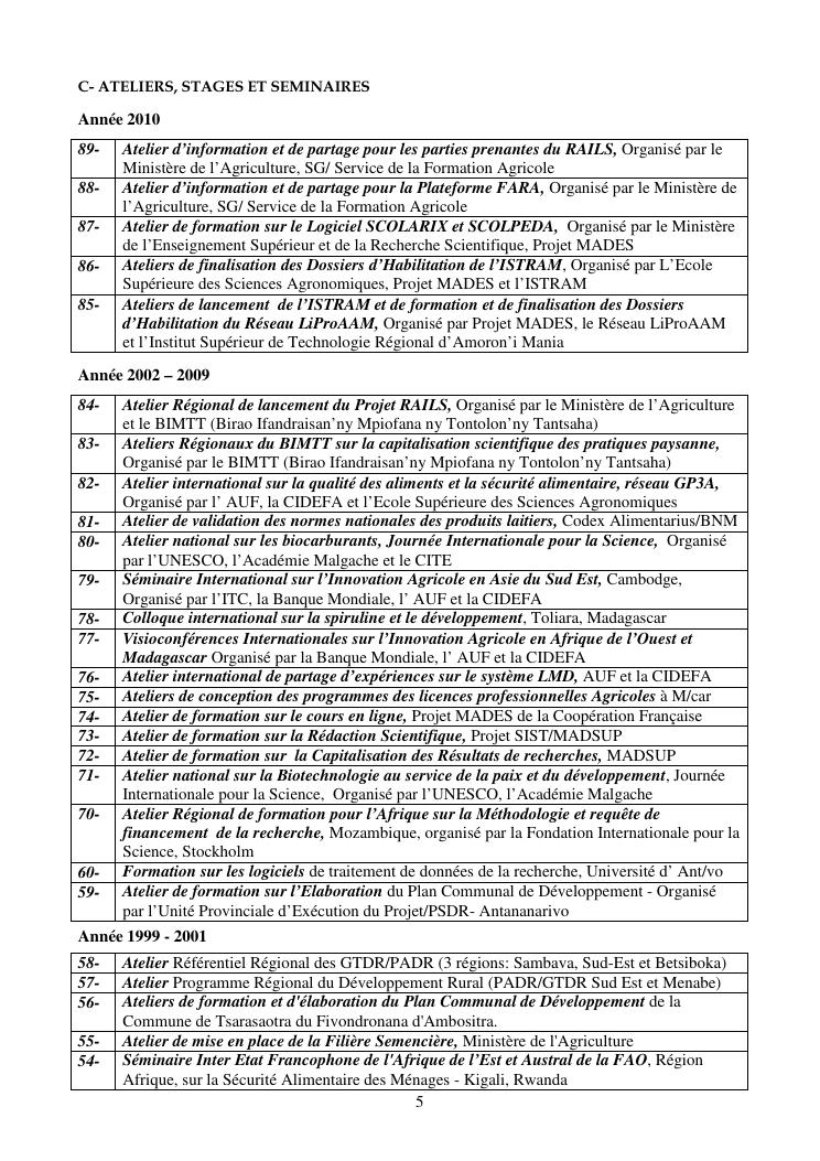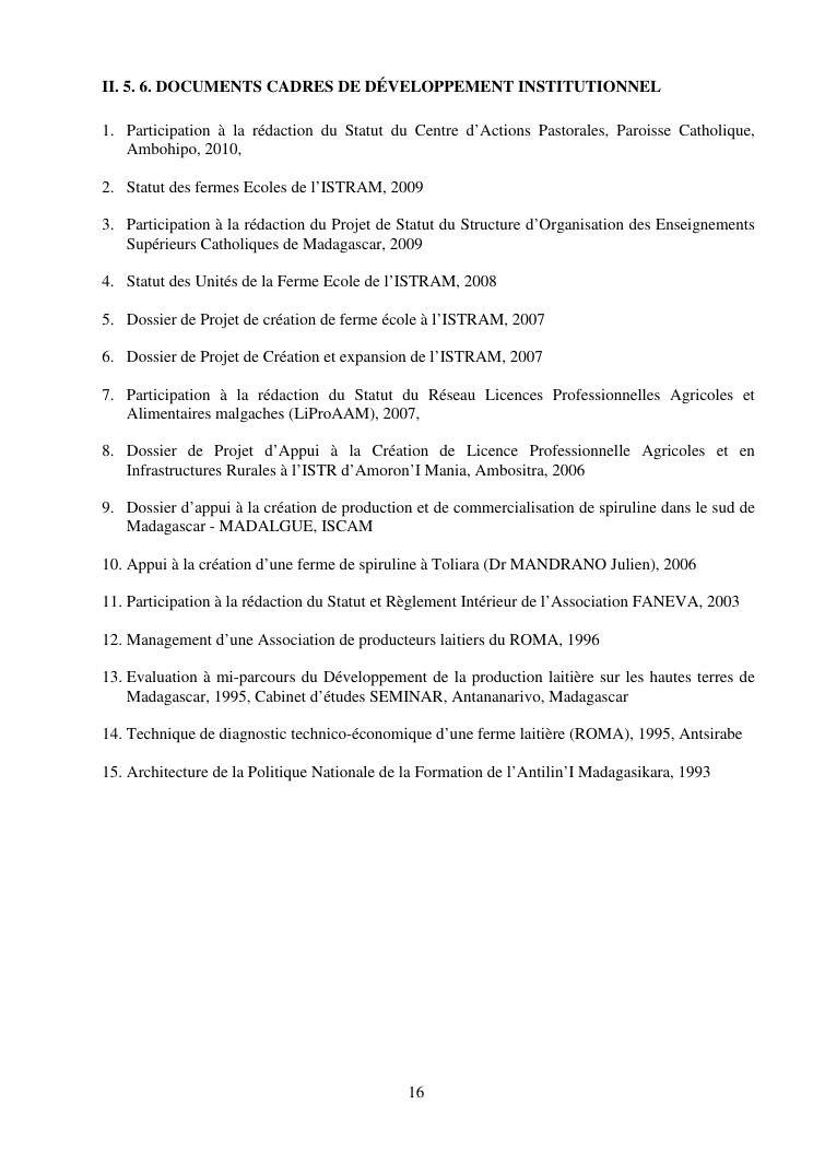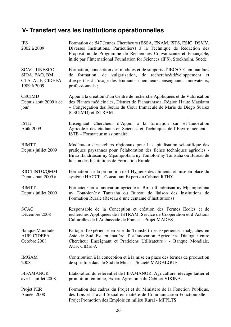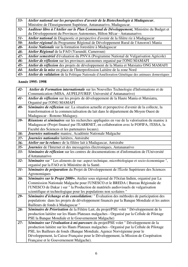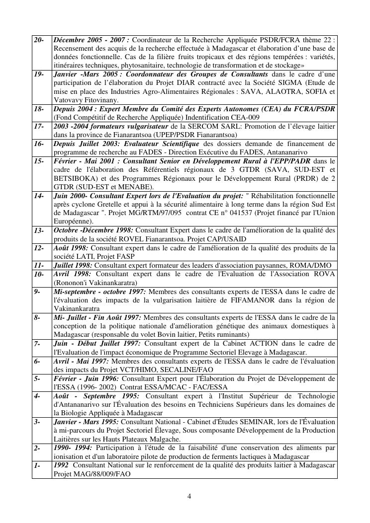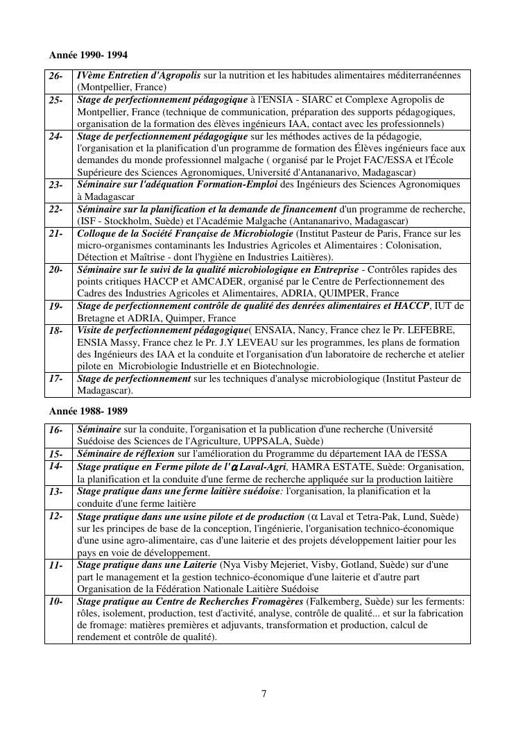 la biotechnologie au service de la sécurité alimentaire et de l'innovation agro-alimentaire à madagascar. valorisation intégrée des aliments d'origines microbiennes, animales et végétales : spiruline, lait de vache et de chèvre, soja, chanterelle, igname et agrumes. document annexe n°1 : présentation du candidat - curriculum vitae - production scientifique et publications - encadrement de recherches et des projets estudiantins - valorisation scientifique - transfert vers les institutions opérationnelles - enseignement - production de connaissance et renforcement de capacité - développement de partenariat